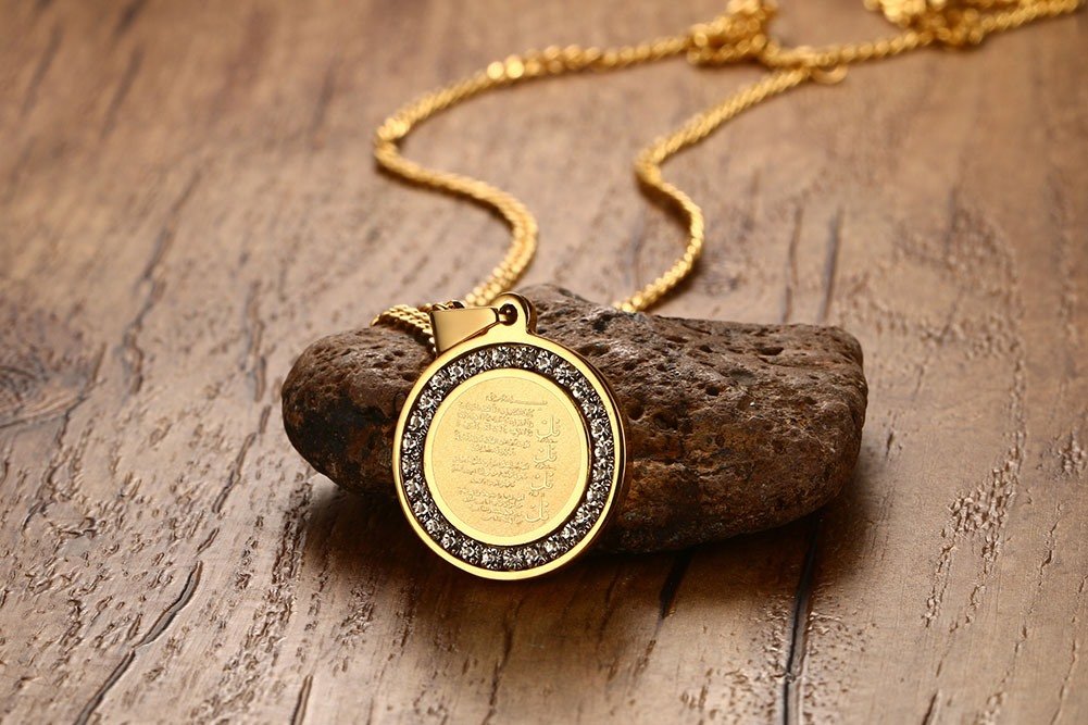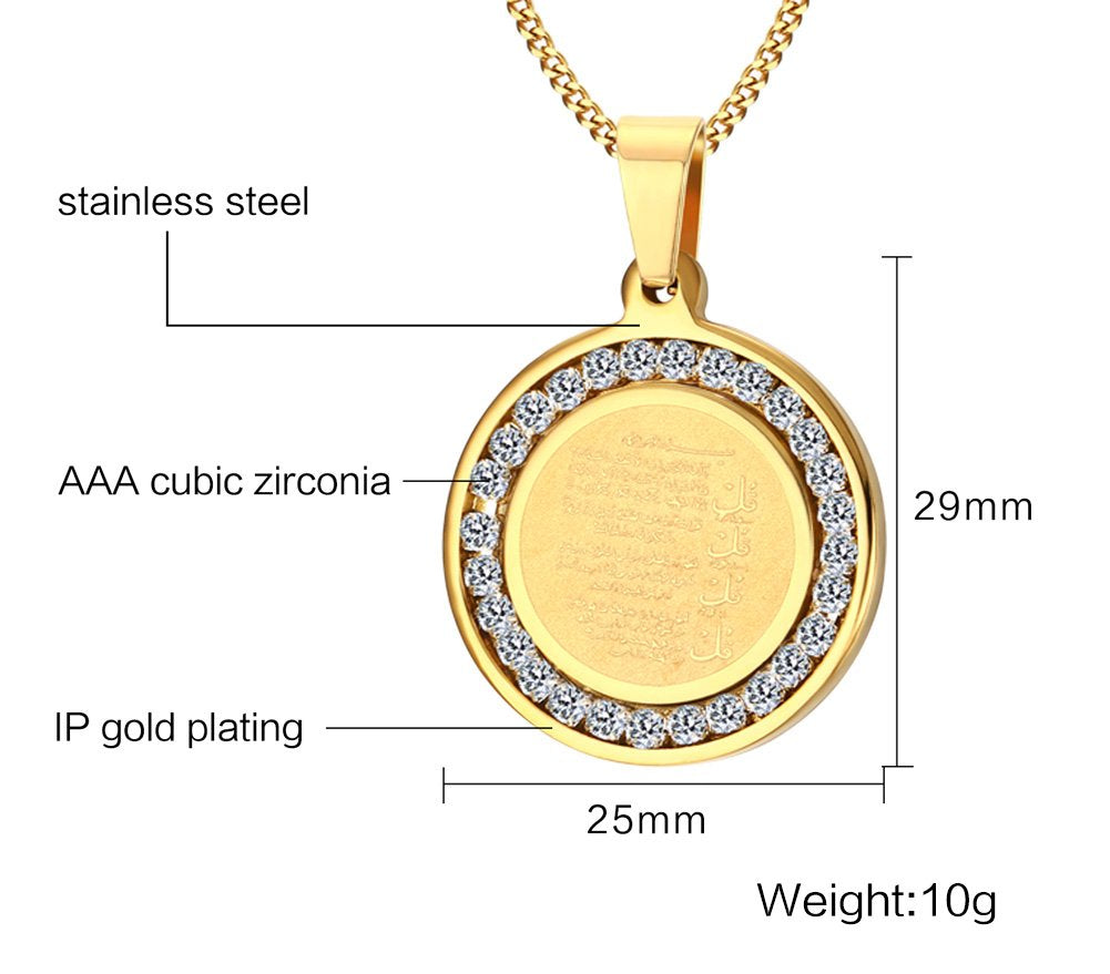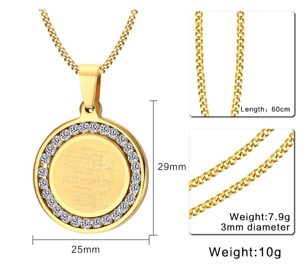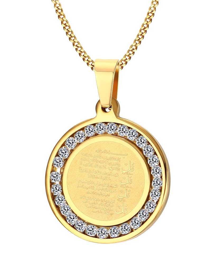 Rockyuの真経ペンダントネックレスは、丸形のゴールドメダルに美しい経文をレーザー刻印。縁には輝くラインストーンがぐるりと並び、荘厳さとラグジュアリーを融合した仕上がりに。