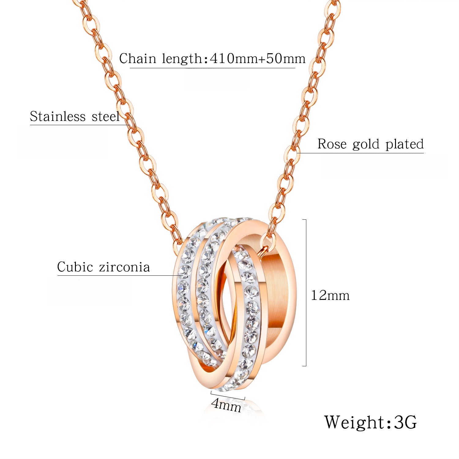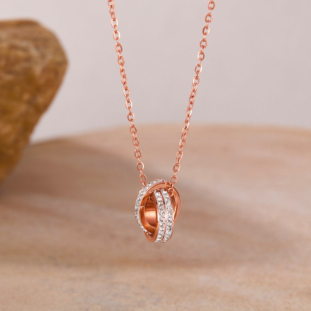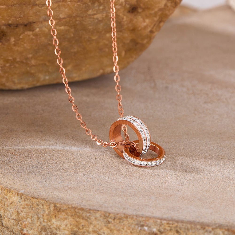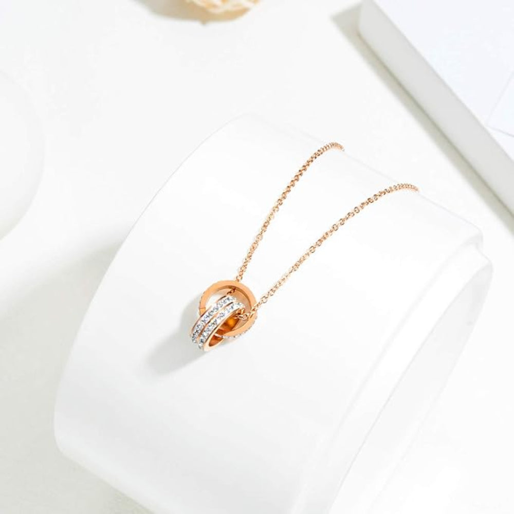 Rockyu ネックレス レディース ピンクゴールド 2連リングペンダント CZ輝石付き