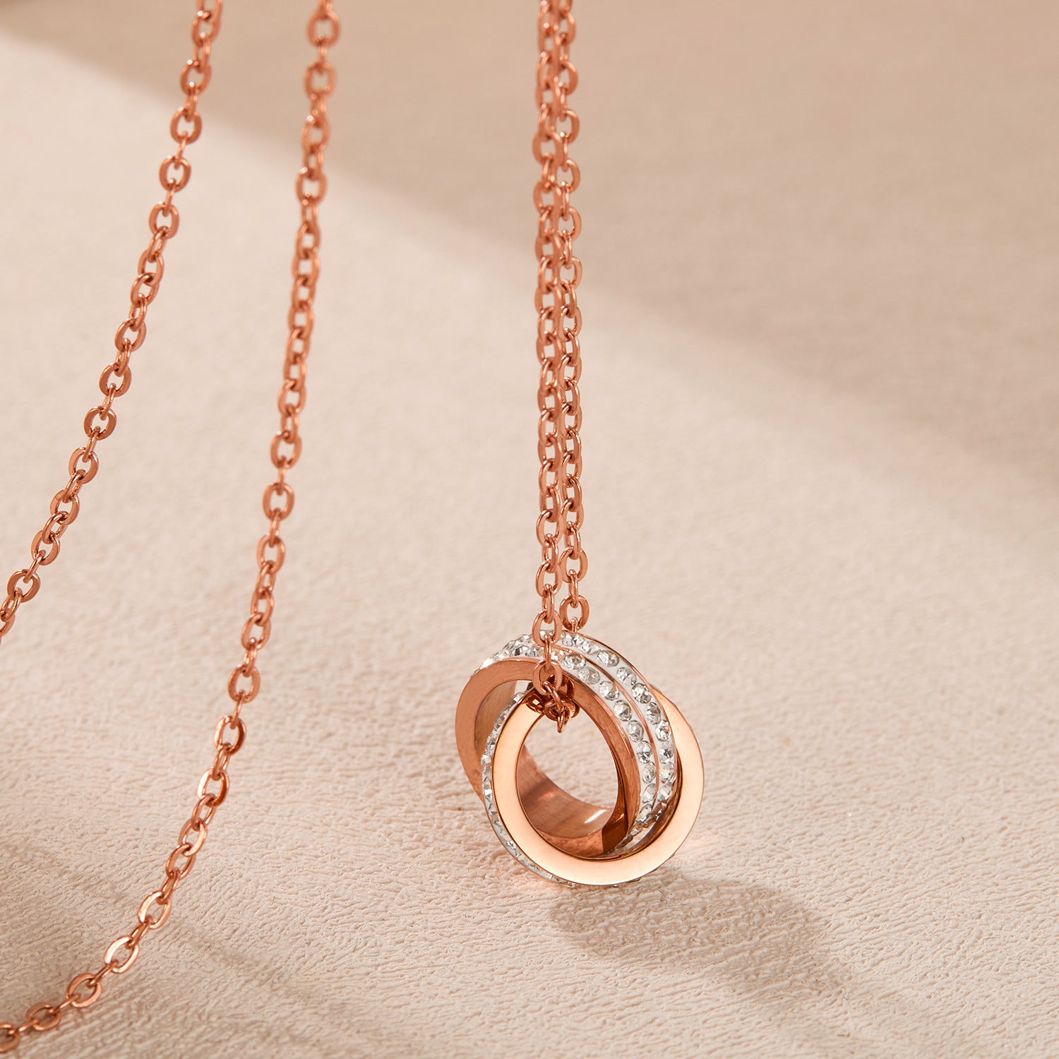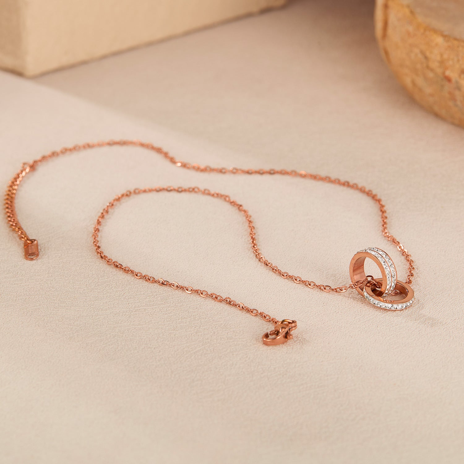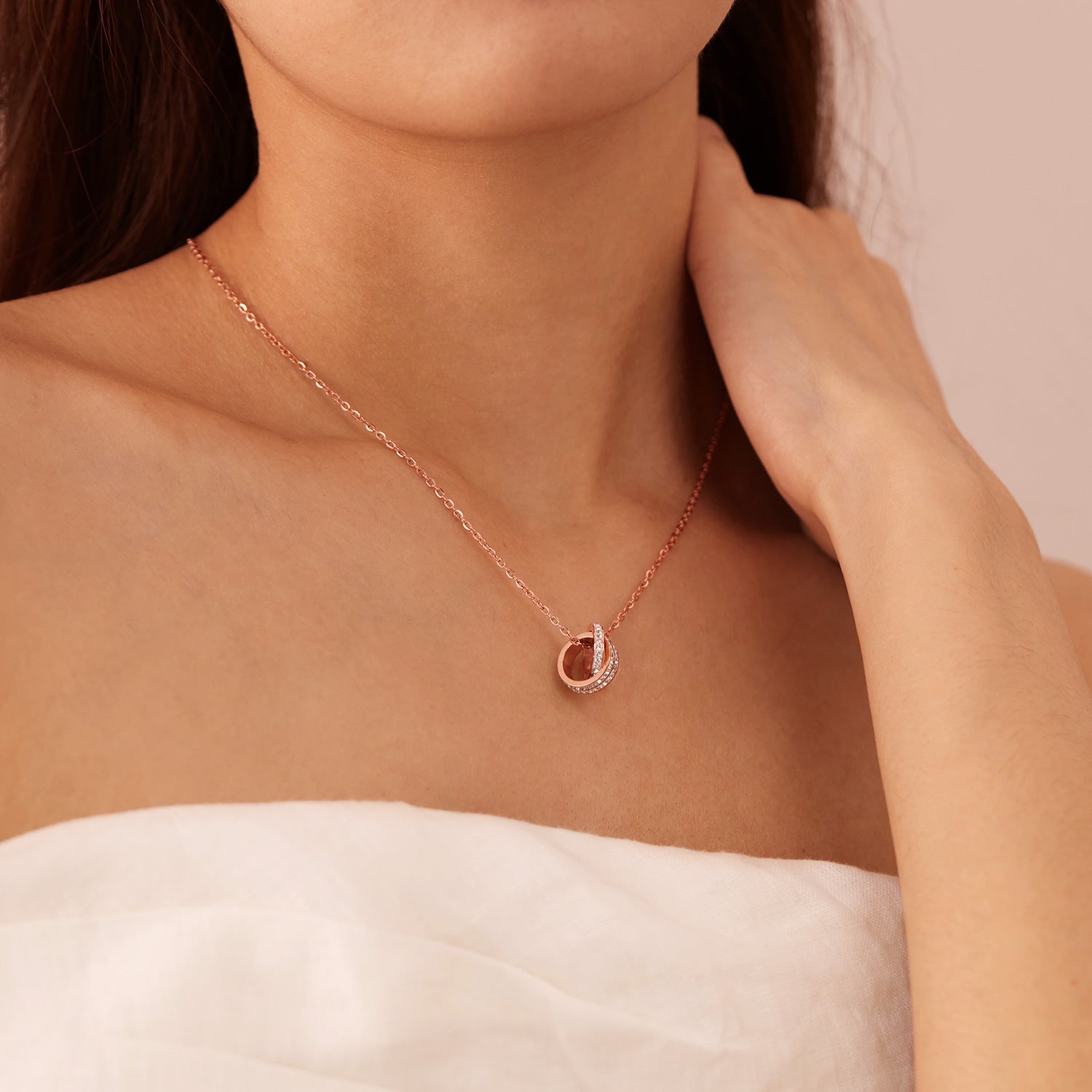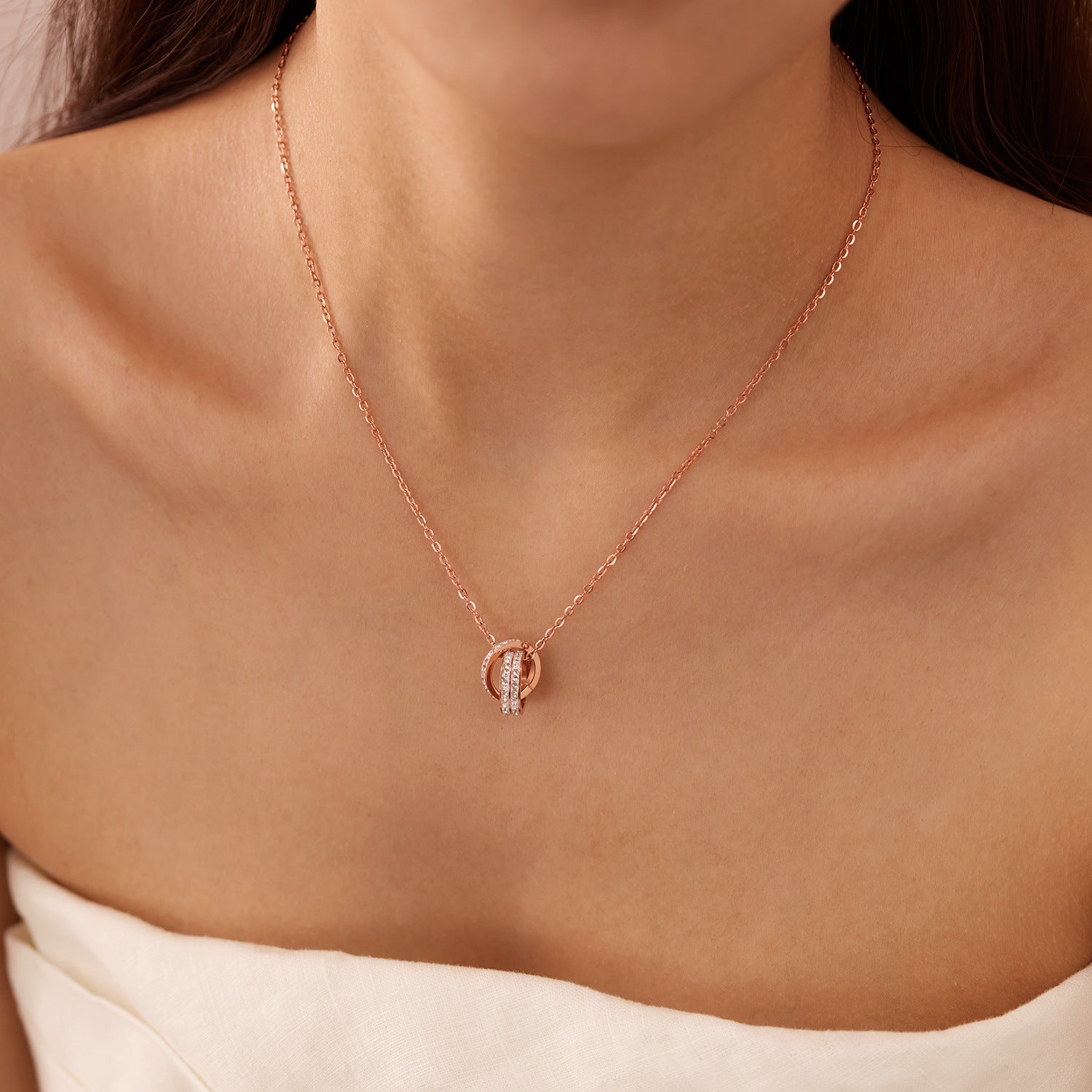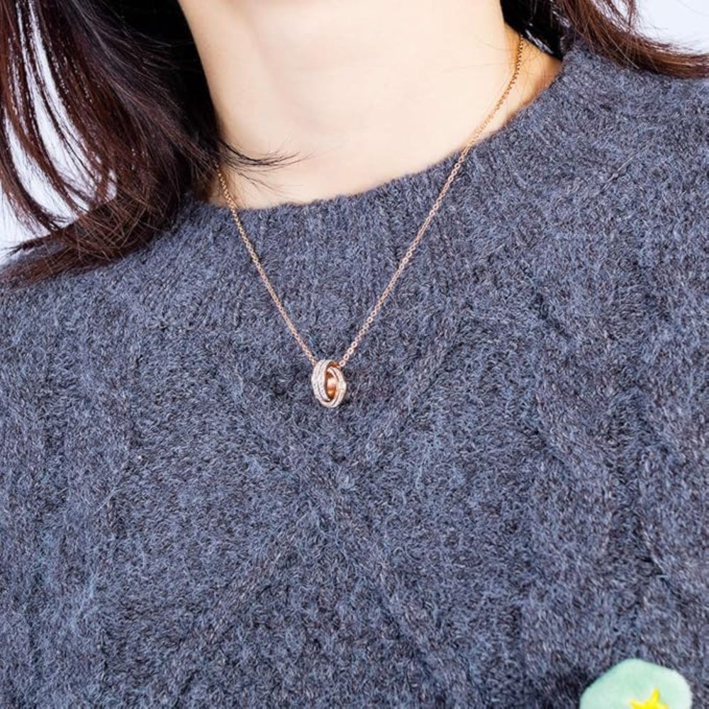 Rockyuの2連リングネックレスで、胸元にエレガンスをひとさじ。ピンクゴールドの柔らかな輝きとキュービックジルコニアの繊細なきらめきが、まるで大人の余裕を映すよう。2つのリングが重なり合い、運命の出会いと絆を象徴するデザインは、シンプルなのに深みのある印象を与えてくれます。