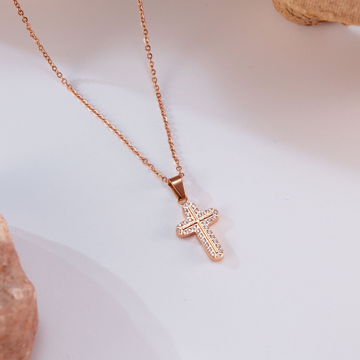 Rockyu が贈る、シンプルで気品漂うクロスネックレス。繊細にカットされたジルコニアが十字架モチーフを華やかに彩り、動くたびに胸元できらめきます。チェーンは約44cm+6cmのアジャスター付きで、お好きな長さに調整可能。軽量2.8gと、まるで何もつけていないかのような軽やかさも魅力。金属アレルギーに配慮したステンレス素材で、敏感肌の方にも安心。カラーはローズゴールド・シルバー・ゴールドの3色展開で、スタイルに合わせて選べます。Rockyu のこだわりが詰まったこのネックレスは、日常にもフォーマルにも、そして大切な人へのクリスマスや記念日のギフトにもぴったり。十字架があなたの胸元で静かに語りかける、そんな特別なアクセサリーです。