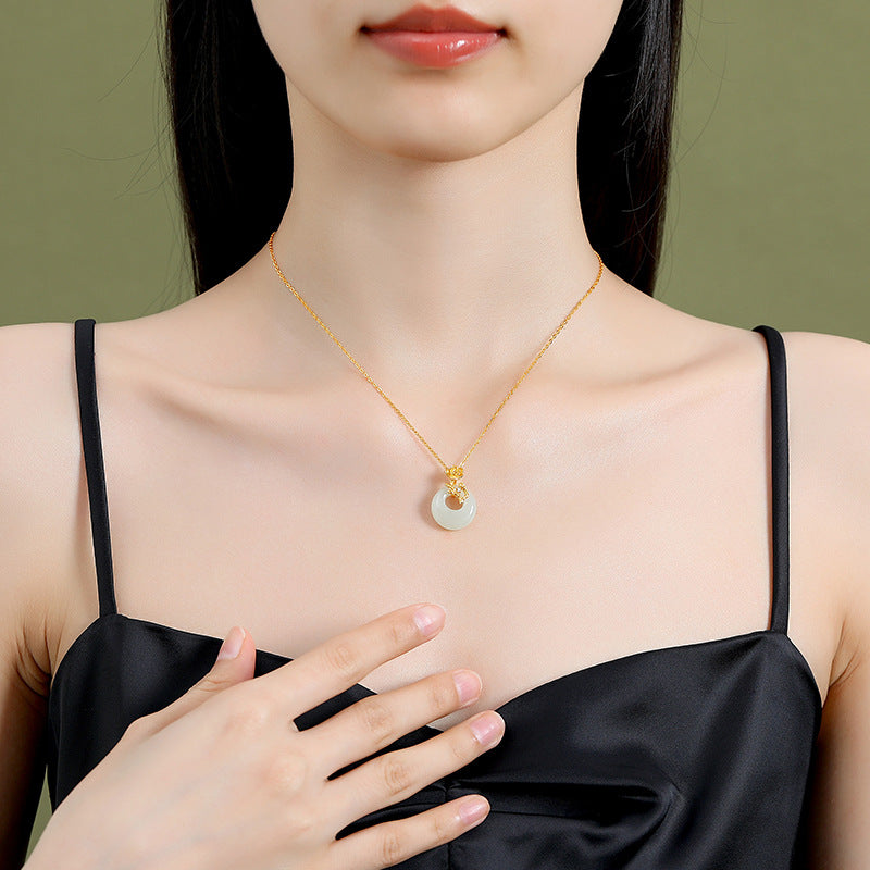 運気も気分もぐいっと上げてくれる、Rockyuの円型ネックレス。まるで満月のように優しく輝くホワイトジェイド(白玉)に、繊細な金花モチーフが添えられた上品なデザイン。18金メッキのチェーンと組み合わせることで、控えめなのに目を惹く仕上がりに。落ち着きと華やかさを同時にまとえる、まさに“大人のためのお守りジュエリー”。
