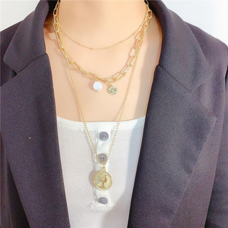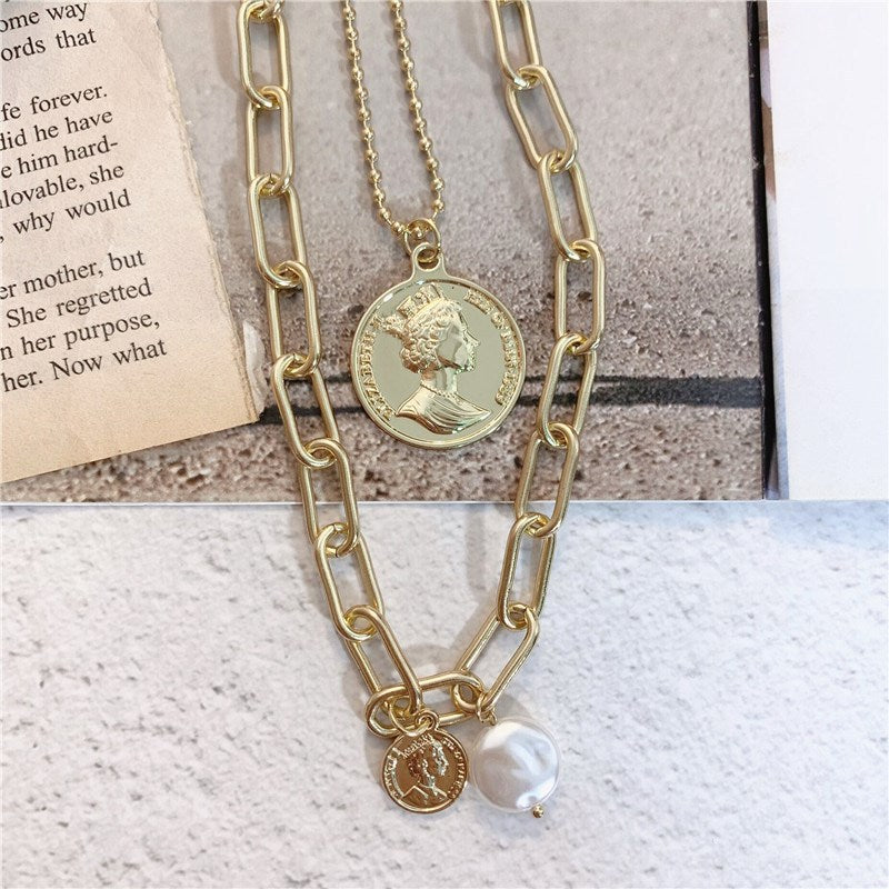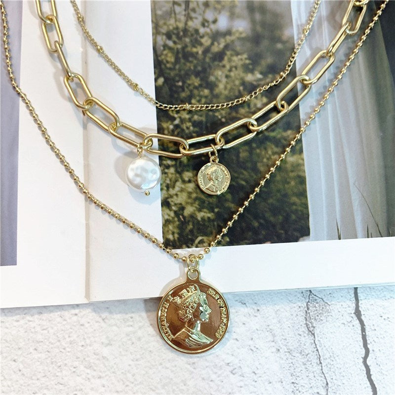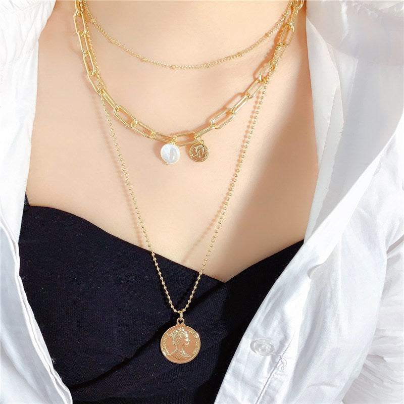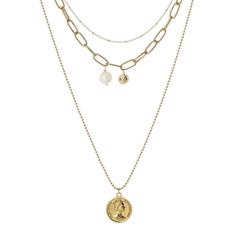 Rockyu ネックレス レディース ゴールド 18金仕上げ 三連チェーン コインネックレス パールペンダント ステンレス 金属アレルギー対応 ファッションアクセサリー