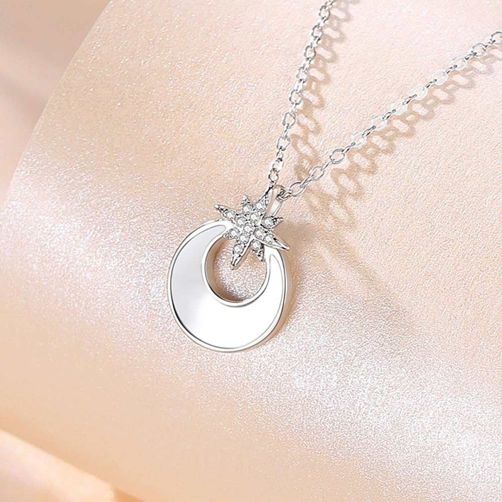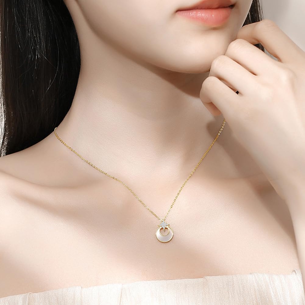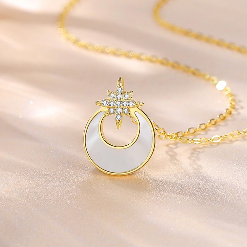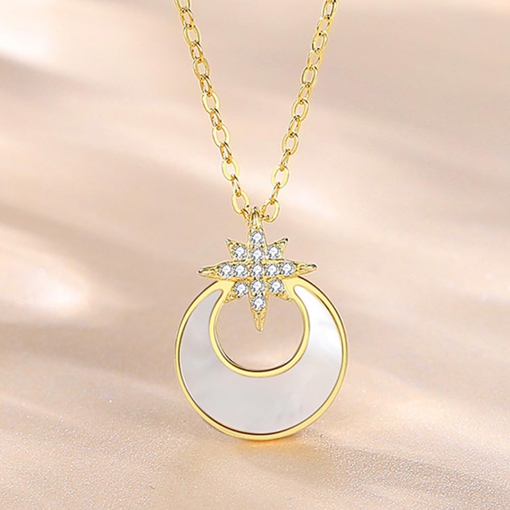 Rockyu ネックレス レディース 月と星 CZ 白蝶貝 ゴールド ステンレス ペンダント