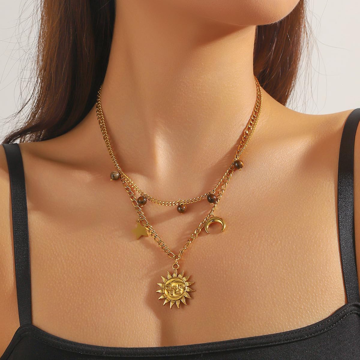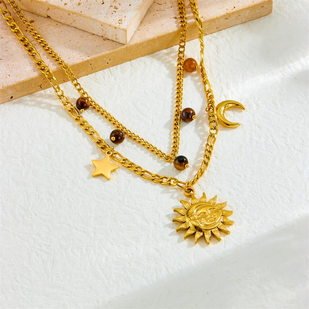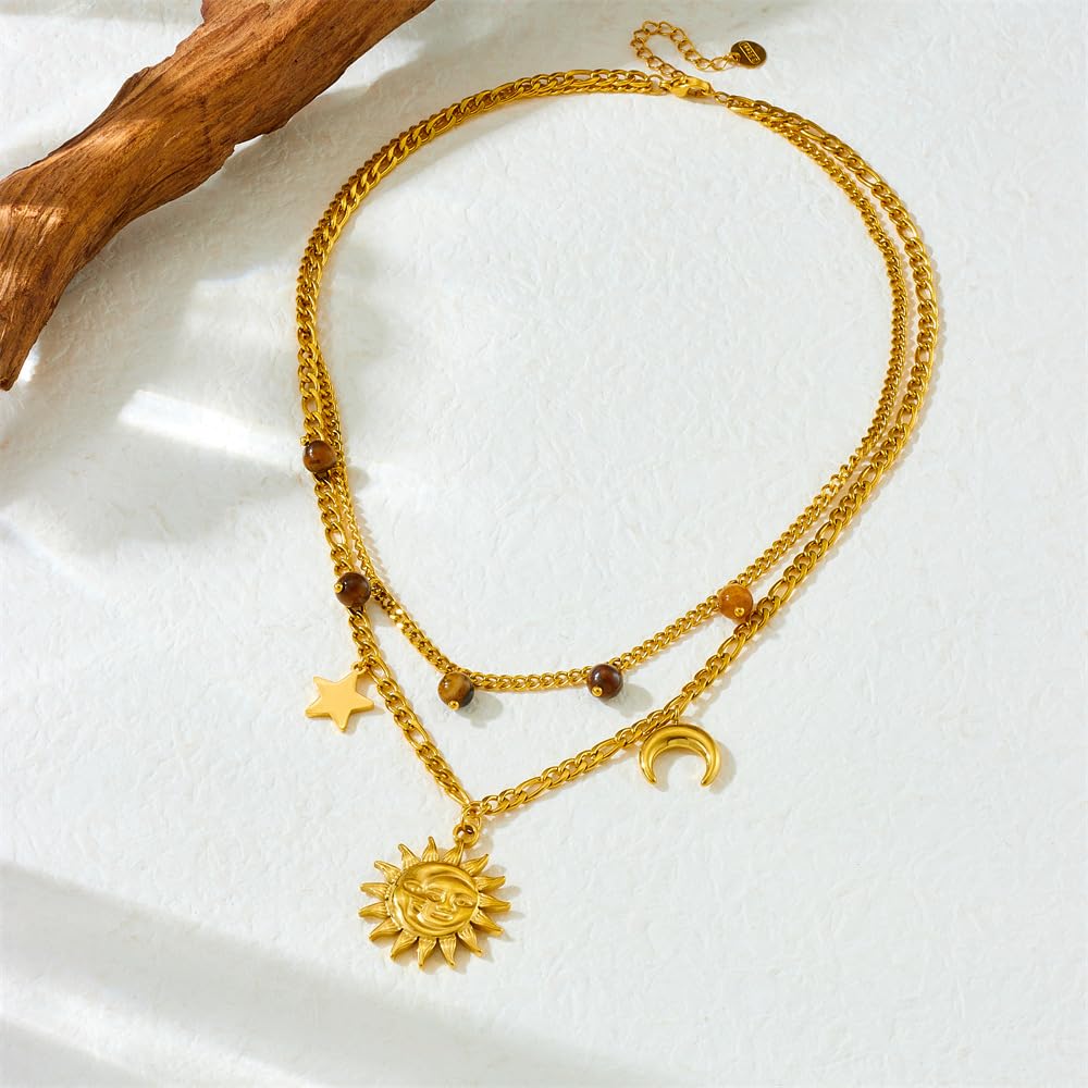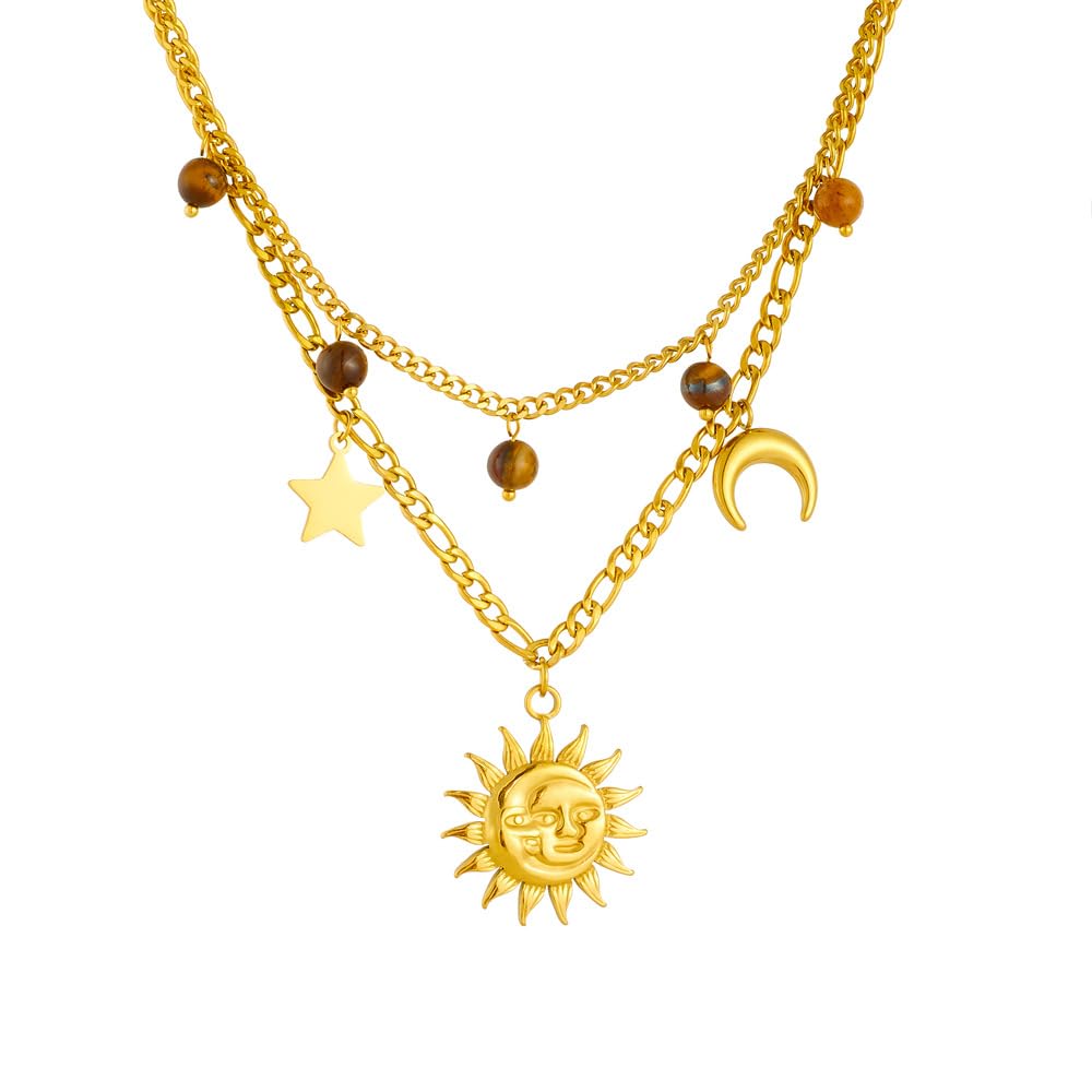 Rockyu 太陽と月の2連ネックレス ゴールド ステンレス 星チャーム付き