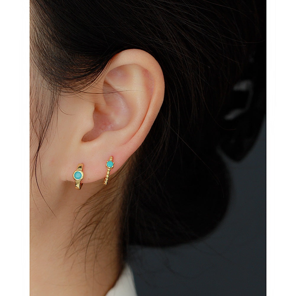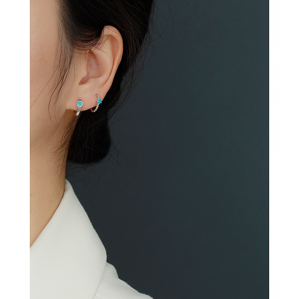 純銀素材を使用し、金属アレルギーにも配慮した安心設計。程よい存在感のターコイズストーンが、肌のトーンを引き立ててくれるのもポイント。カジュアルにもきれいめにもマッチする万能アイテムで、軟骨やセカンドピアスとしての重ね付けにもぴったり!