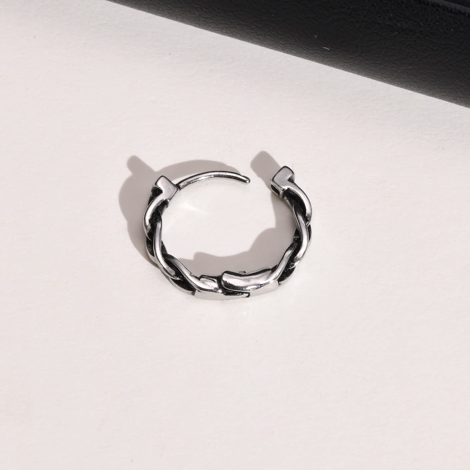 さりげないひねりが男の耳元を一層クールに見せる、Rockyu メンズ シルバー ツイスト フープピアス。立体的に交差するツイストデザインは、シンプルでありながら存在感を放ち、スタイルを格上げしてくれる一本です。
