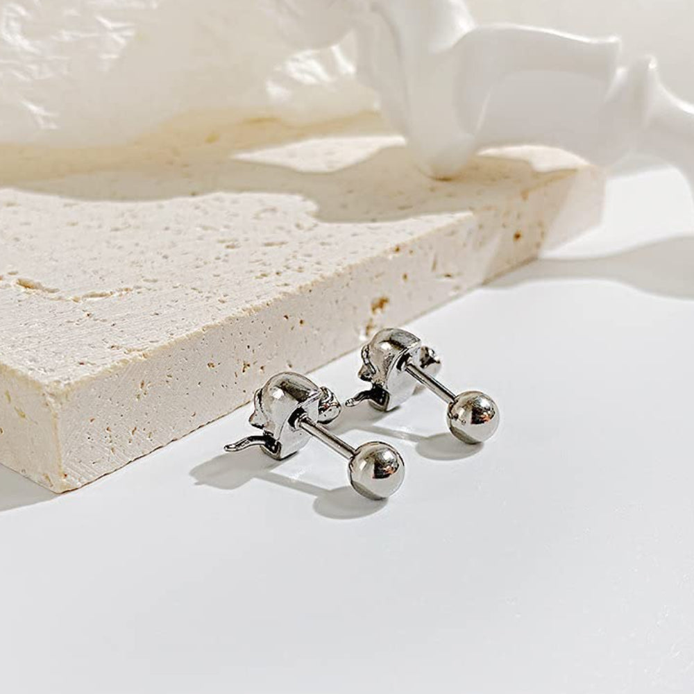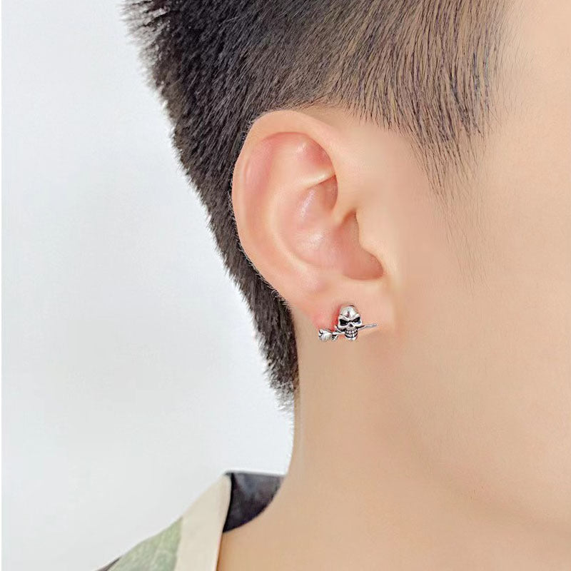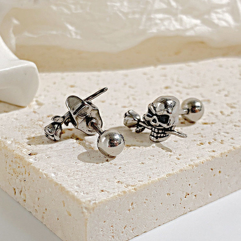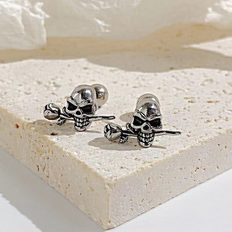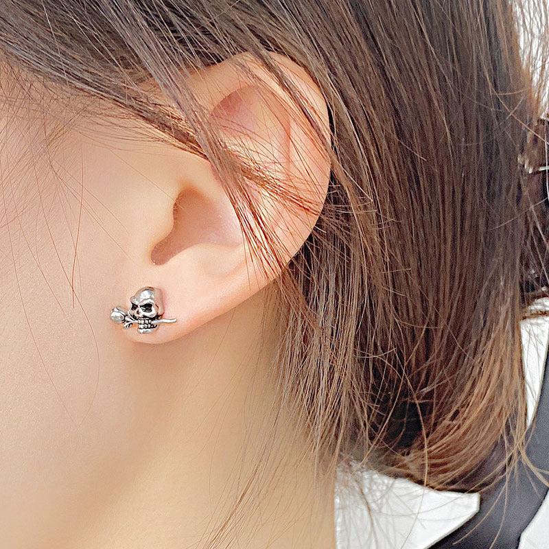 Rockyu が贈る、存在感抜群のスカルデザインピアス。髑髏が花をくわえたユニークなモチーフは、ちょっとダークでありながらどこかユーモラス。シルバーの輝きが耳元に映え、シンプルなコーデにも個性的なアクセントをプラスします。