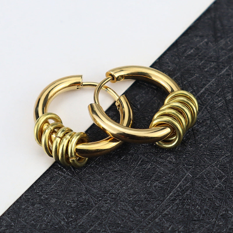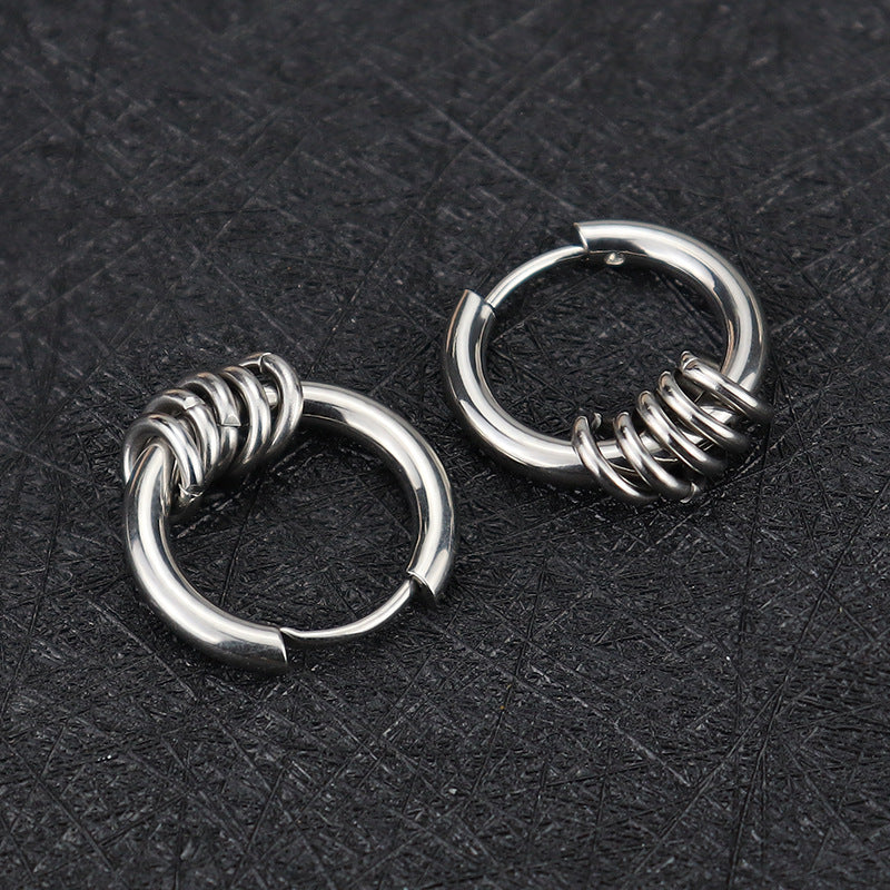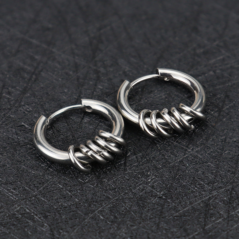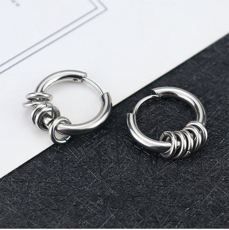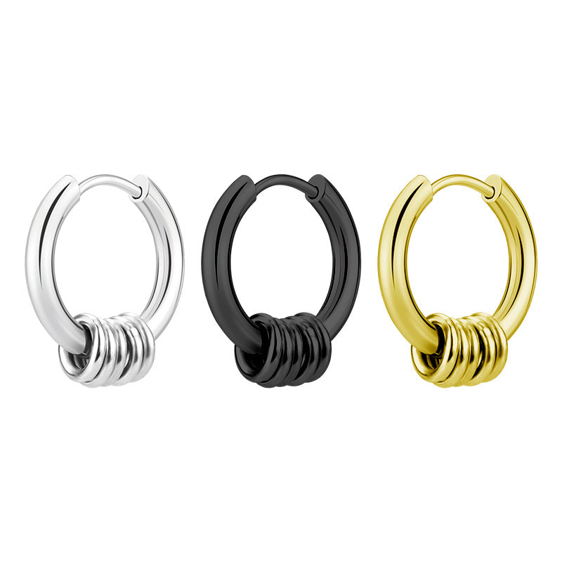 Rockyu が提案する、シンプルでスタイリッシュなメンズフープピアス。程よい存在感のある円形デザインに小さなリングがアクセントとして施され、シンプルながら遊び心を感じさせる仕上がりです。シルバー・ゴールド・ブラックの3色展開で、その日のファッションや気分に合わせて選べるのも魅力。