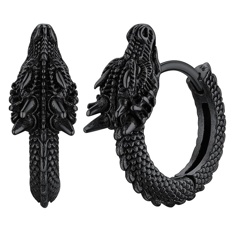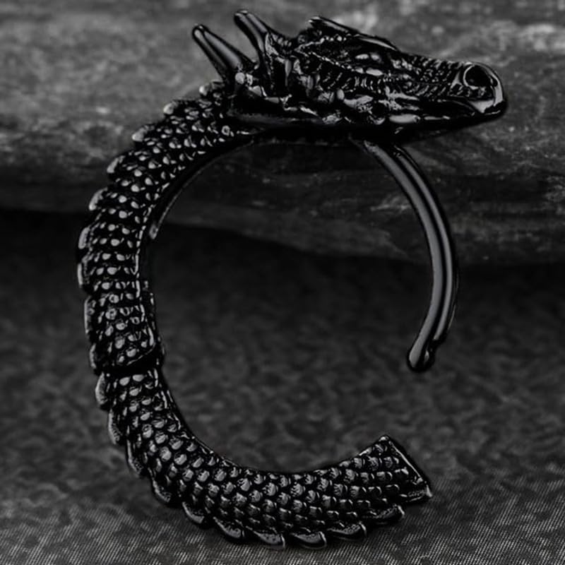 Rockyu が贈る、耳元で龍が舞うような存在感あふれる「ドラゴンフープピアス」。金・銀・黒の3色展開で、気分やコーデに合わせて自在にチョイス可能。龍のうろこや瞳まで細密に表現された造形は、まるで耳に飾る小さな芸術品。カジュアルスタイルにアクセントを加えるのはもちろん、ドレスアップにも映える万能アイテム。Rockyu の遊び心と洗練されたデザインが、あなたの毎日に神話のエッセンスをプラスします。