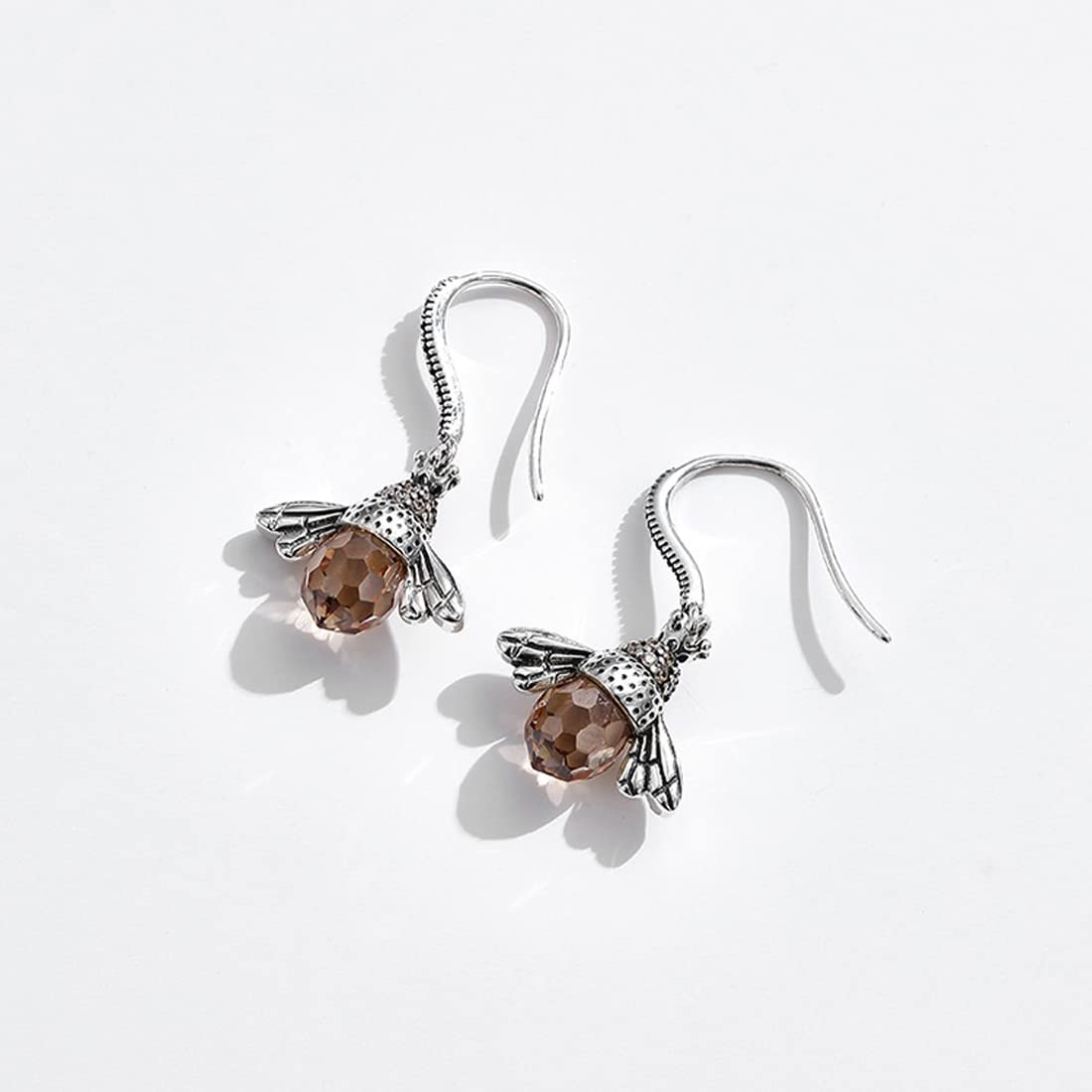 耳元に遊び心とラグジュアリーを添える、Rockyu のミツバチモチーフピアス。シルバー925をベースに、王冠をのせた愛らしいデザインと、オレンジカラーのオーストリアクリスタルが煌めくユニークな仕上がり。キュービックジルコニアが上品に輝き、昆虫モチーフながらも大人っぽく身につけられるデザインです。