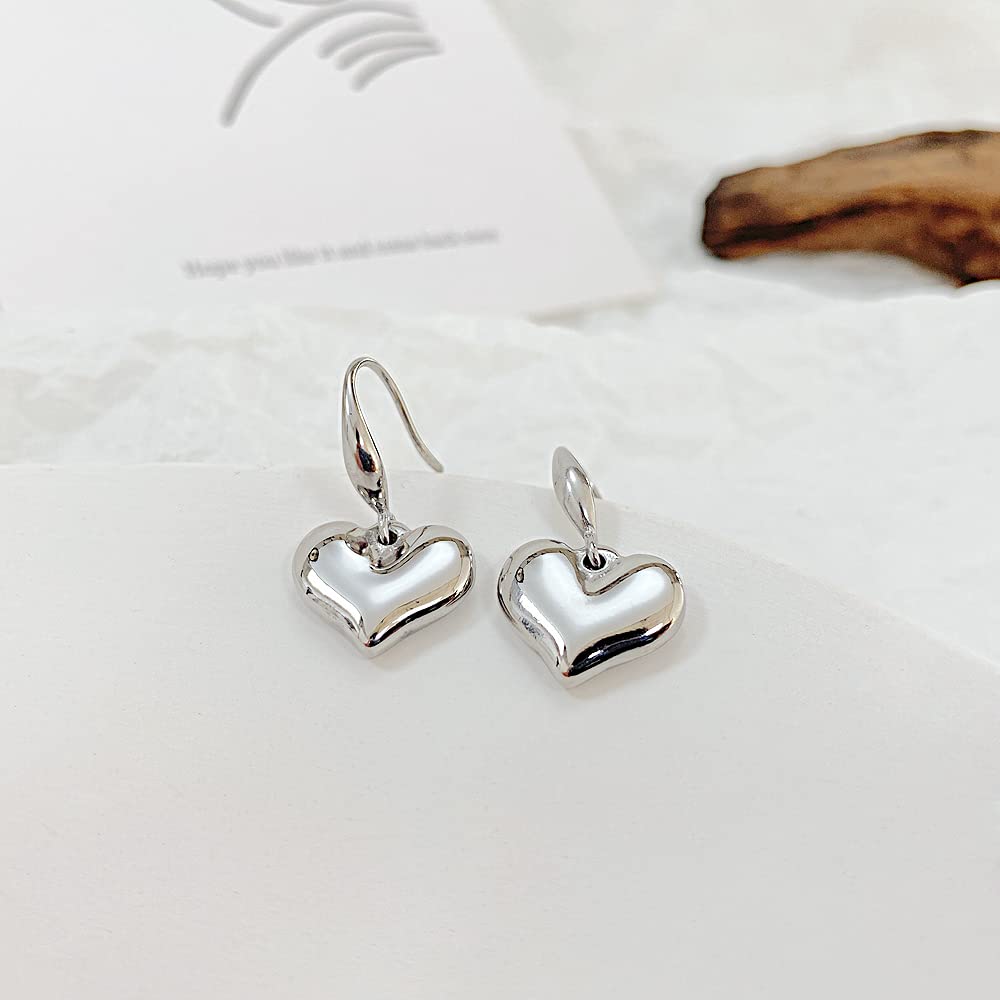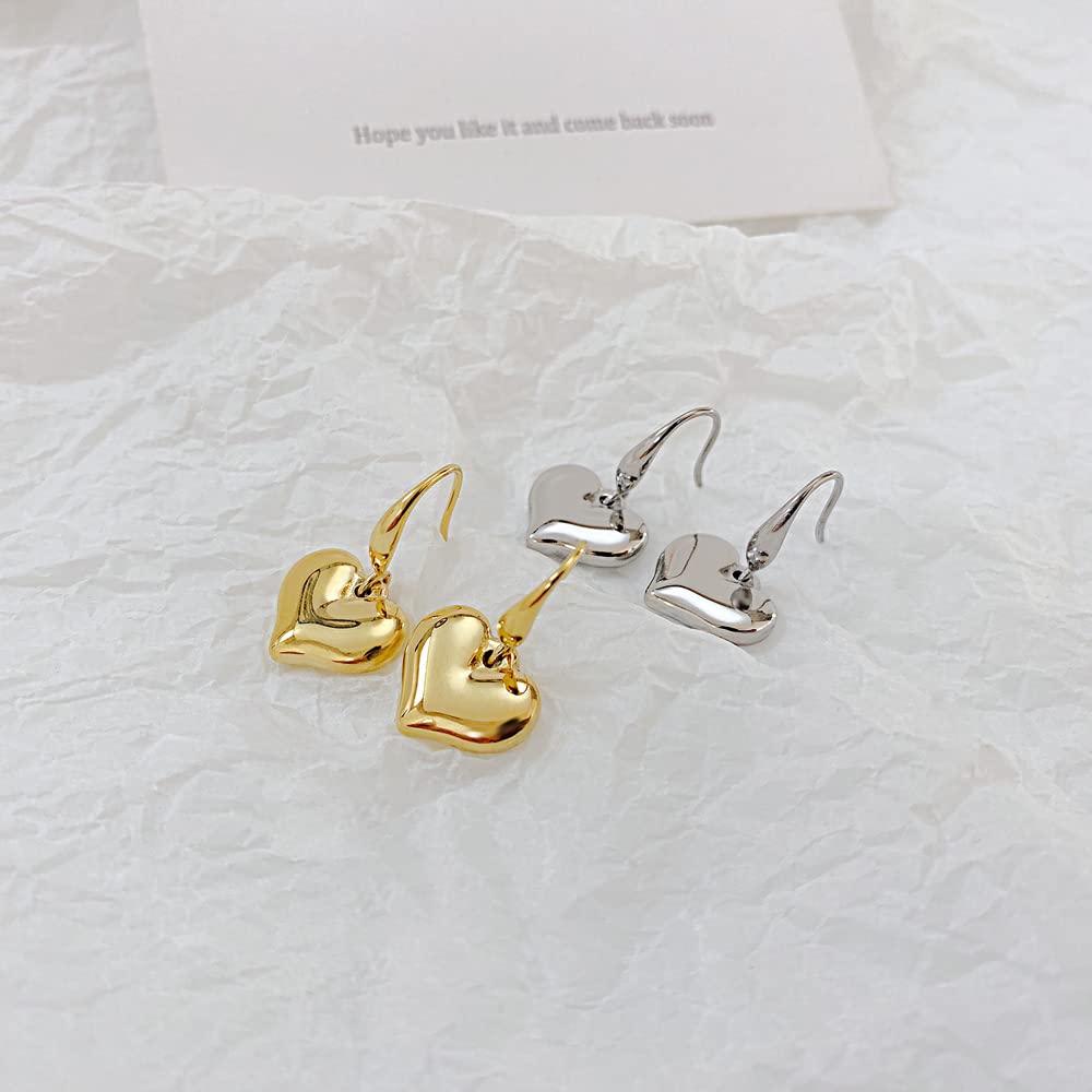 ふっくらとしたハートモチーフが愛らしく揺れる、Rockyu のチタン製レディースピアス。鏡面仕上げのシルバーとゴールドカラーが耳元に上品なツヤをプラスし、シンプルなのに存在感抜群。遊び心を忘れない大人の女性にぴったりのアクセサリーです。