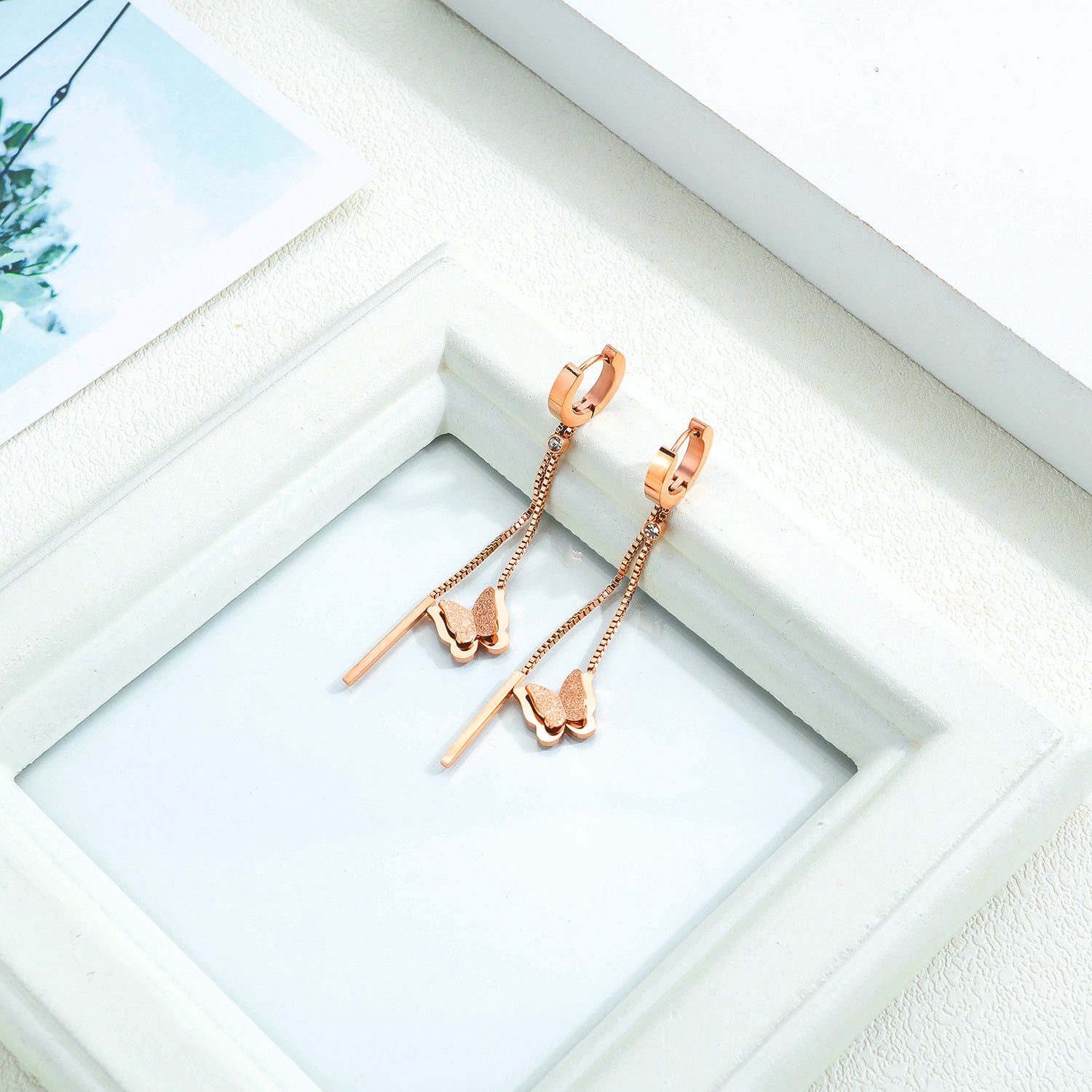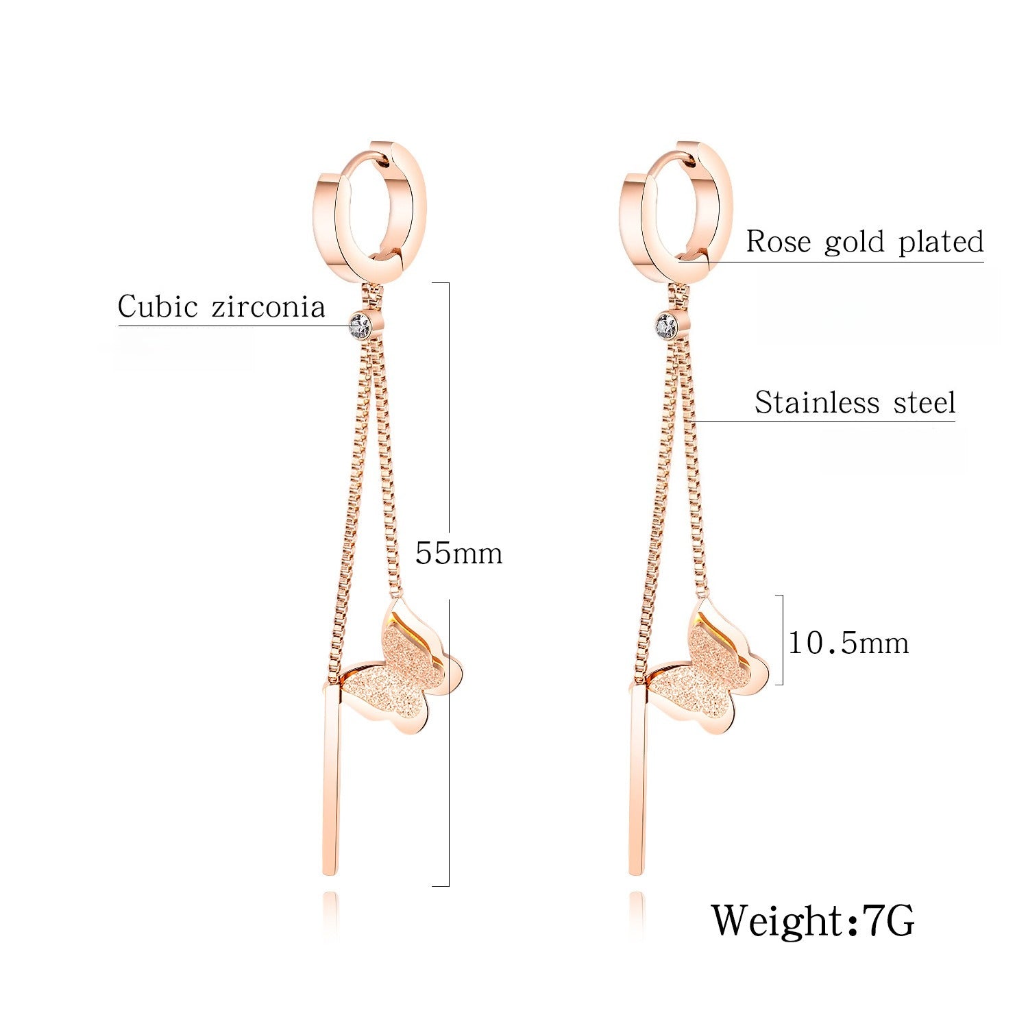 Rockyu レディースピアス ピンクゴールド 蝶モチーフ ロングチェーン スティックデザイン 揺れる 軽量 アレルギー対応