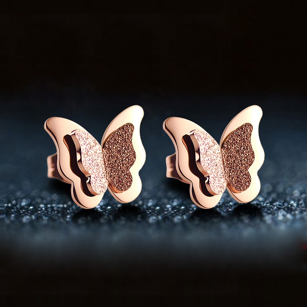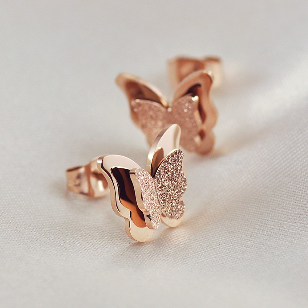 Rockyu レディースピアス ピンクゴールド 蝶モチーフ 艶消し ダブルデザイン スタッド 軽量 アレルギー対応