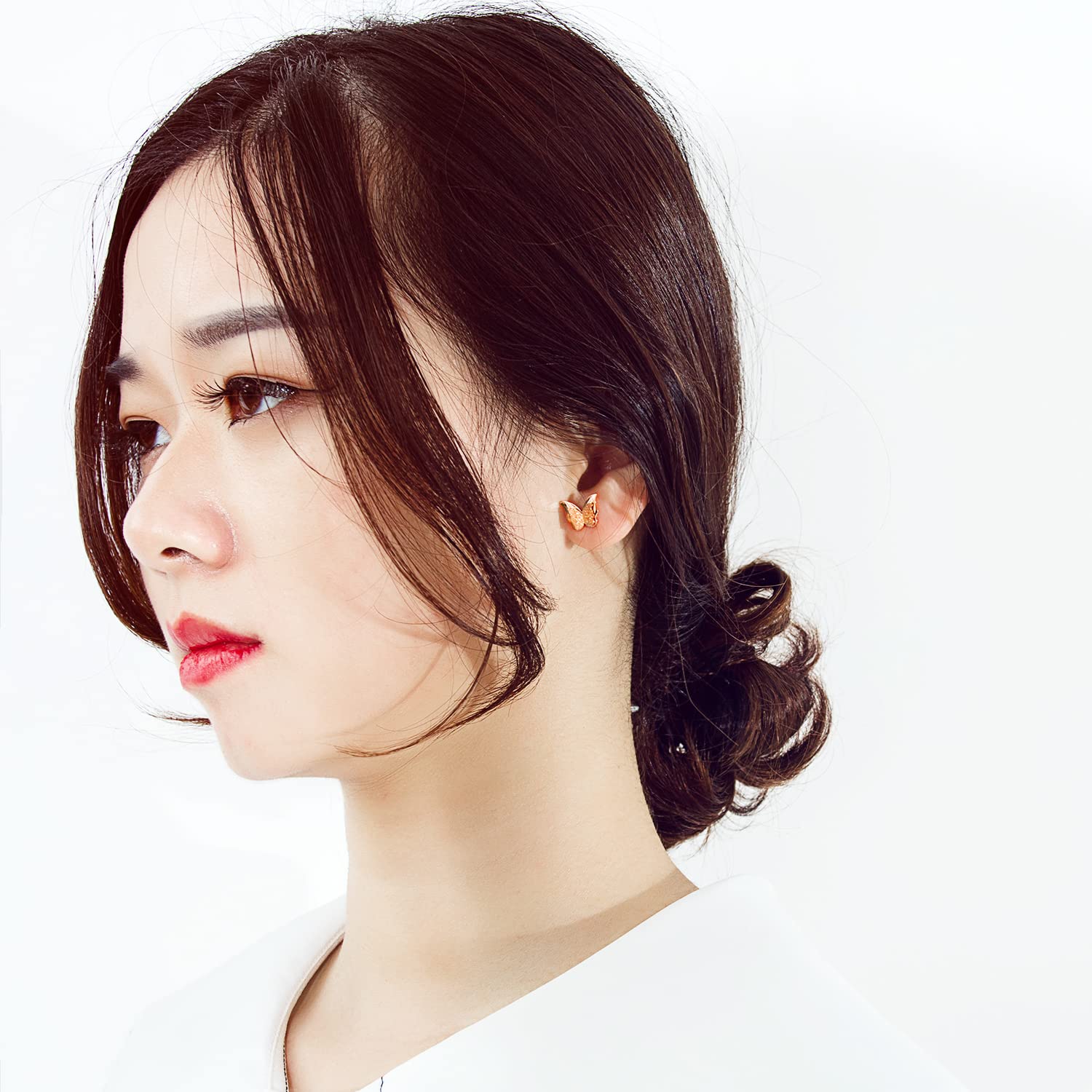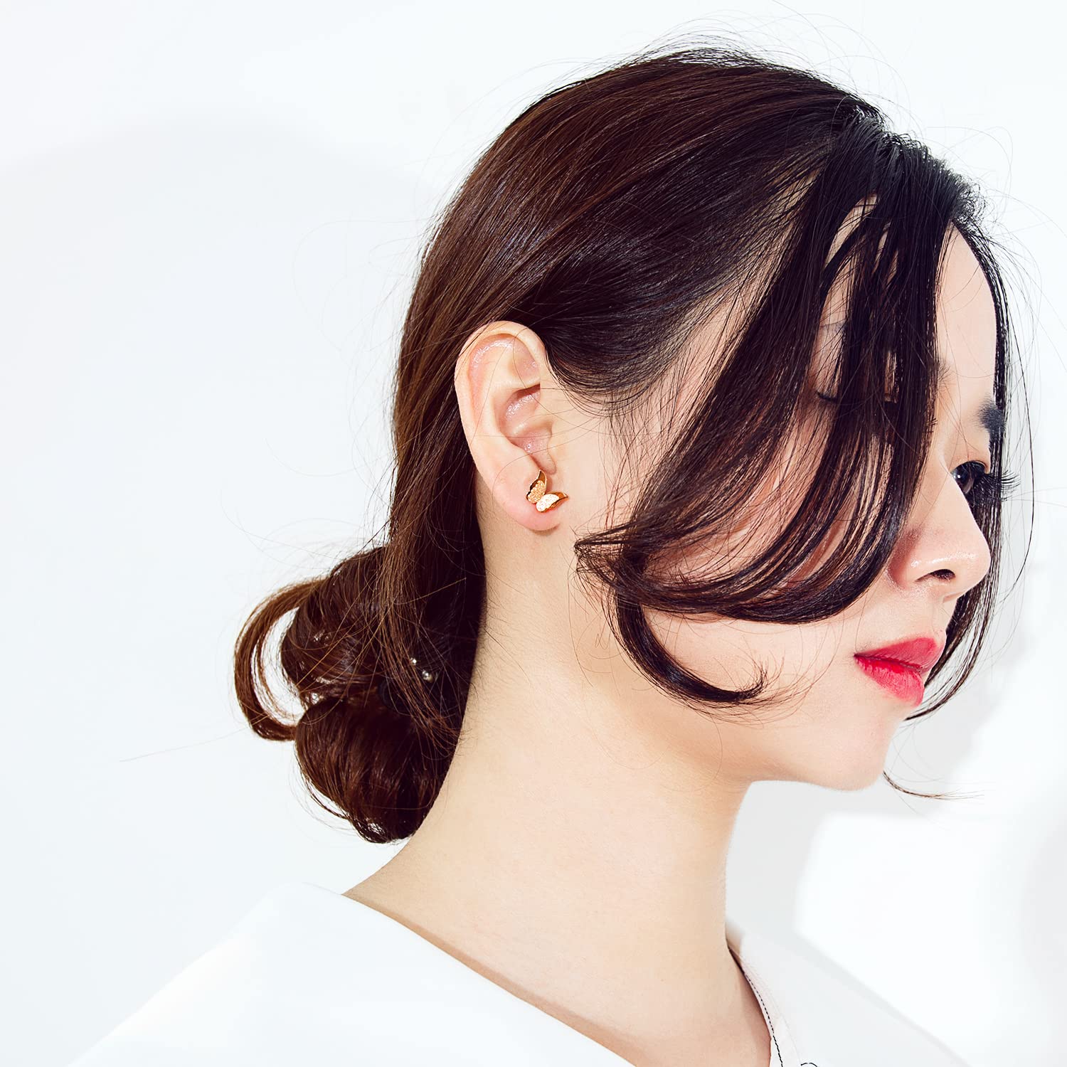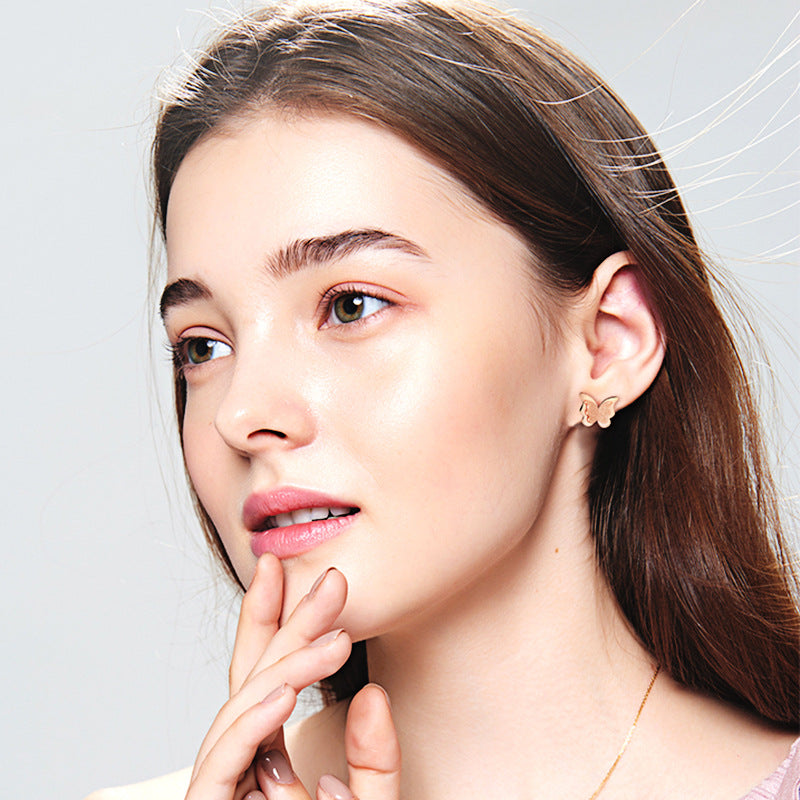 Rockyuが贈る、可憐な蝶モチーフのピンクゴールドスタッドピアス。艶消し仕上げの羽と光沢感のある縁取りが二重構造になり、立体的で華やかな印象を演出します。サイズは約10mm×9mmとコンパクトで、さりげなく耳元を飾りながらも存在感があります。ステンレススチールにローズゴールドコーティングを施し、金属アレルギーにも配慮。重量はわずか1.5gと軽量で、長時間の着用も快適です。普段使いはもちろん、誕生日や記念日などの特別な日のギフトにも最適。Rockyuの蝶ピアスは、日常のコーディネートに優しい輝きを添えるアイテムです。