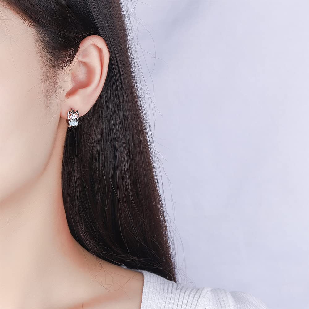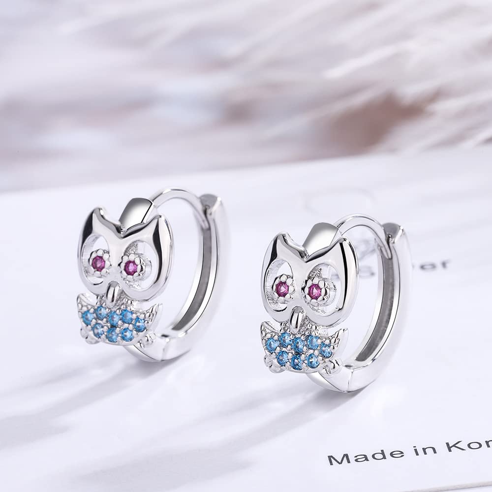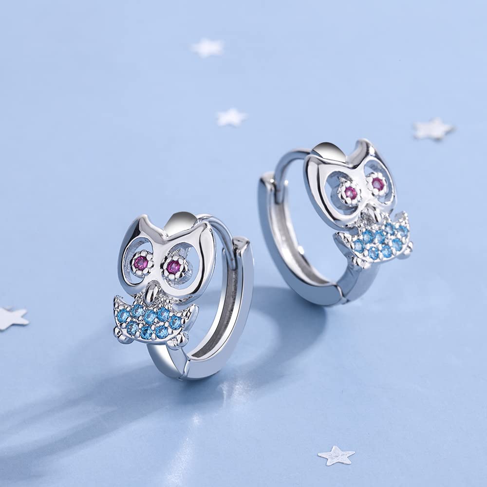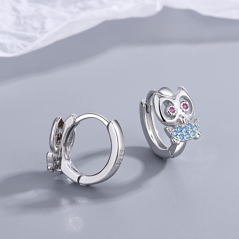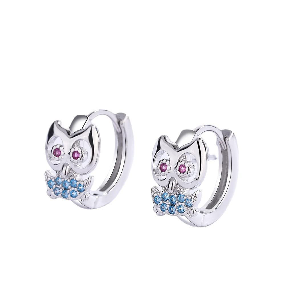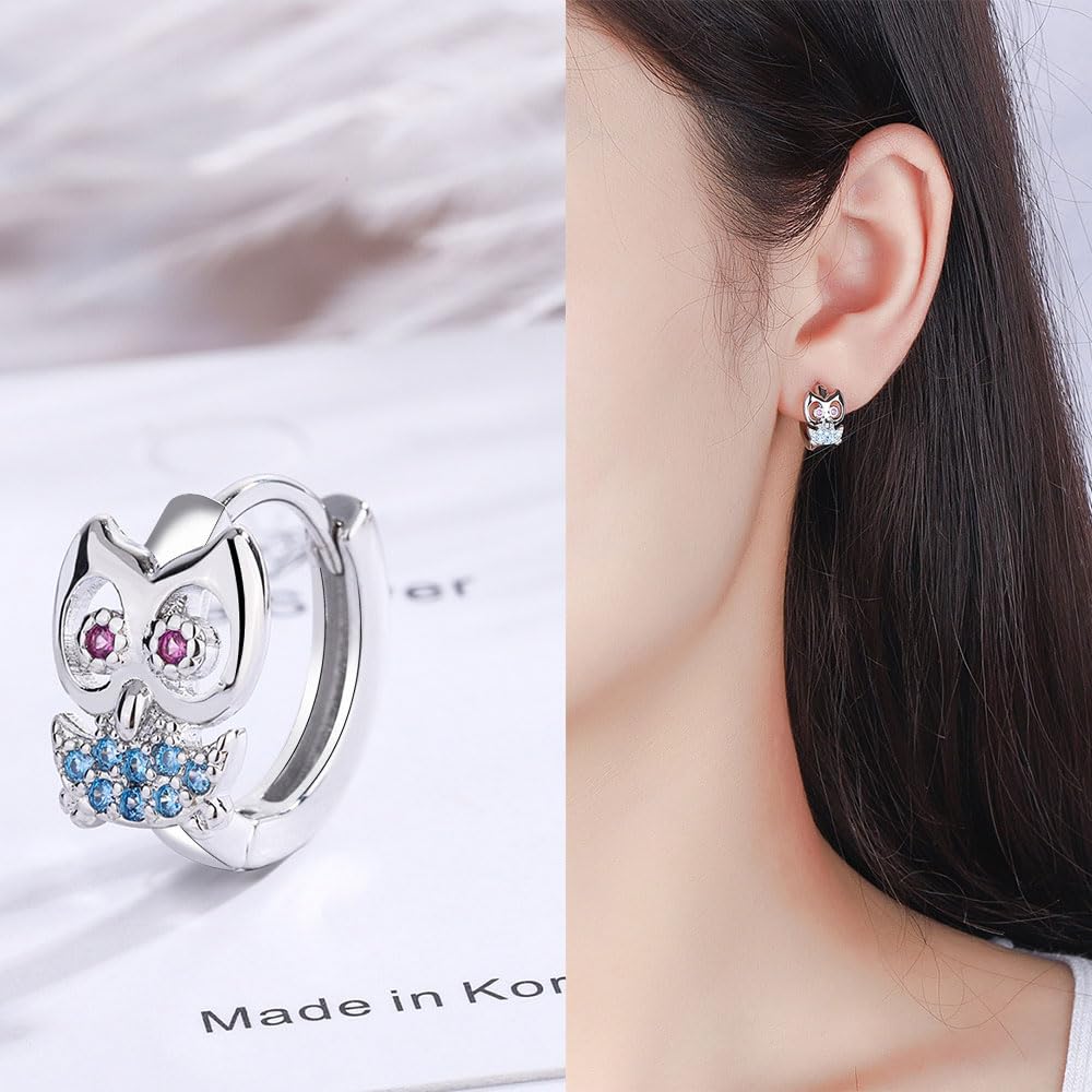 可愛らしい梟モチーフのリング型シルバーピアス。青と赤のジルコニアが目と胸元を彩り、上品で愛らしい印象に仕上げています。軽量で耳に負担が少なく、日常使いから特別な日まで幅広く活躍。動物好きな方やユニークなアクセサリーをお探しの方におすすめ。クリスマスや記念日のギフトにもぴったりです。