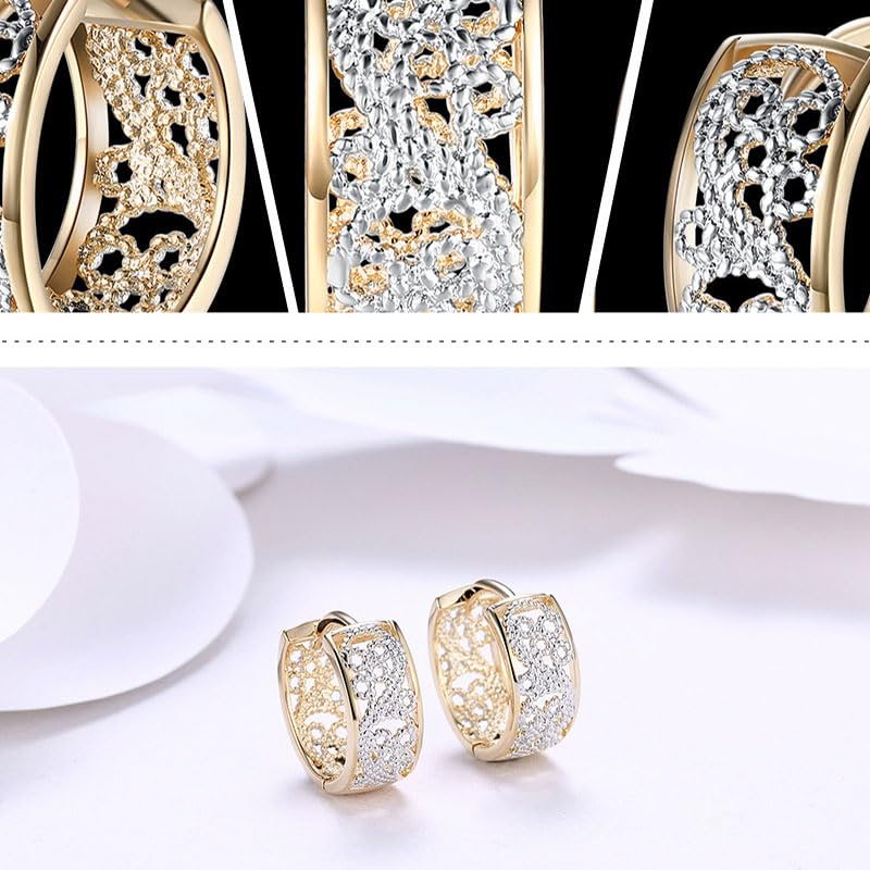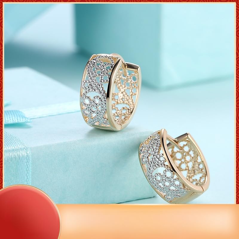 Rockyuのレディース幅広フープピアスは、上品なシャンパンゴールドとプラチナカラーを組み合わせた高級感あふれるデザイン。繊細な透かし彫りと花柄モチーフが華やかさを引き立て、ジルコニアの輝きが耳元をエレガントに演出します。直径約1.6cm、幅0.7cmの存在感のあるサイズ感で、普段使いからパーティーシーンまで幅広く活躍。軽量で耳への負担も少なく、恋人や友人へのギフトにも最適なセット販売商品です。