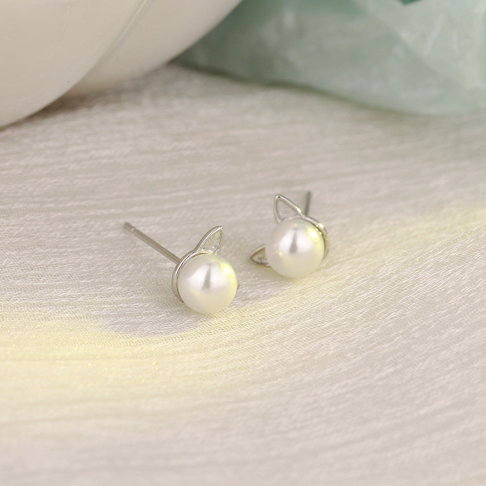 Rockyu 猫耳パールピアス レディース シルバー プチサイズ 可愛いアクセ