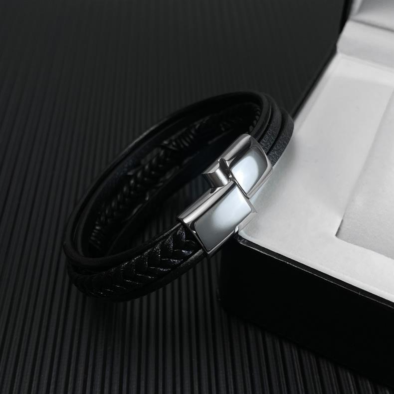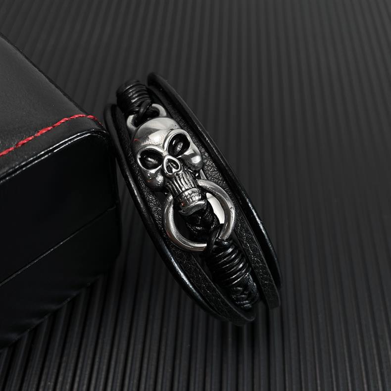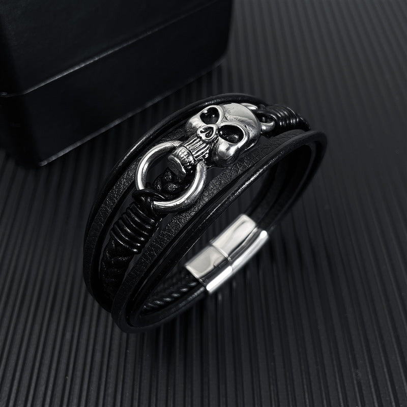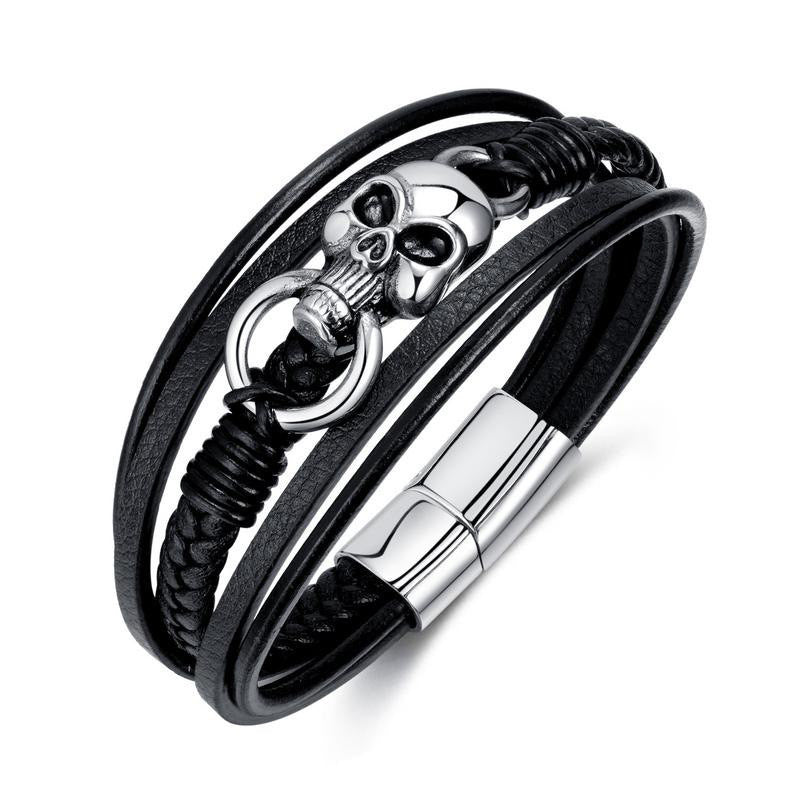 Rockyu が提案するこのメンズブレスレットは、黒革レザーをベースにした多重巻きデザインと、インパクト抜群の髑髏モチーフが融合した存在感あふれるアクセサリーです。編み込みレザーが重なり合い、数字8や無限大を連想させるラインが力強さと永続性を象徴。中央に配置されたドクロが手元に強烈なインパクトを与え、ロック、パンク、ゴシックなど多彩なスタイルにマッチします。