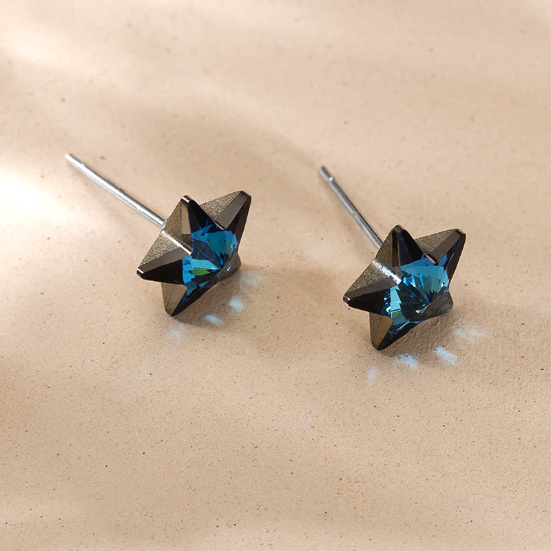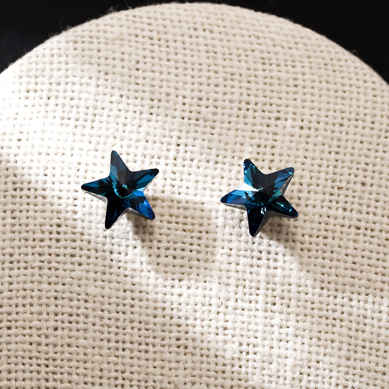 Rockyuが贈る、耳元に瞬く小さな星。夜空のように深く澄んだブルーのスワロフスキークリスタルが輝く、スターカットピアスです。直径約0.7cmの小ぶりなサイズながら、その輝きは一等星級。角度によって表情を変える立体的なカットが、シンプルな装いにもキラリと個性を添えてくれます。