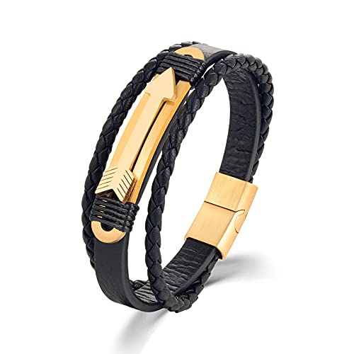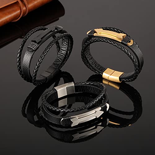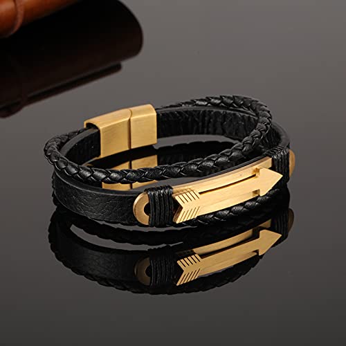 Rockyu ブレスレット メンズ 本革 多重編み込み 矢印モチーフ ゴールド&シルバー アジアン風