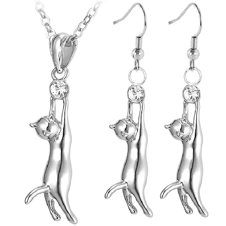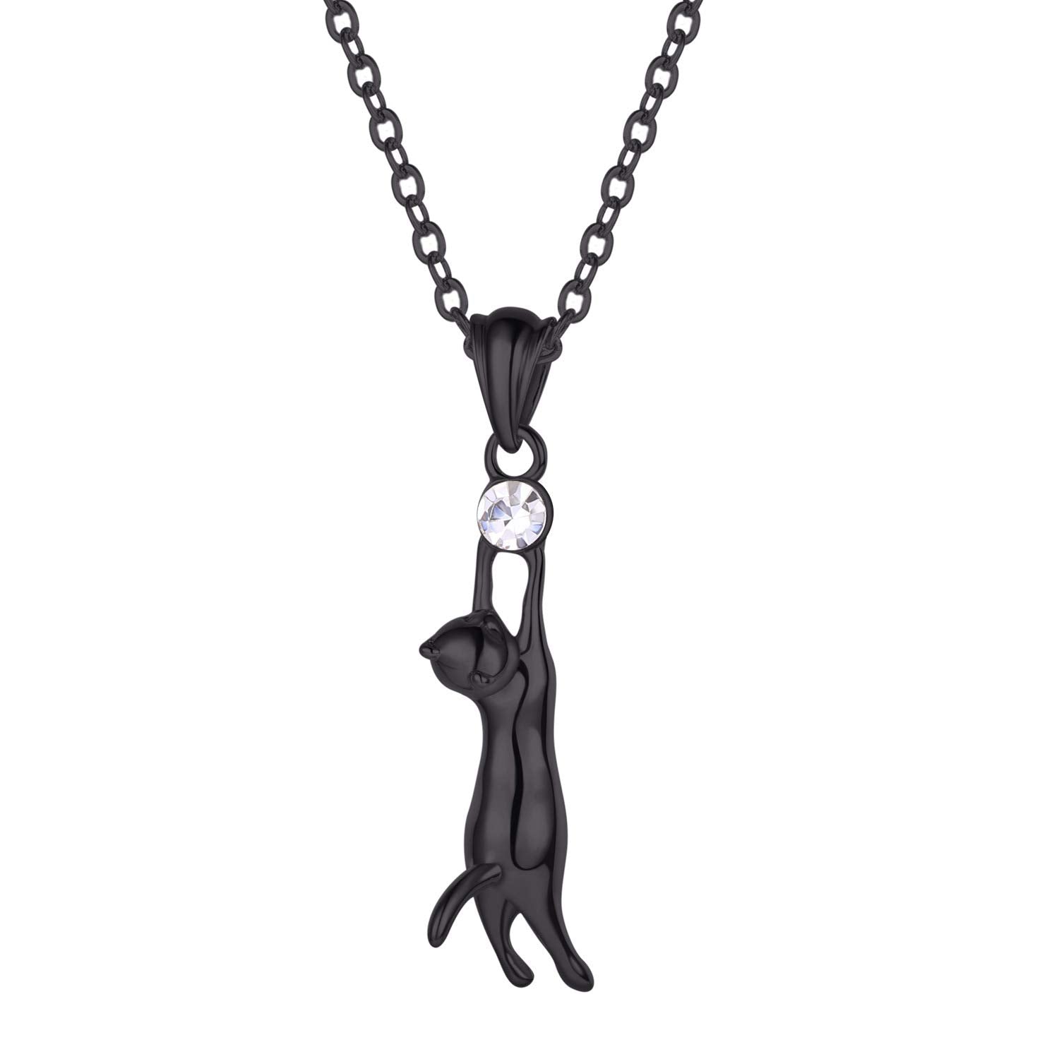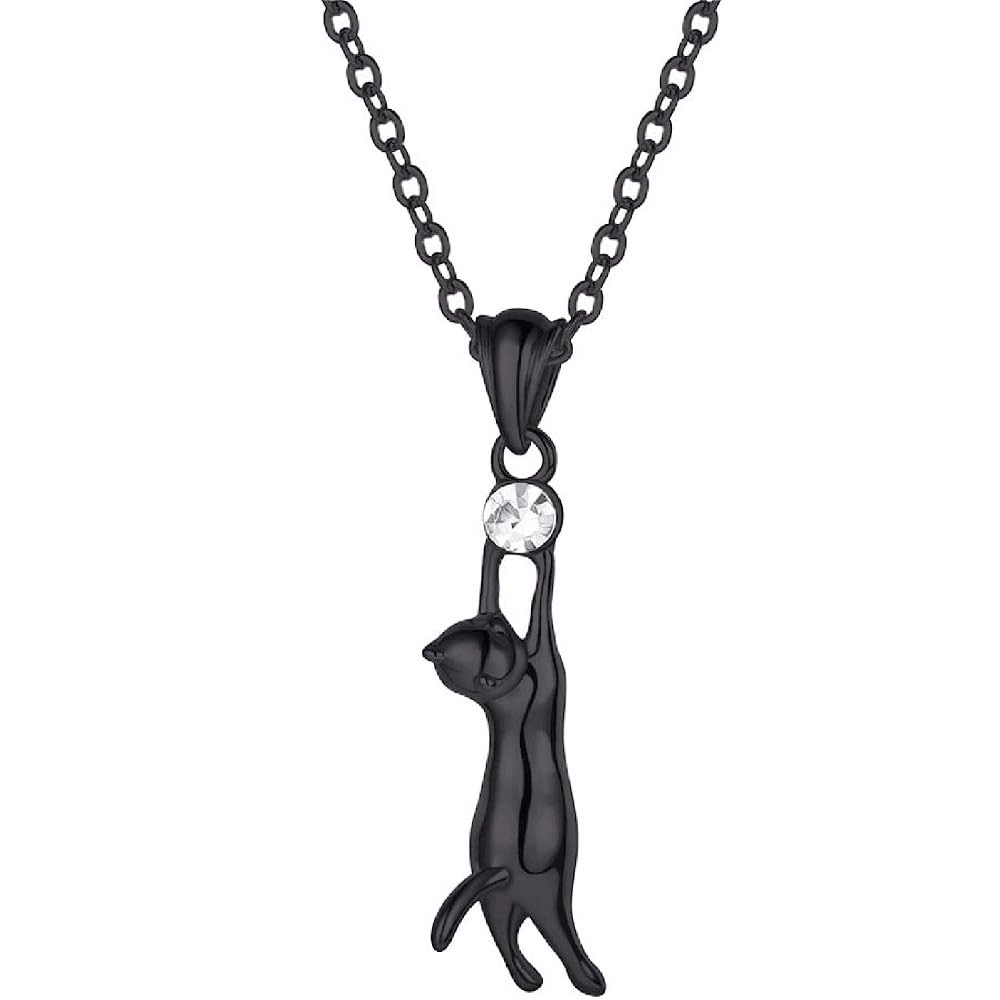 Rockyu ネックレス レディース 猫モチーフ ジルコニア付き ブラック&シルバー ペンダント