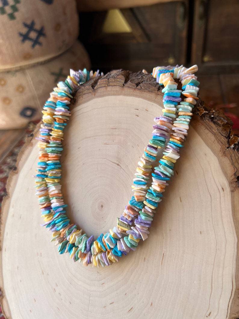 Rockyuから登場したのは、カラフルな天然シェルを贅沢に使用した、ボヘミアンスタイルのネックレス。手作業でひと粒ずつ紡いだ40cmのショート丈は、デコルテにリズムとリゾートを添えてくれます。