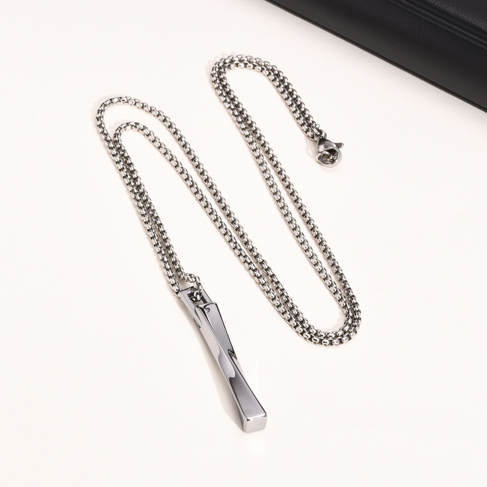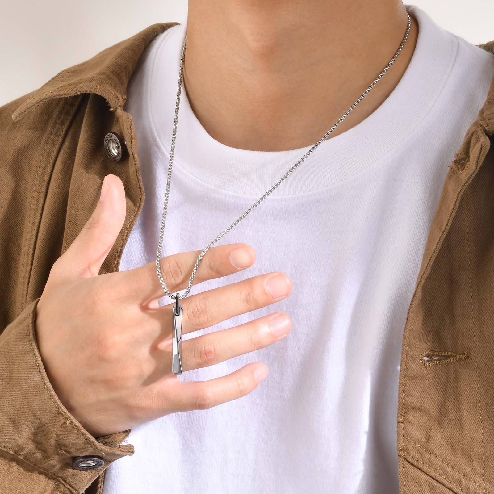 スティック型ペンダントは長さ35mm、幅5mmと絶妙なサイズ感。チェーンは60cmとやや長めで、シャツの上からも中からも好バランス。素材はアレルギーに強いステンレス製で、肌にも優しく、デイリー使いにも安心。
