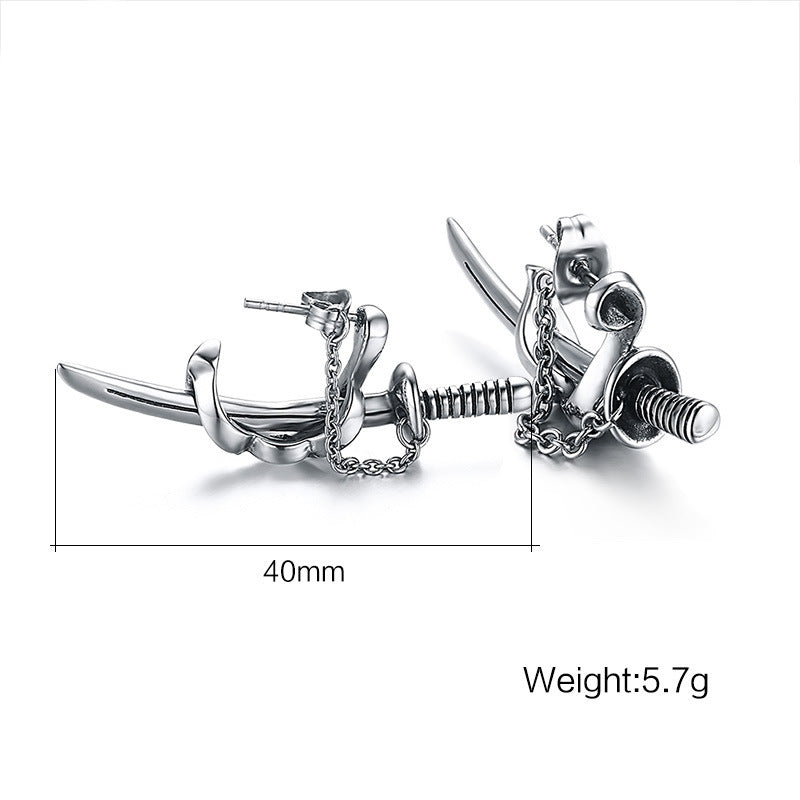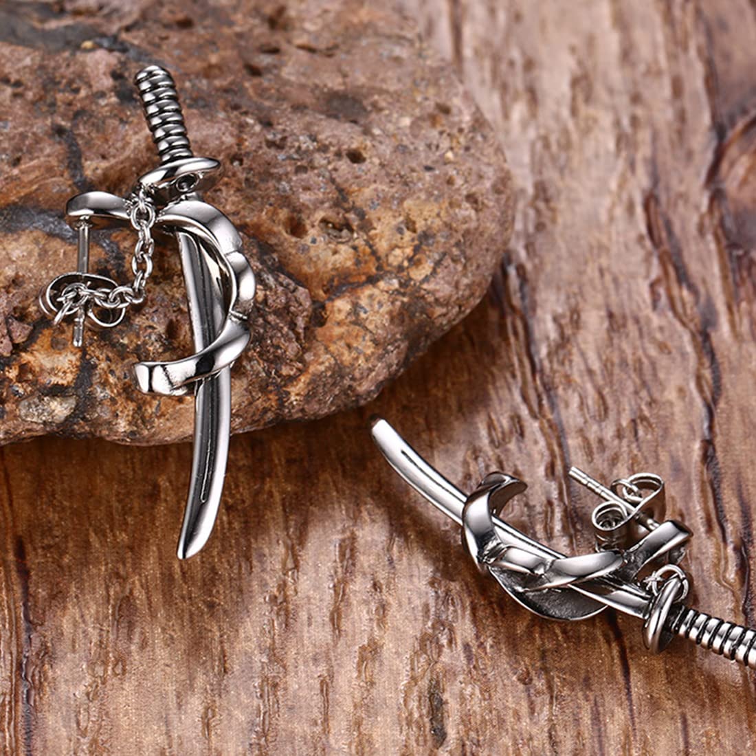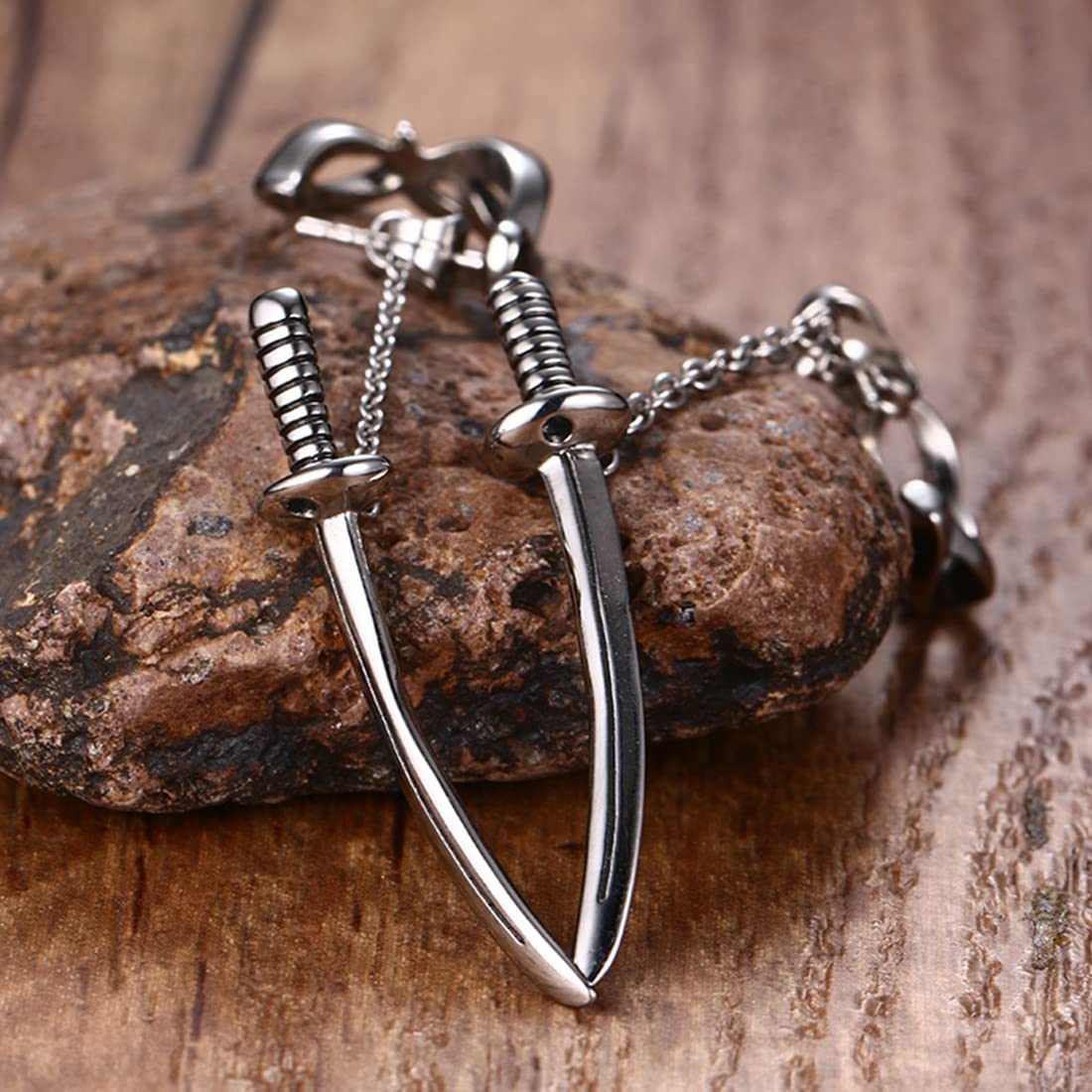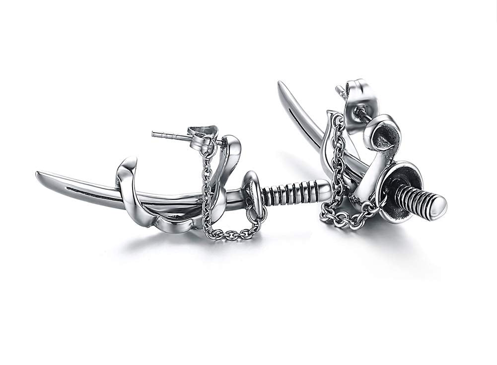 Rockyu メンズピアス シルバー 刀モチーフ チェーン付き チタン製 個性派スタッド