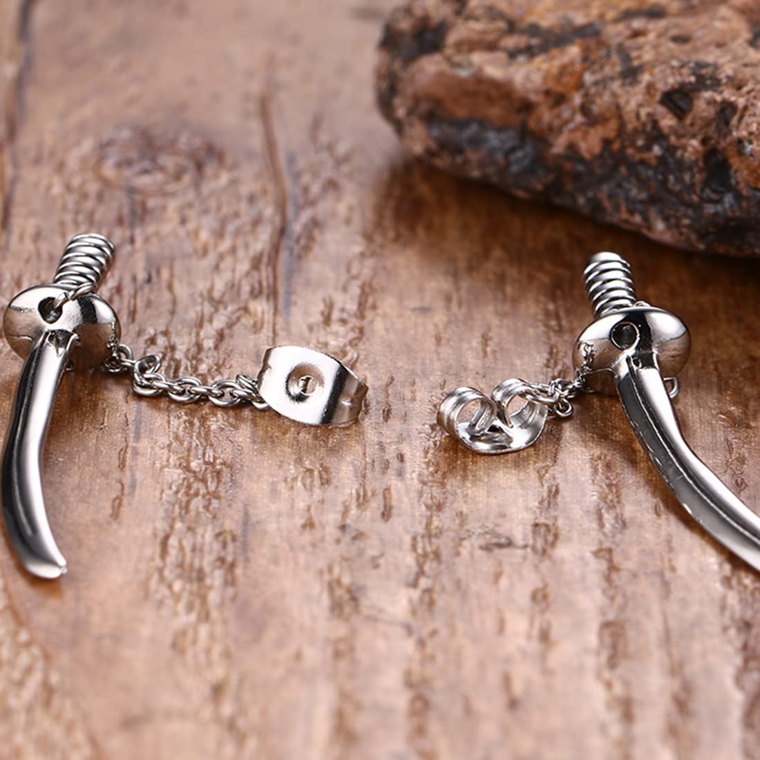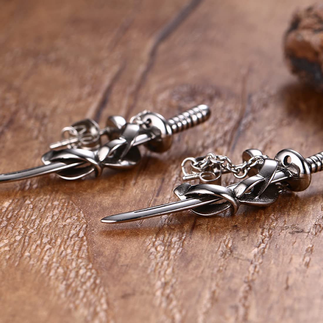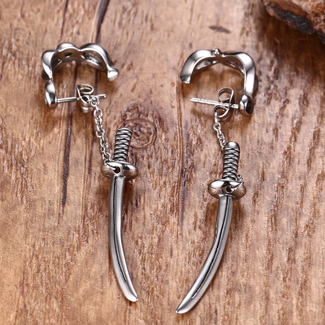 Rockyu メンズピアス シルバー 刀モチーフ チェーン付き チタン製 個性派スタッド
