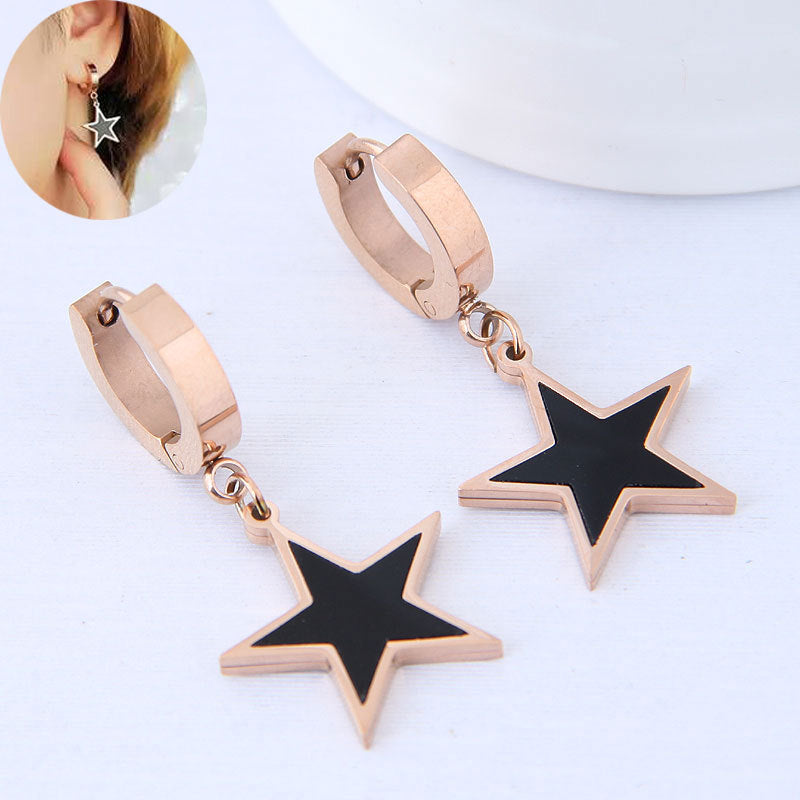 Rockyu フープピアス レディース 星モチーフ ブラック×ピンクゴールド 18K仕上げ チタン製