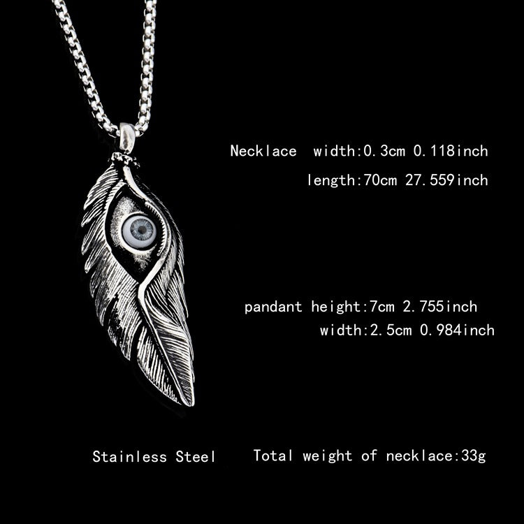 Rockyu が贈るこのメンズネックレスは、羽根をモチーフにしたペンダントに印象的な「目」のデザインを組み合わせた、存在感抜群のファッションアクセサリーです。重厚感あるチタン×ステンレス素材で仕上げられ、アンティーク風の風合いが大人の渋みを演出。ロックやゴシック、レトロスタイルまで幅広くマッチし、シンプルなTシャツやシャツに合わせるだけで、独自の個性を際立たせます。