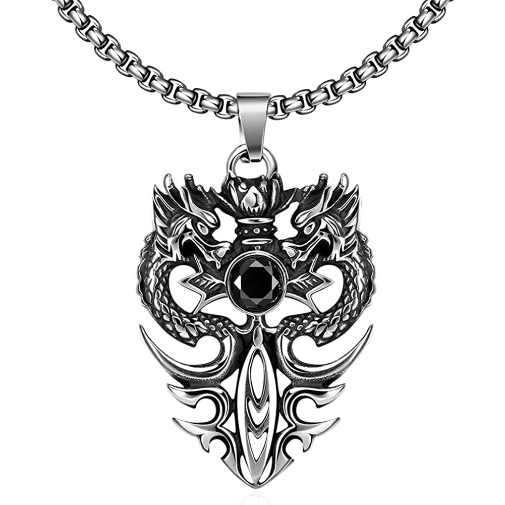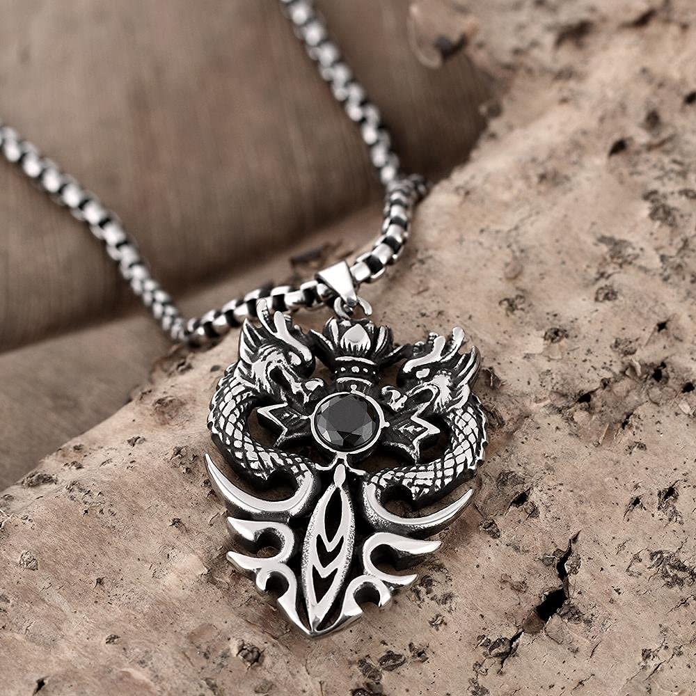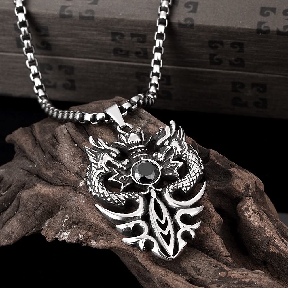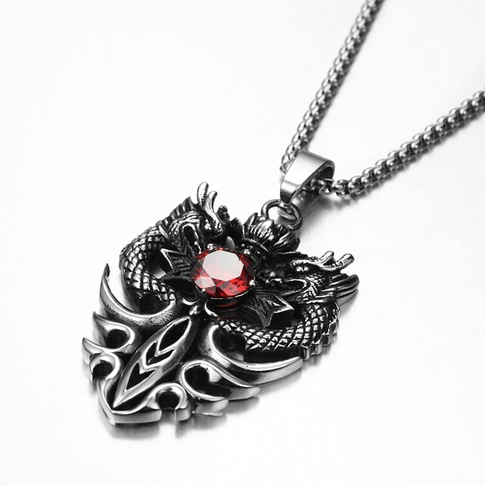 【双龍の守護】ステンレスペンダントネックレス|ブラック&レッドストーン メンズアクセ