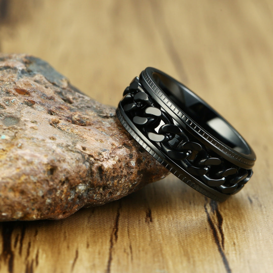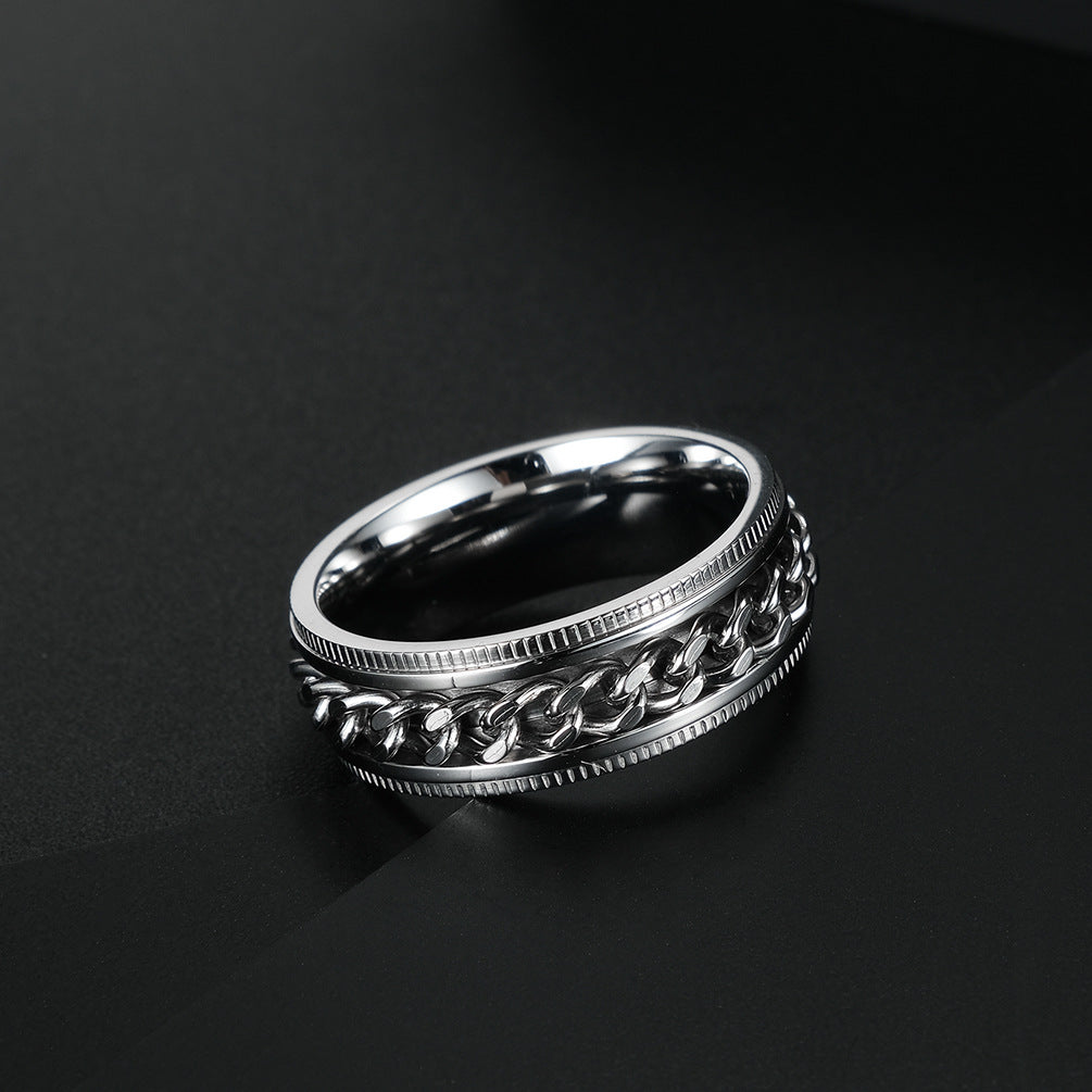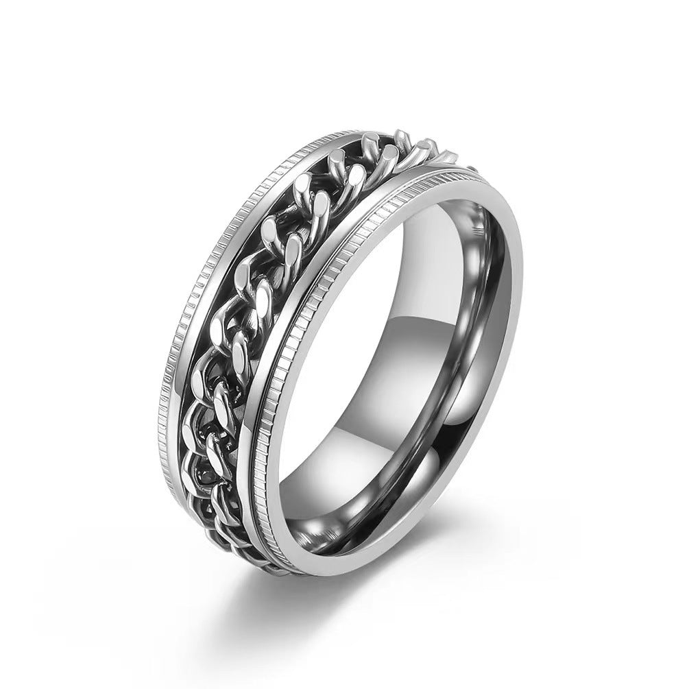 Rockyuが贈る、男心をくすぐるステンレスチェーンリング。回転する喜平チェーンが、ただのアクセサリーにとどまらず、指先にちょっとした遊び心と癒しをプラス。仕事中やリラックスタイムにくるくる回せば、不安やストレスが少しずつほどけていくような感覚に。