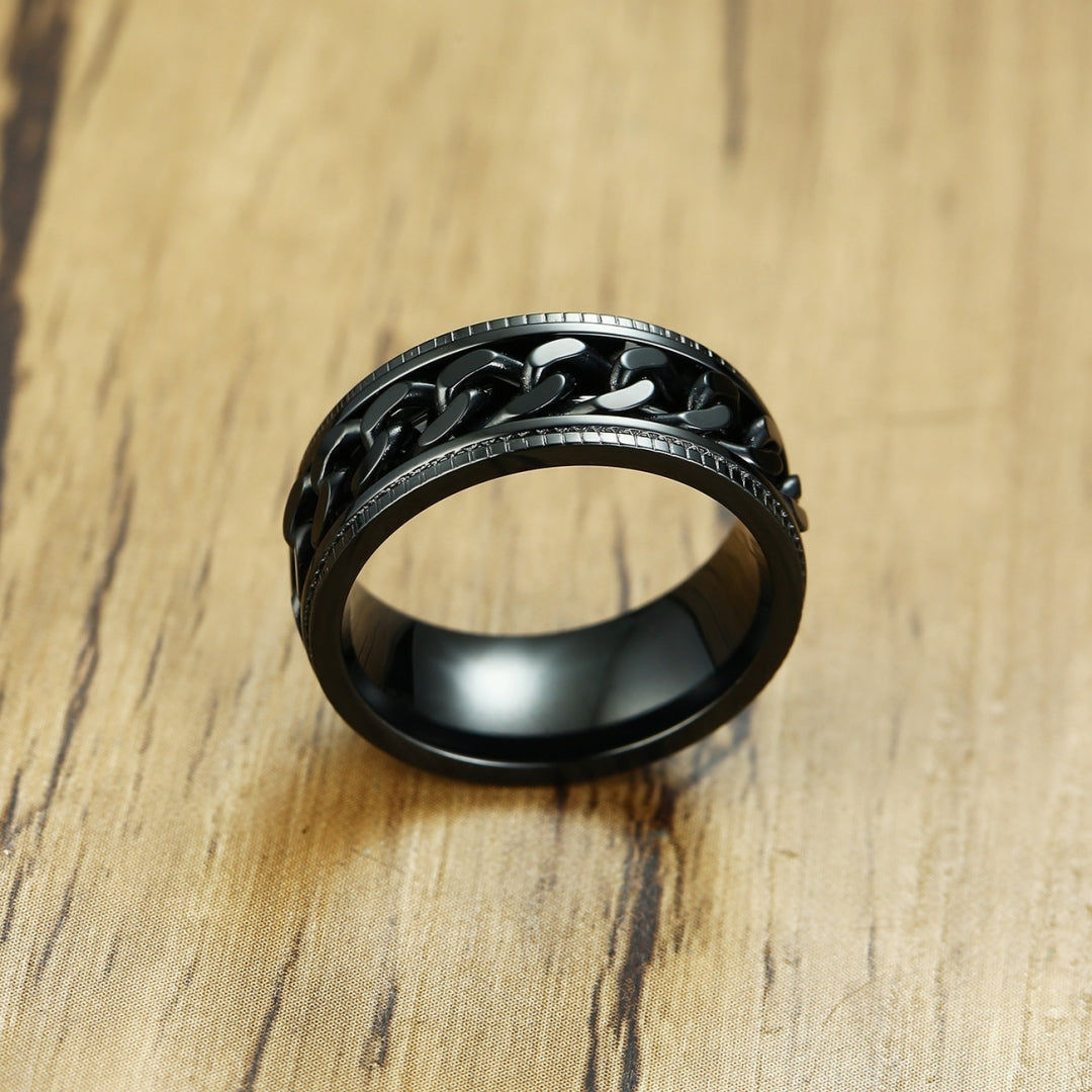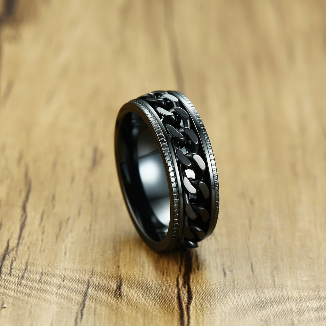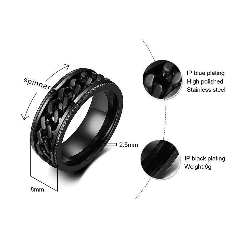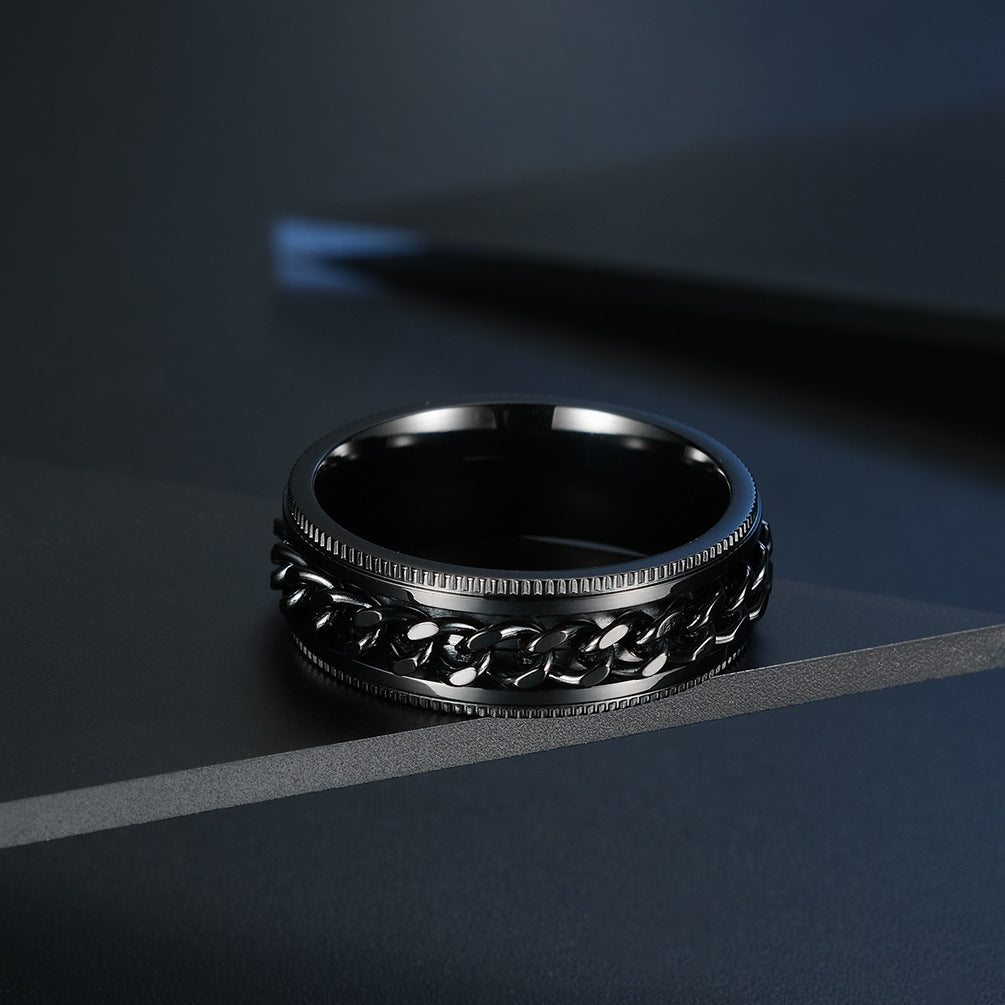 Rockyuが贈る、男心をくすぐるステンレスチェーンリング。回転する喜平チェーンが、ただのアクセサリーにとどまらず、指先にちょっとした遊び心と癒しをプラス。仕事中やリラックスタイムにくるくる回せば、不安やストレスが少しずつほどけていくような感覚に。