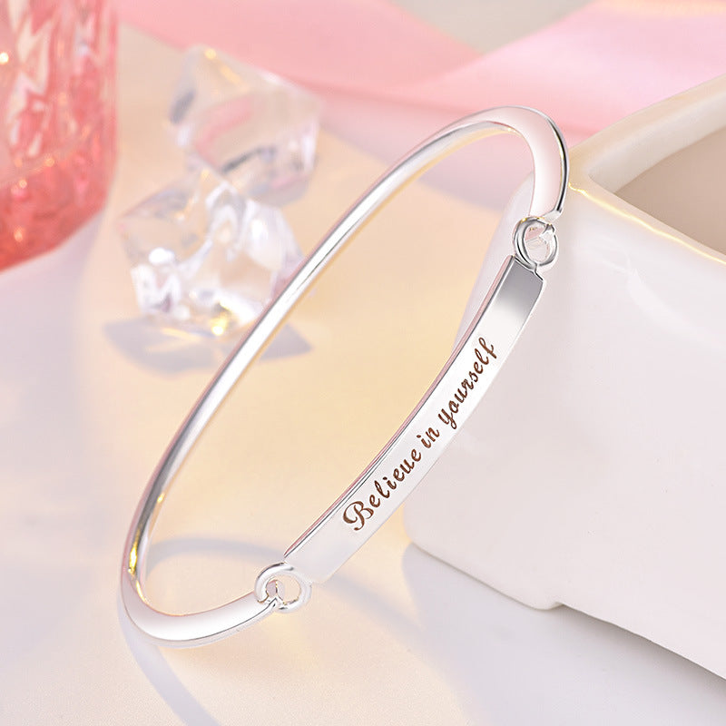 自分を信じる、その一言が今日を変える。Rockyuのメッセージバングルは、「Believe in yourself(自分を信じて)」という言葉を繊細に刻み、日々のモチベーションアップをサポートします。