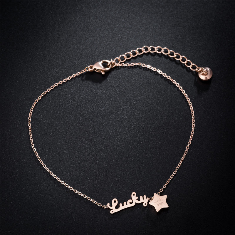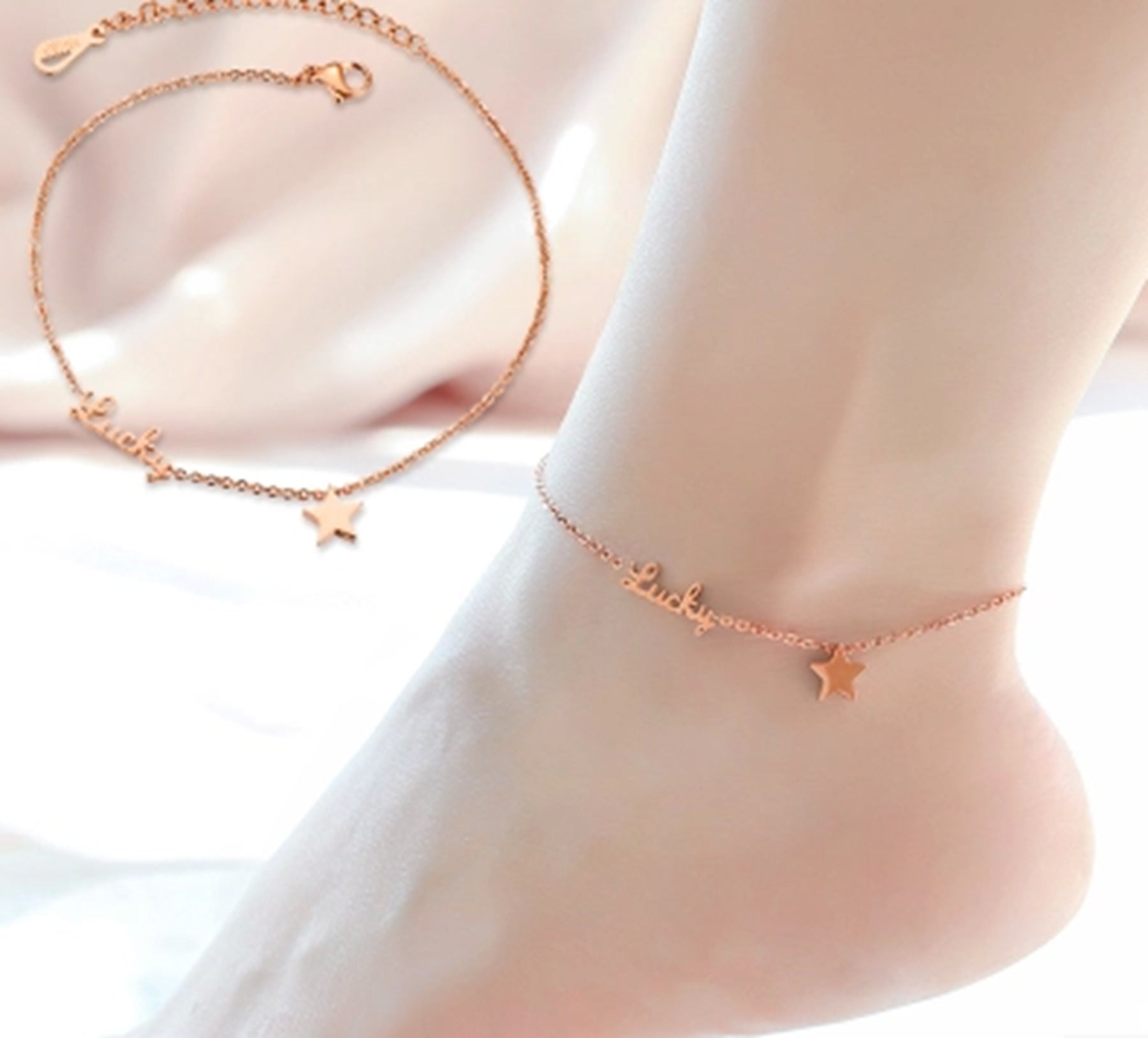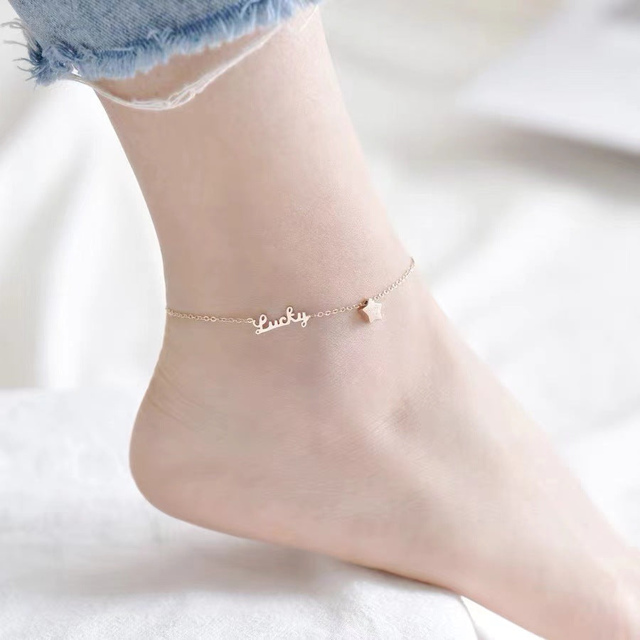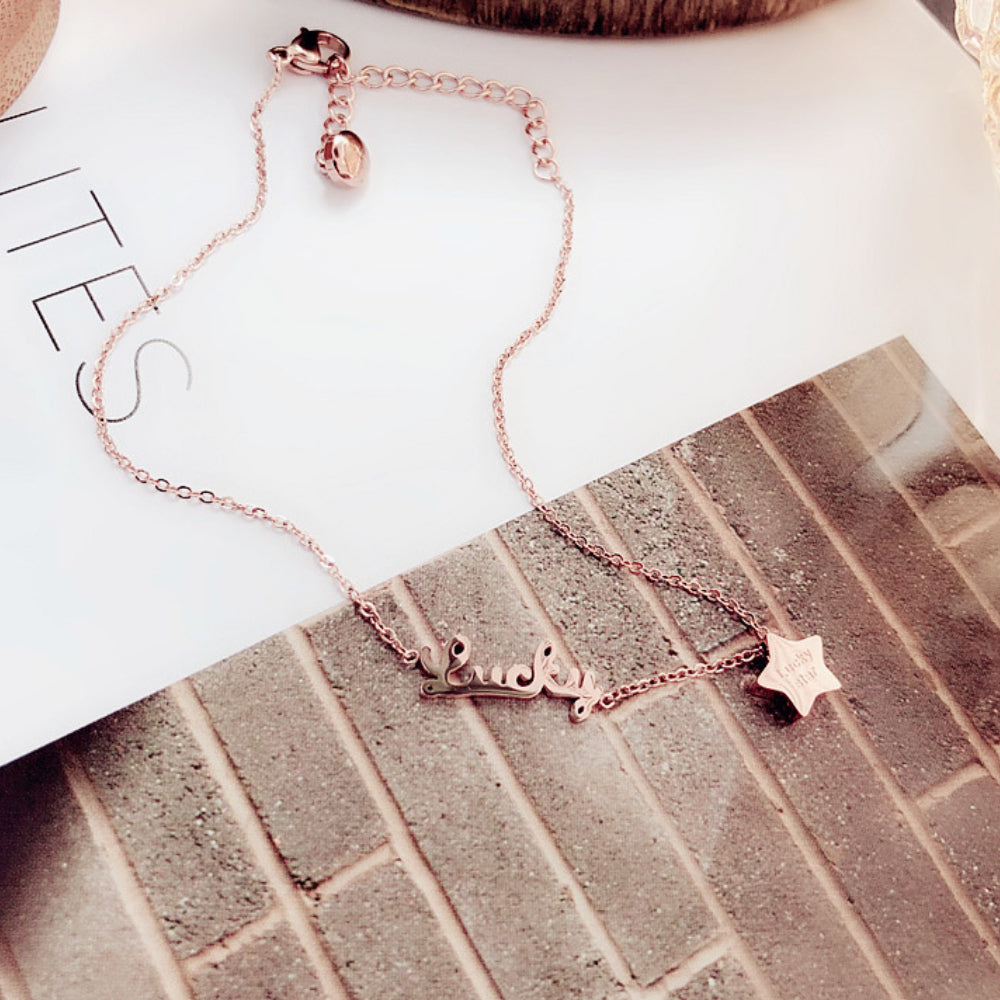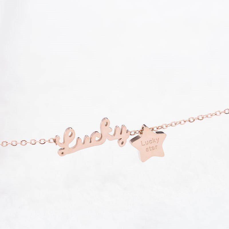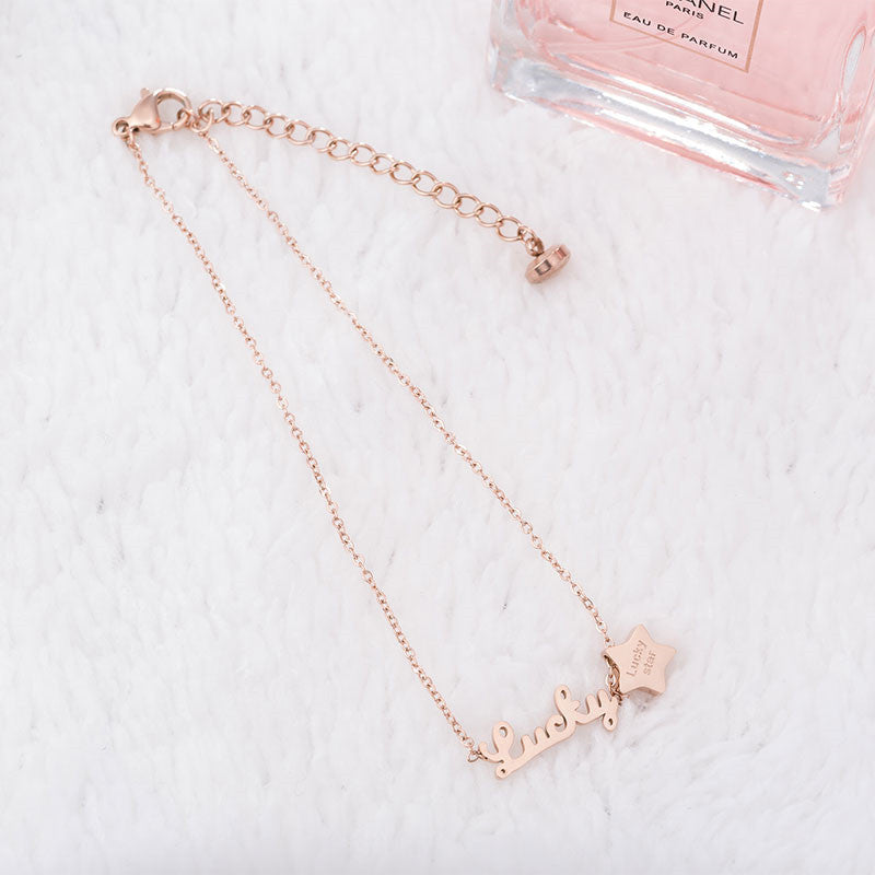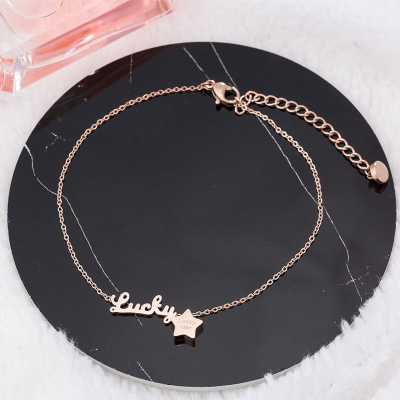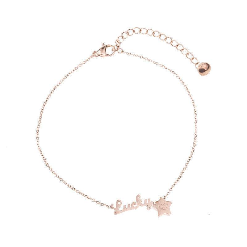願いごと、足元に。Rockyuのピンクゴールドアンクレットは、きらめく「Lucky」と星モチーフが足元をロマンチックに演出。繊細なチェーンに浮かぶワンポイントのチャームが、歩くたびに優しく揺れて視線を奪います。