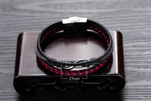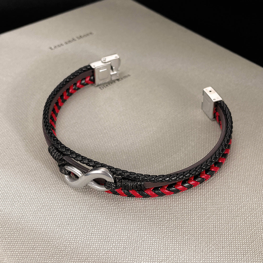 黒×赤のコントラストが大人の色気を引き立て、数字8のような無限マークがさりげなく存在感を主張。重ね着け風の三連デザインは、1本で手元コーデが完成する優れモノ。スナップロック式で着脱もスマート、忙しい朝でもストレスなし。