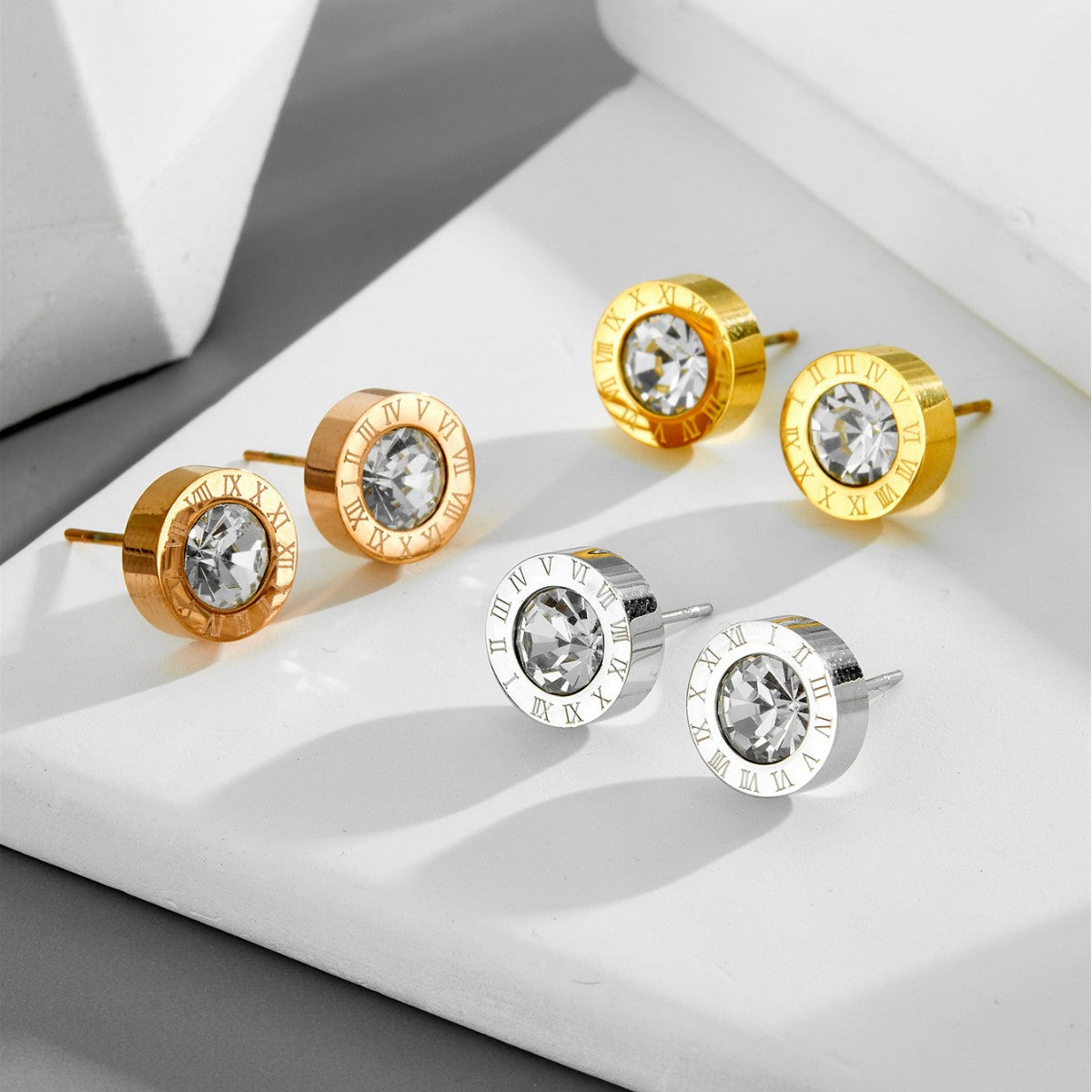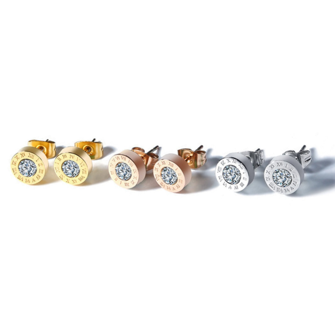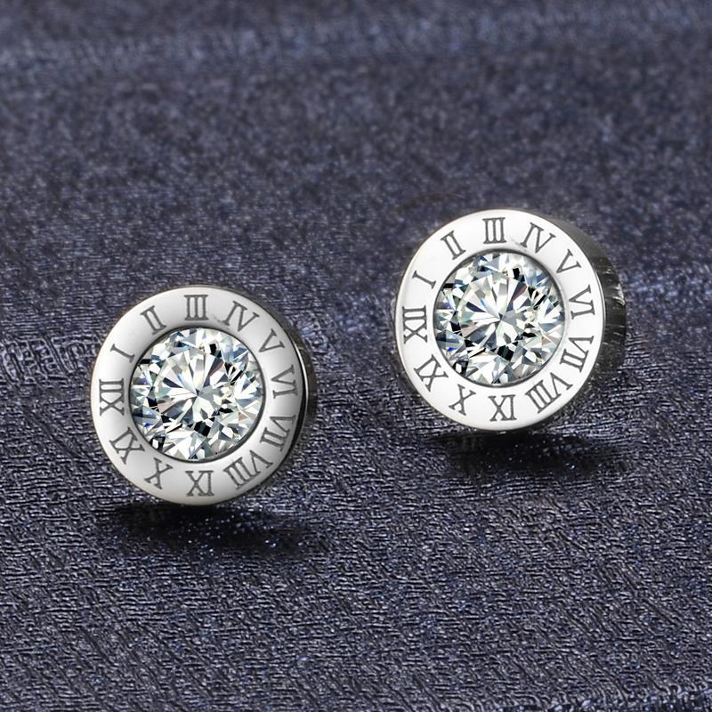 Rockyuが提案する、シンプルだけど奥深い美しさを秘めたレディース用スタッドピアス。中央には上品に輝く一粒CZ(キュービックジルコニア)、その周囲を取り巻くのはクラシカルなローマ数字の刻印。まるで時を閉じ込めたかのような、ちょっぴりロマンチックなデザインです。
