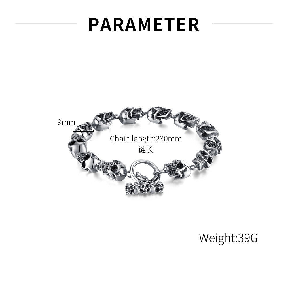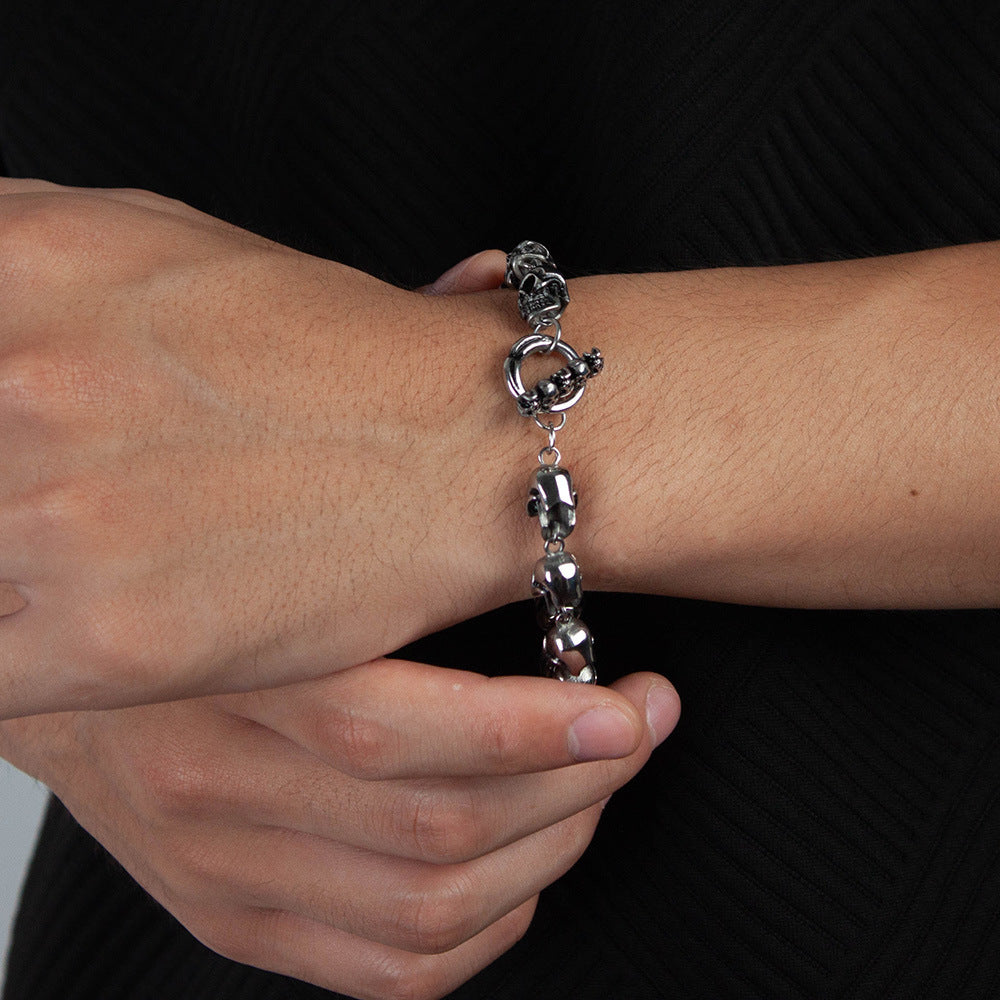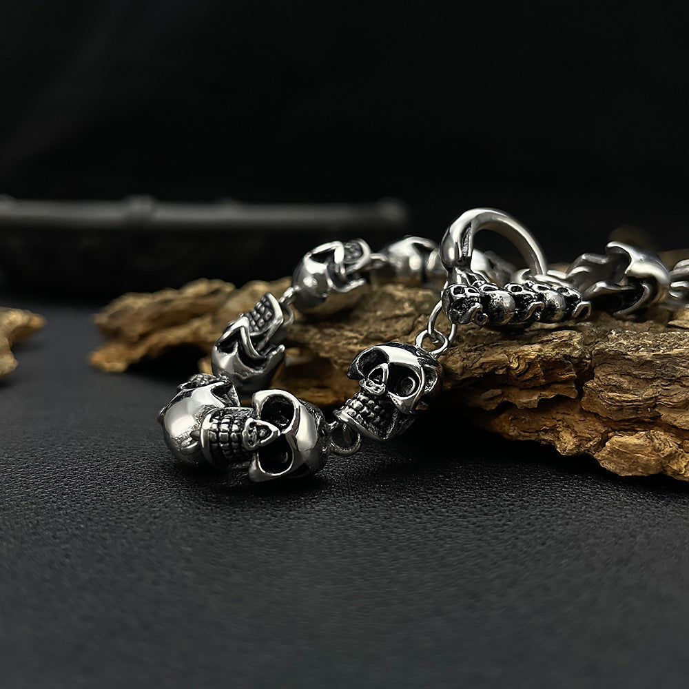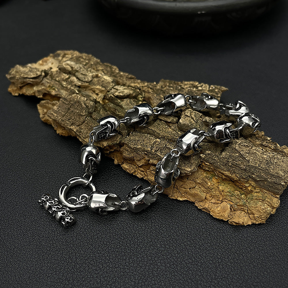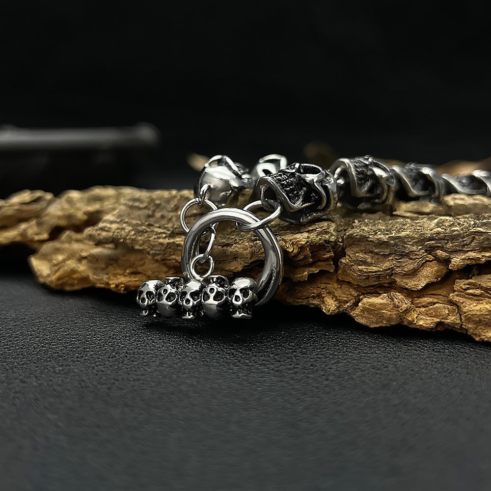 Rockyuが放つ、究極の“反骨スタイル”。このスカルチェーンブレスレットは、ただのアクセサリーじゃない。ひとつひとつのドクロが細部まで作り込まれ、まるで意思を持っているかのような存在感。幅広でしっかりとした作りが、あなたの手元に圧倒的なインパクトを与えます。