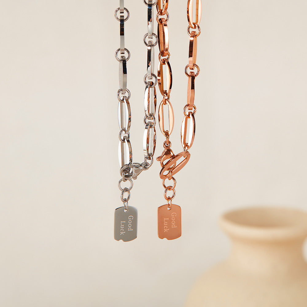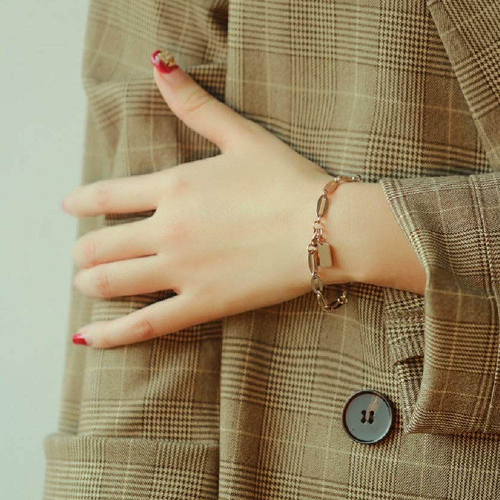 手元にそっと幸運を。Rockyuのピンクゴールドブレスレットは、洗練された華奢なチェーンに「Good Luck」の刻印チャームを添えた、運気まで上がりそうなアイテム。肌なじみの良いローズゴールドの輝きは、優しくも印象的で、さりげない存在感を放ちます。