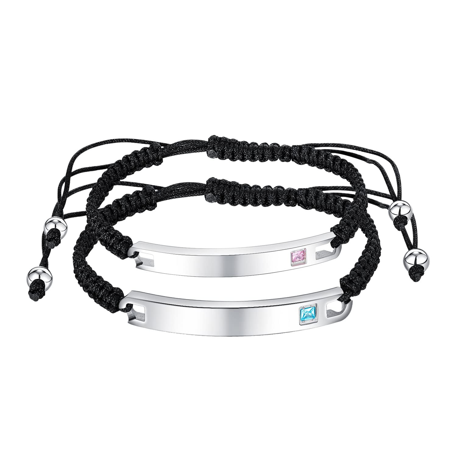 Rockyu レザーブレスレット ペア カップル用 調整可能コードタイプ ステンレス×CZ プレート 男女兼用