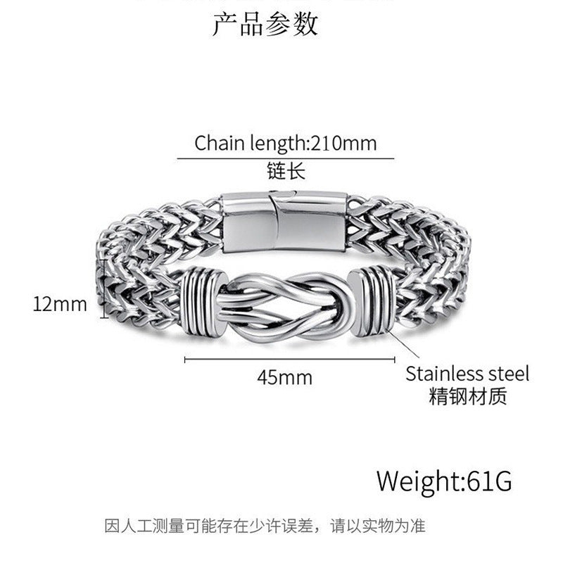 全長約21cm、重さはズッシリ62g。手に取った瞬間に伝わる“本物”の重み。12mm幅のチェーンと、中央の絡み合うノットが手首に映え、他とは一線を画すデザインに仕上がっています。