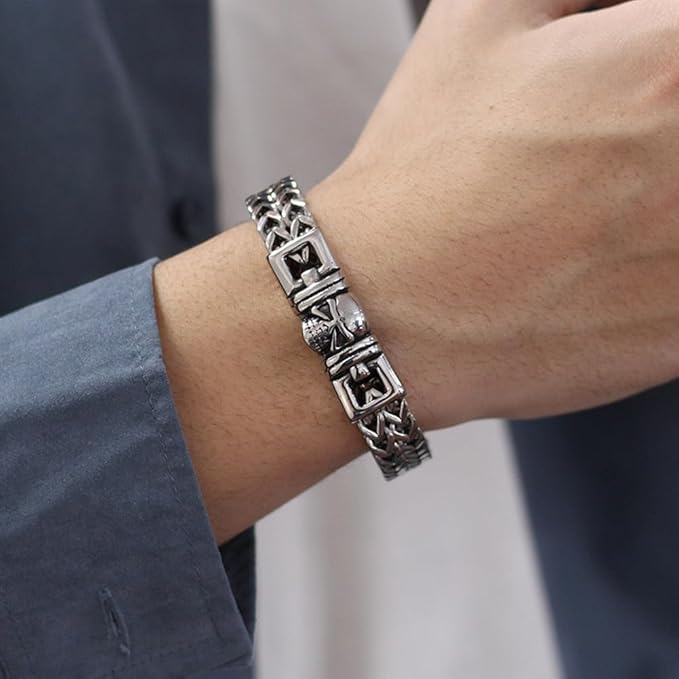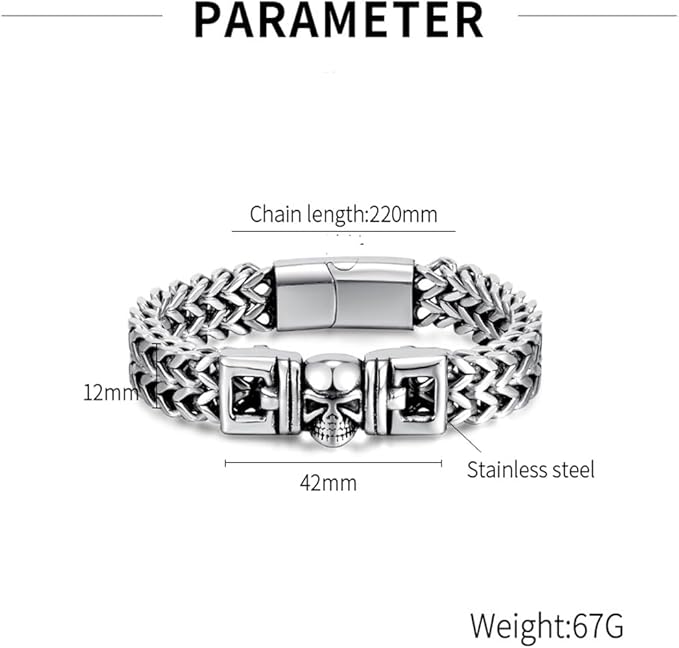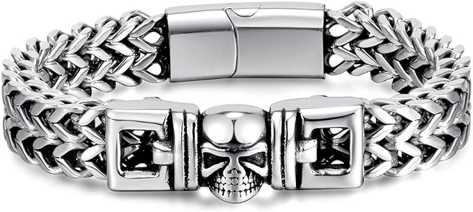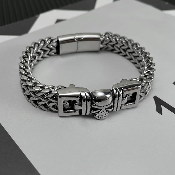Rockyuのメンズブレスレットは、存在感抜群のシルバーカラーと重厚なステンレス素材で仕上げられたタフなアクセサリー。幅12mmのしっかりとした2連チェーンに、フロント部分にはクールなスカルモチーフをあしらい、ゴシックかつスタイリッシュな印象を与えます。