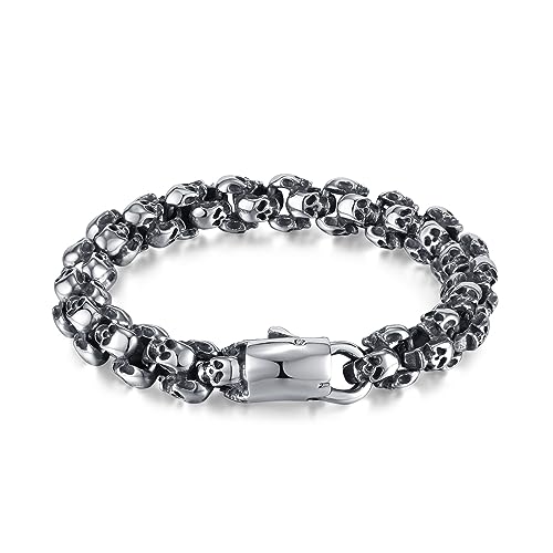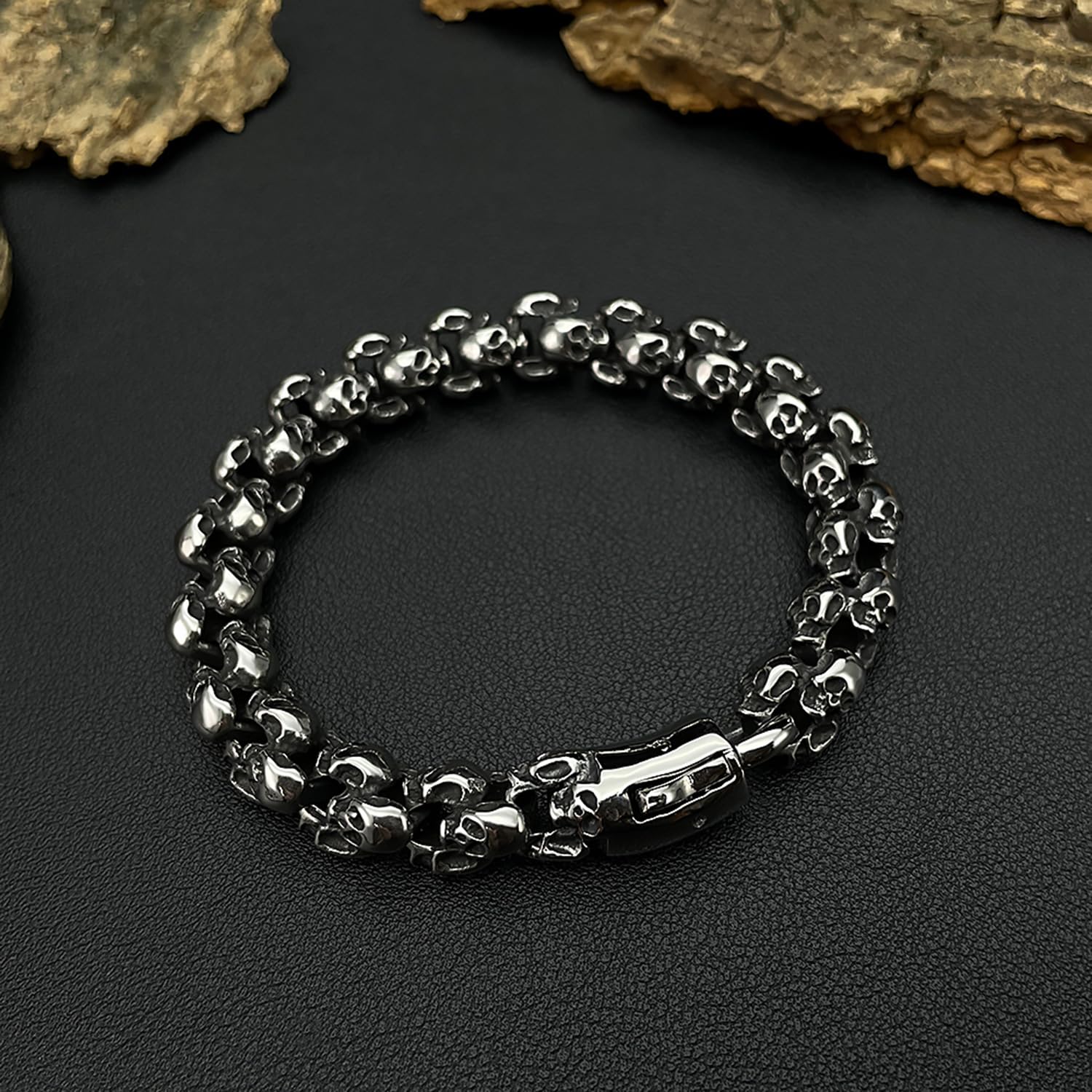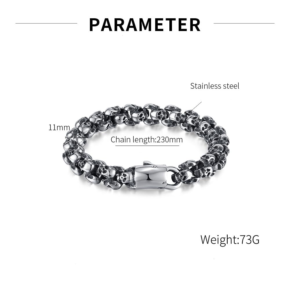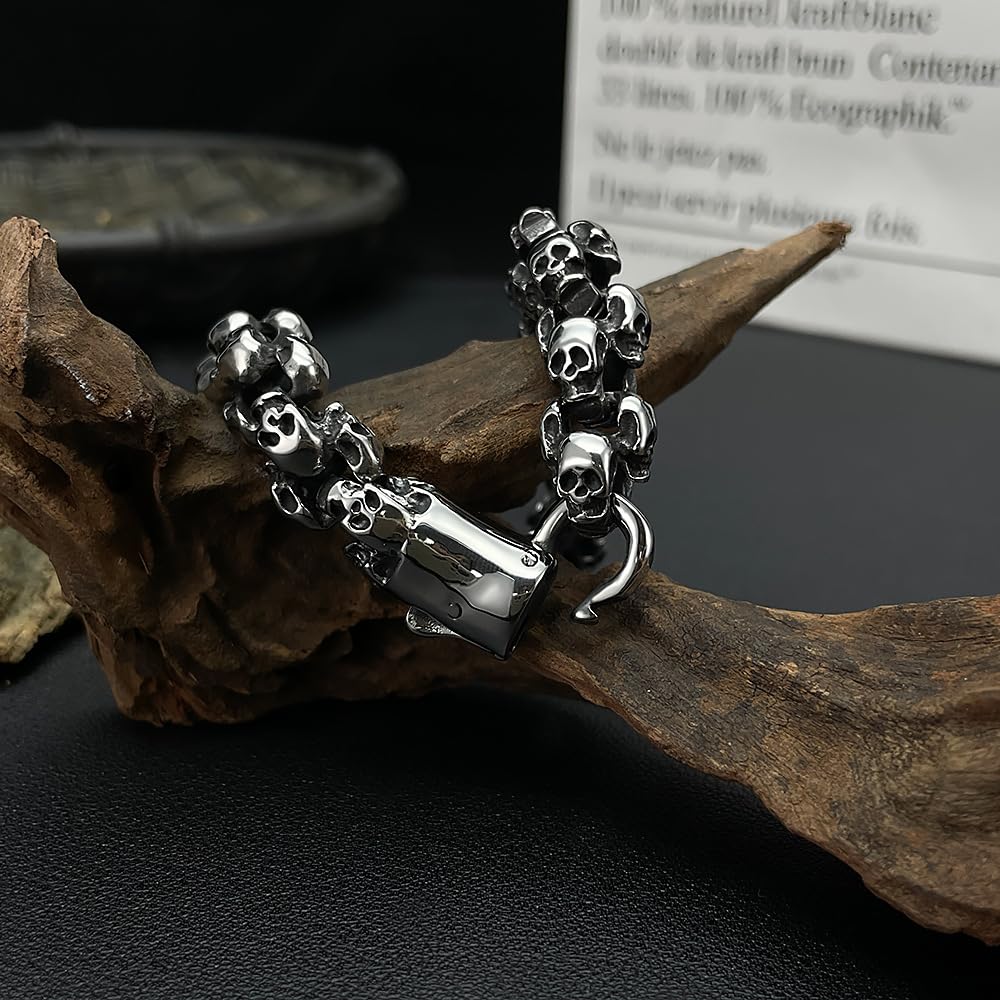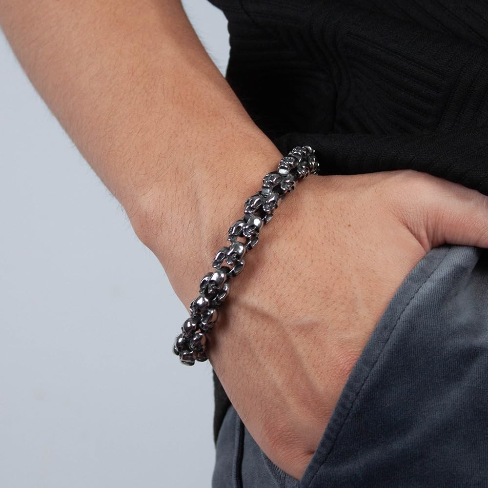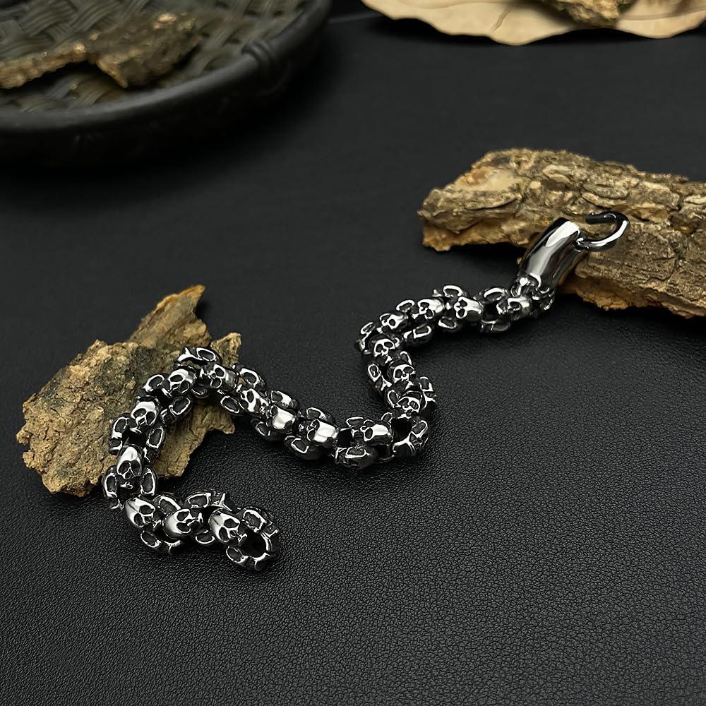 Rockyuのドクロチェーンブレスレットは、まさに“男の無骨さと個性”を表現する一本。緻密にデザインされたスカルモチーフが手元に重厚な存在感を与え、あなたのスタイルにロックでダークなエッジをプラスします。