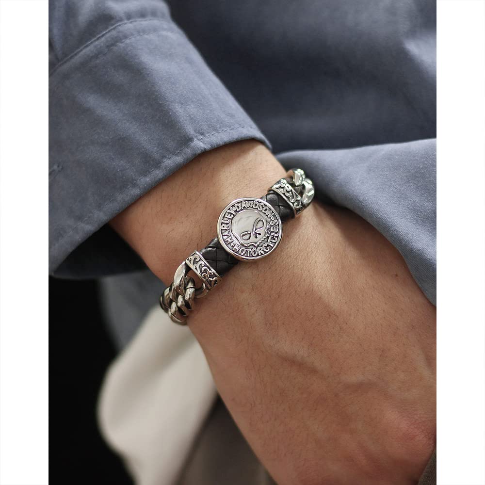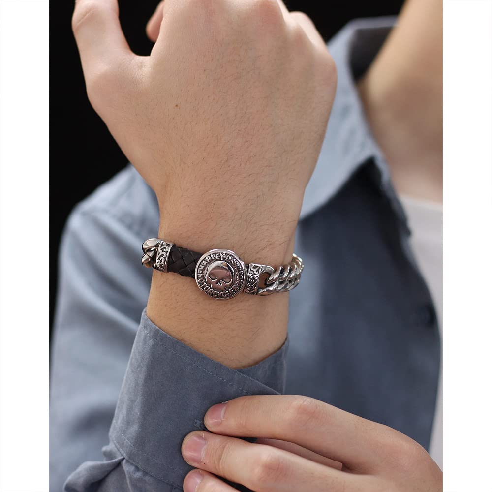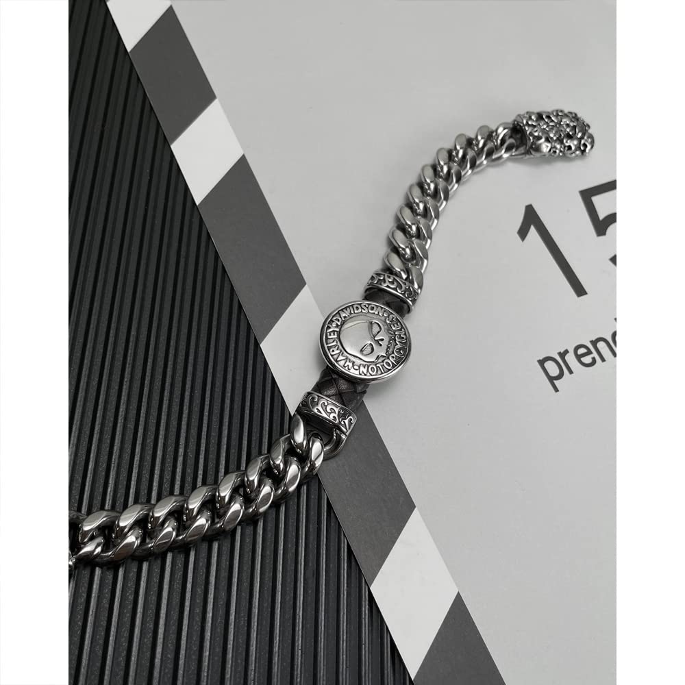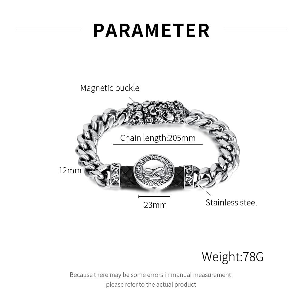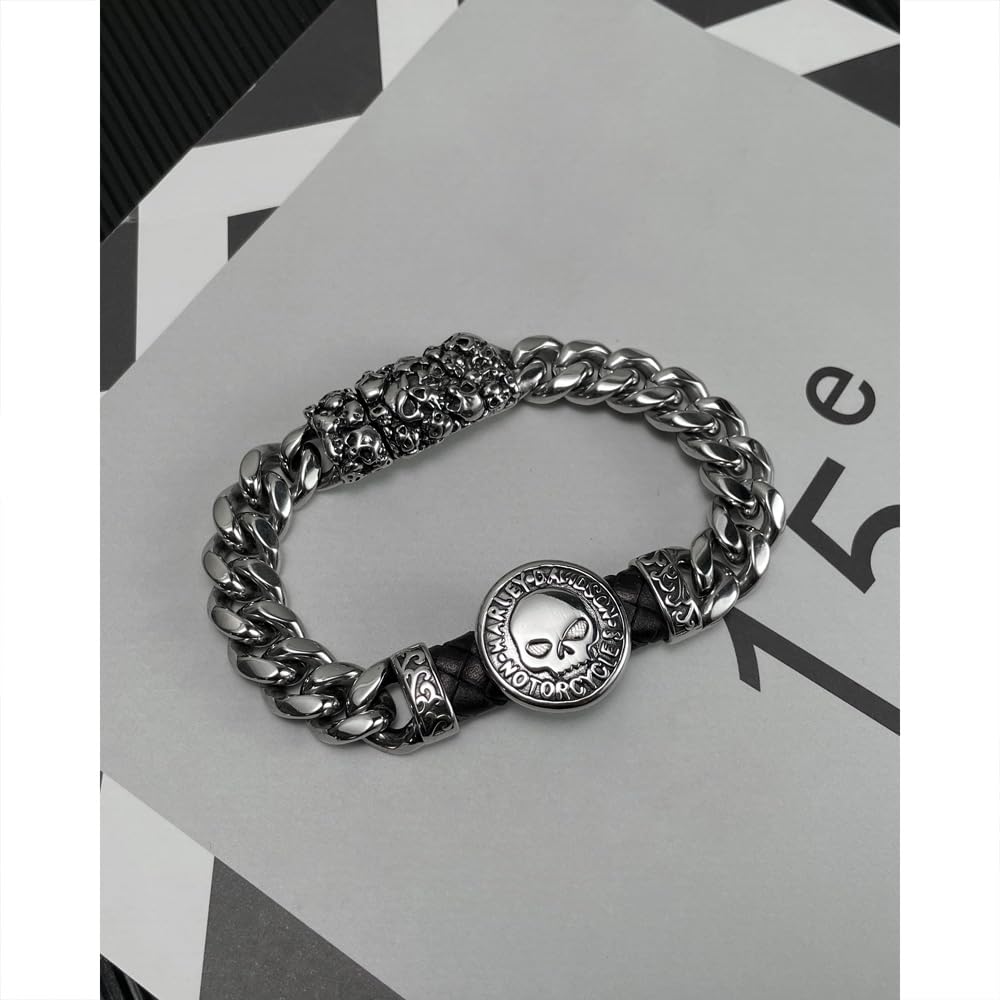 Rockyuが放つ、存在感抜群のスカルブレスレット。重厚な喜平チェーンに、鋭い視線を放つ髑髏モチーフとコインデザインを組み合わせたクールな逸品です。留め具には磁気仕様を採用し、ワンタッチで簡単に着脱可能。ステンレス製で金属アレルギーにも配慮し、日常使いからバイカースタイル、ヒップホップファッションまで幅広くマッチします。全長215mm、しっかりとした太さと重量感(74g)があり、男らしさを一層引き立てます。Rockyuのスカルブレスで、あなたの手元に無骨でスタイリッシュな存在感を。
