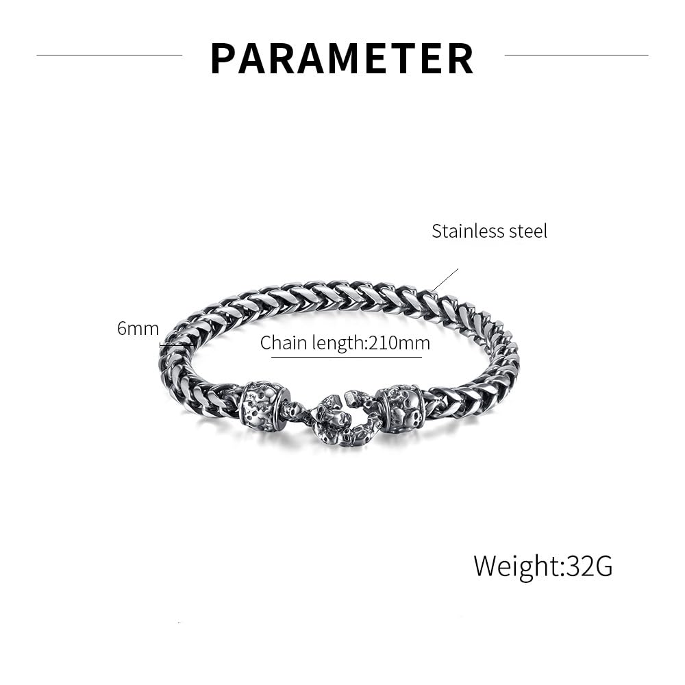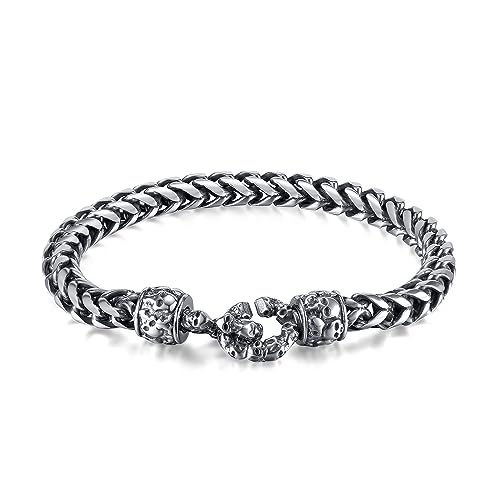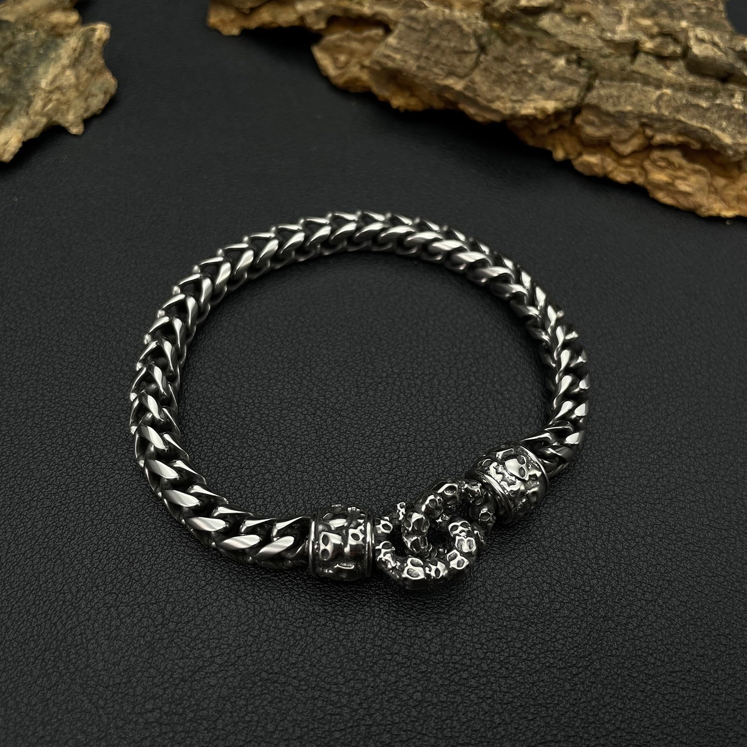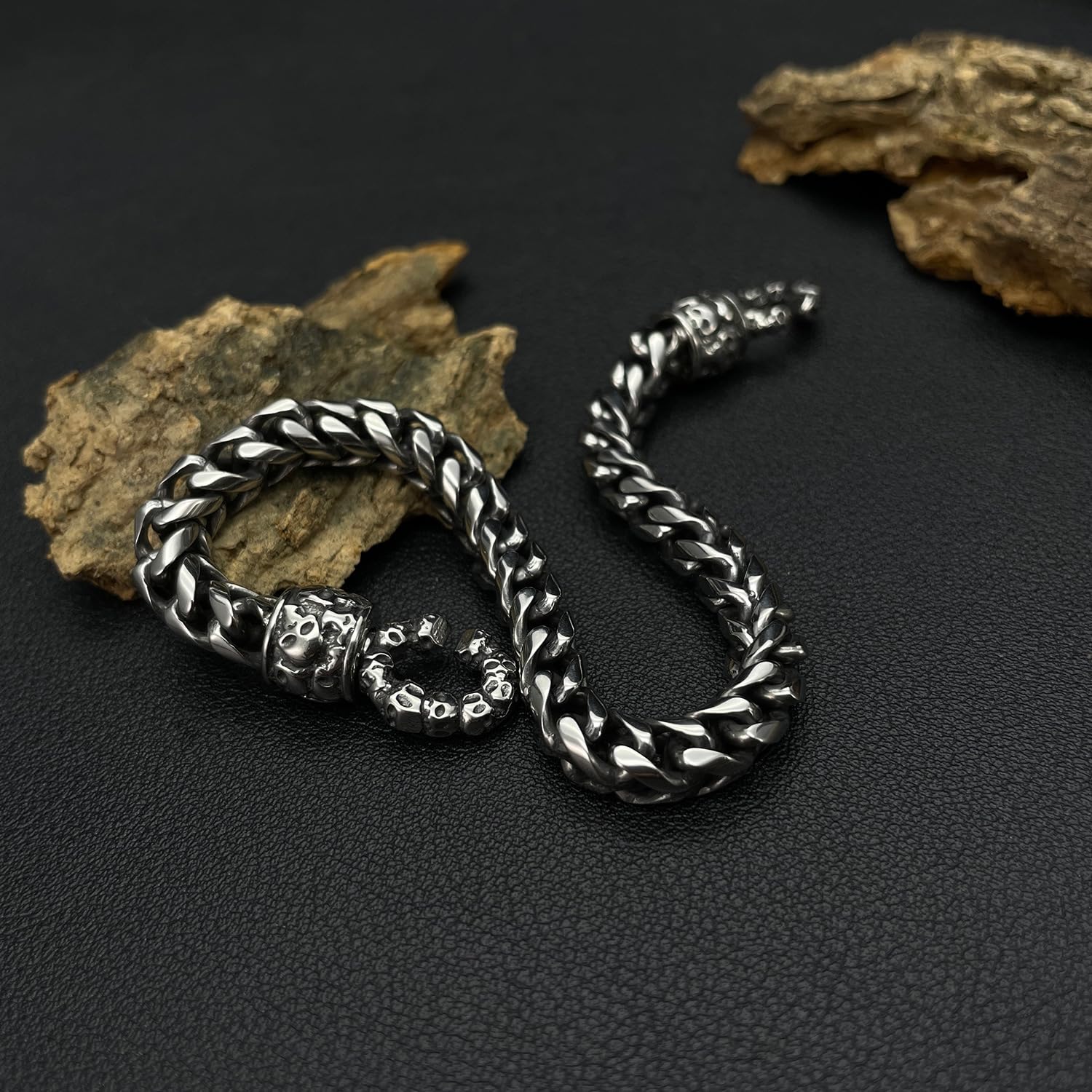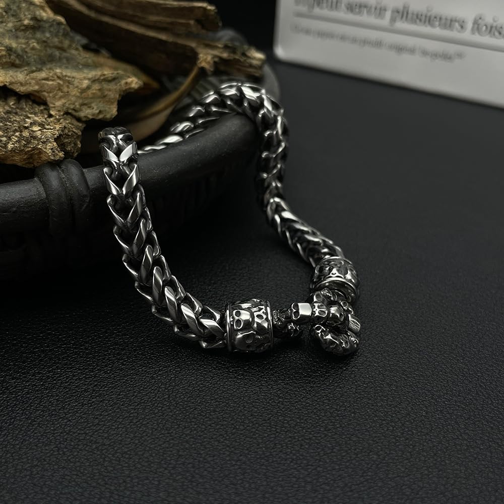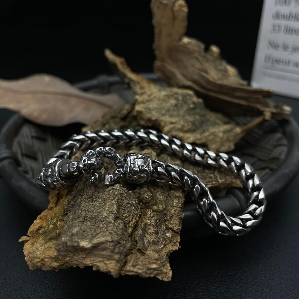 Rockyuが贈る、無骨さと精巧さを兼ね備えたスカルチェーンブレスレット。両端に刻まれた髑髏モチーフがインパクト抜群で、見る者を引きつける存在感。全体にレトロ調のシルバーフィニッシュを施し、無骨ながらも洗練された男の美学を表現します。