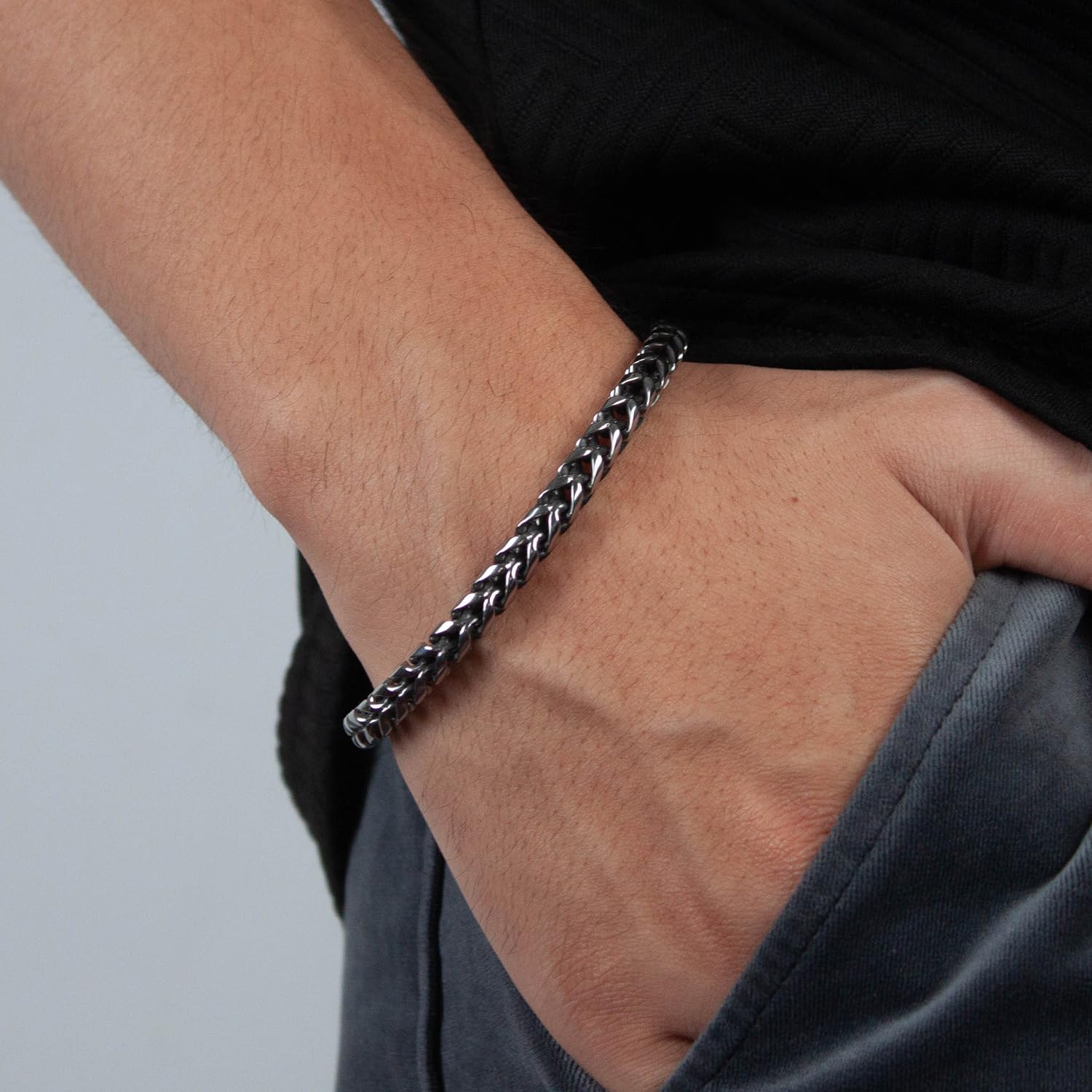 210mmの絶妙な長さと、6mm幅のチェーンが手首にしっかりフィット。ステンレス製だから丈夫で錆びにくく、さらに金属アレルギーにも対応しているため、デイリーにもイベントにも安心して着用できます。重量は32gと適度な重厚感で、手元にズシリとした“存在”を演出。