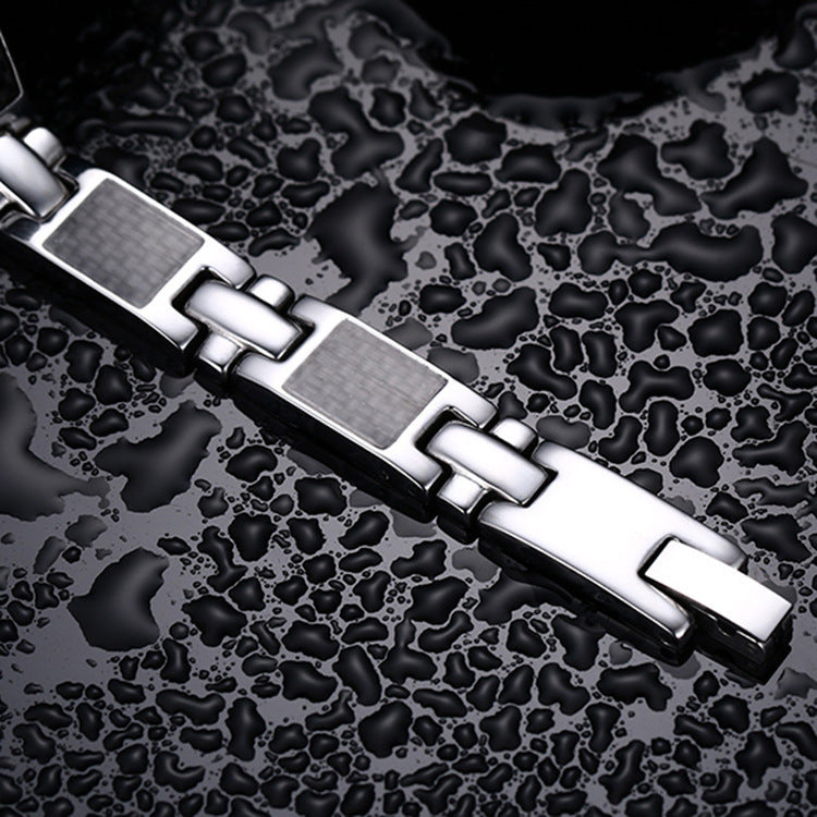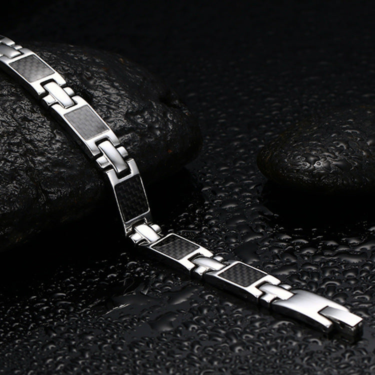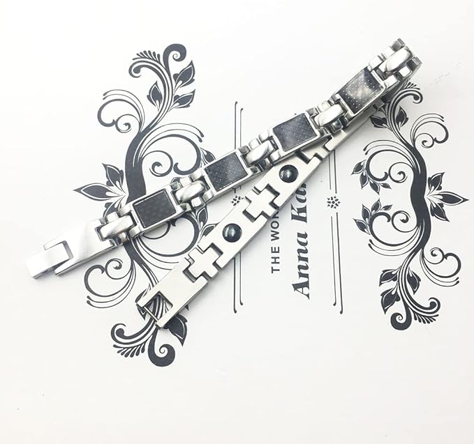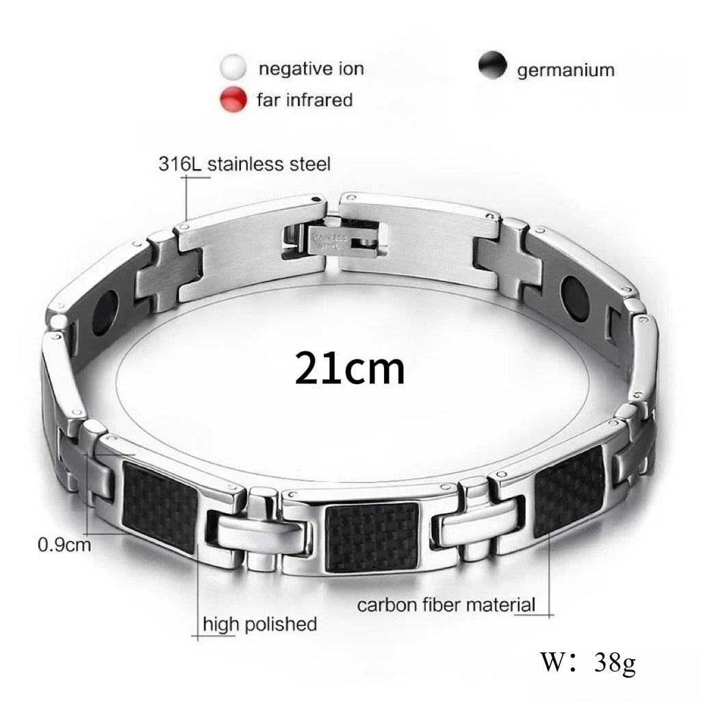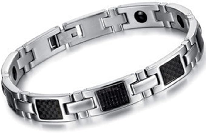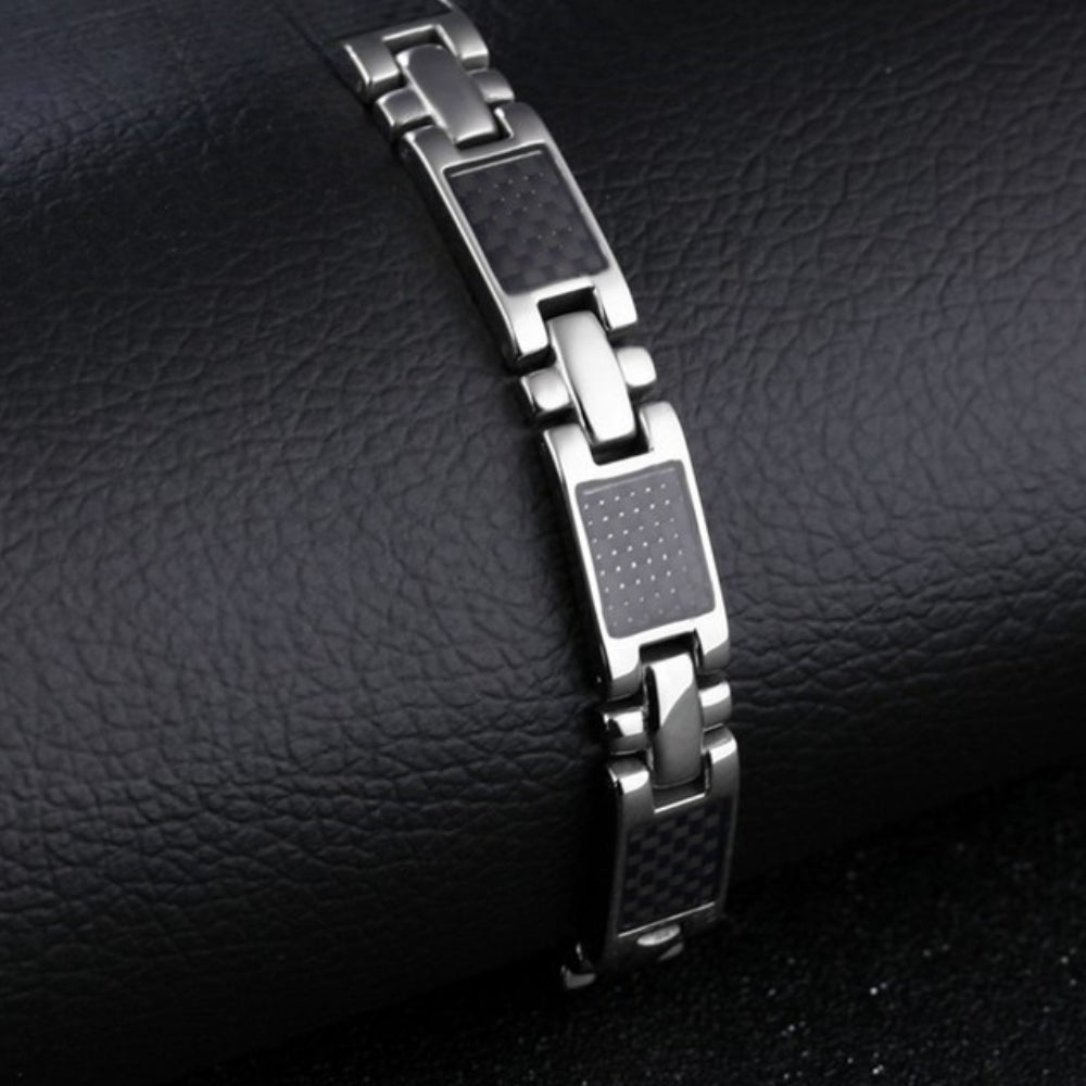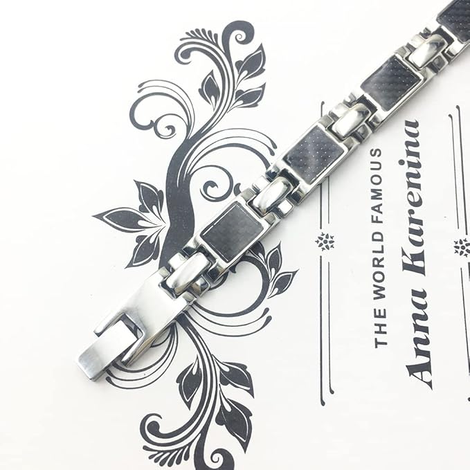 Rockyu のブレスレットは、スタイリッシュなシルバー×ブラックのコントラストが際立つモダンなデザイン。カーボン調のパネルをアクセントに取り入れ、シャープで都会的な印象を演出します。