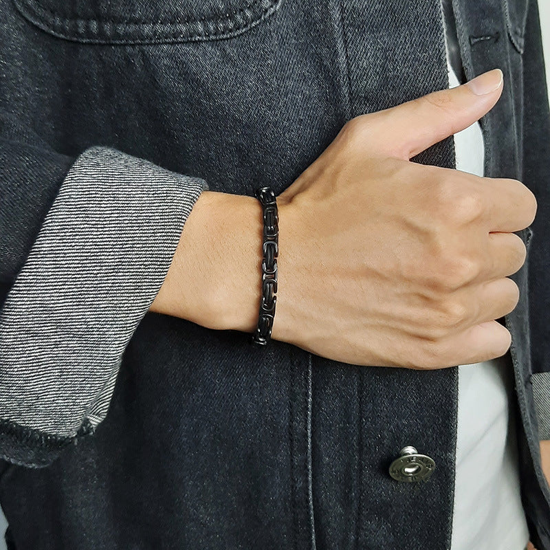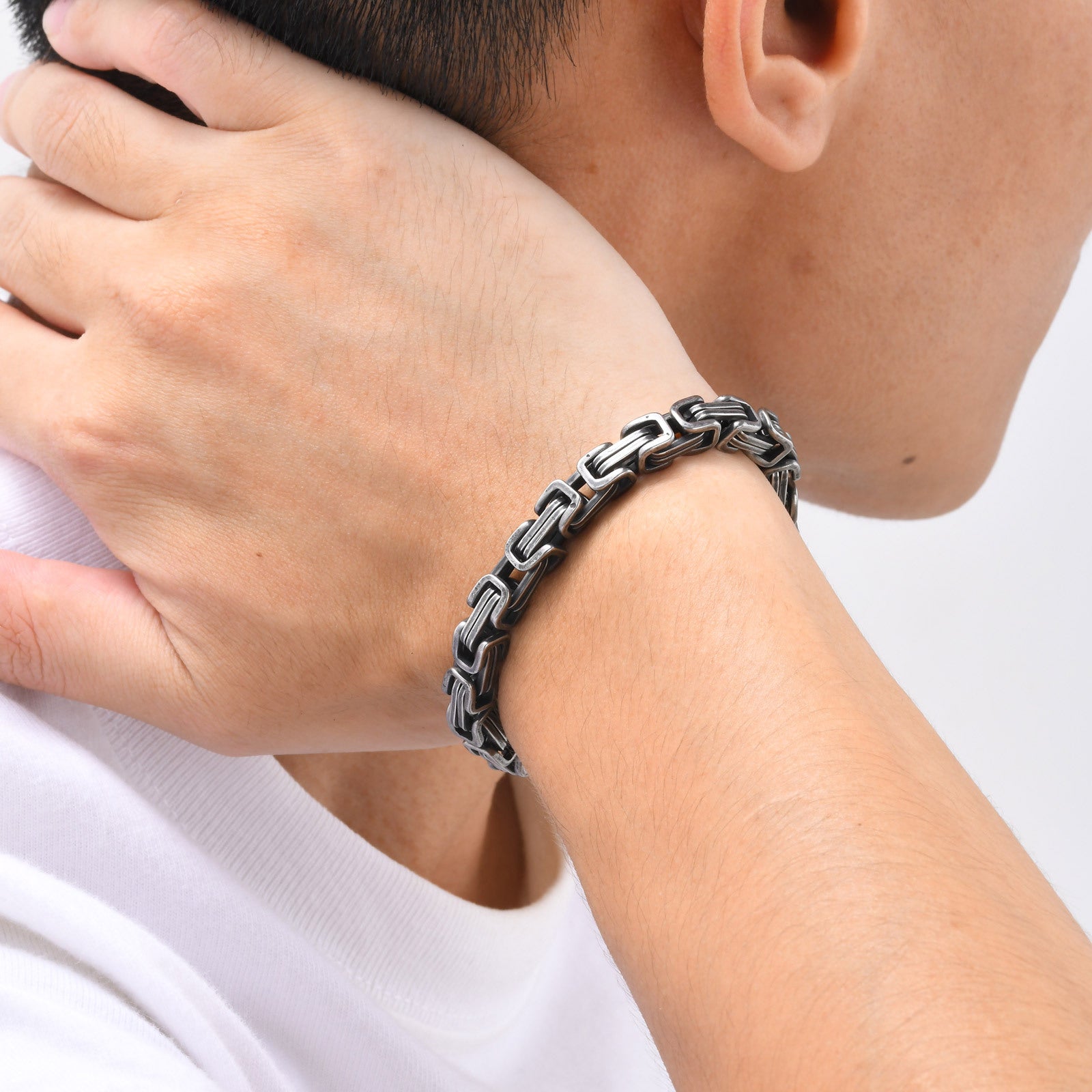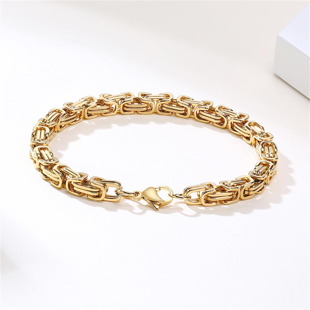 重厚感と存在感を手首に。Rockyuのビザンチンチェーンブレスレットは、精緻に組まれたスクエアリンクが織り成す力強いデザインが特徴です。幅6mmの程よいボリューム感で、ブラック・シルバー・ゴールドの3色展開。ステンレス素材にハイポリッシュ加工を施し、傷や変色に強く、金属アレルギーにも配慮。全長21cmの使いやすいサイズで、普段使いからパーティーシーンまで幅広く対応します。ヒップホップ風の華やかさをプラスしたいときや、シンプルコーデに重厚なアクセントを加えたいときにも最適。Rockyuならではの洗練されたデザインで、あなたの手元を力強く彩ります。