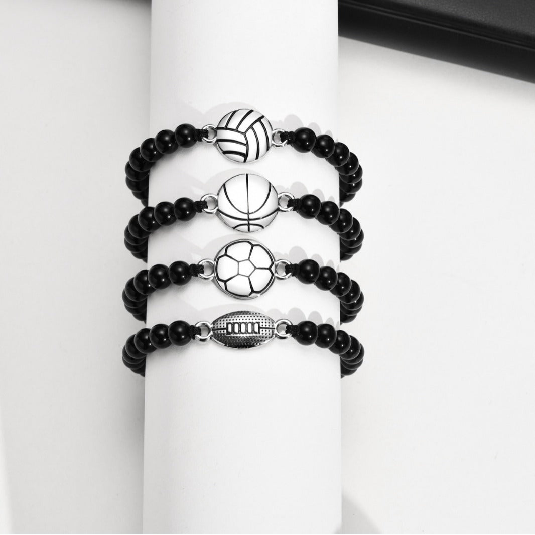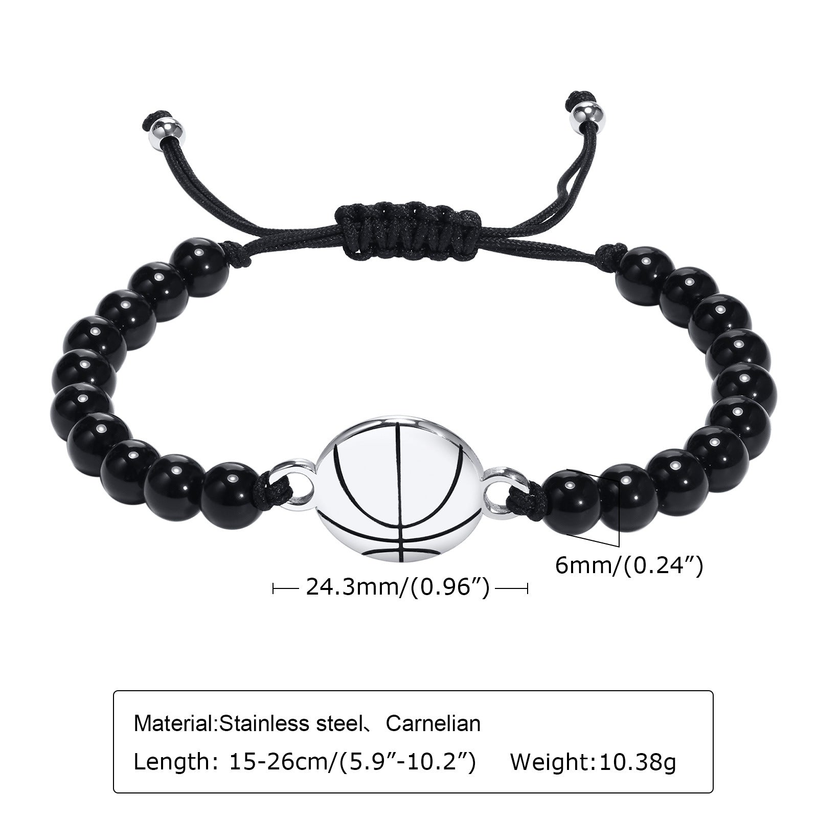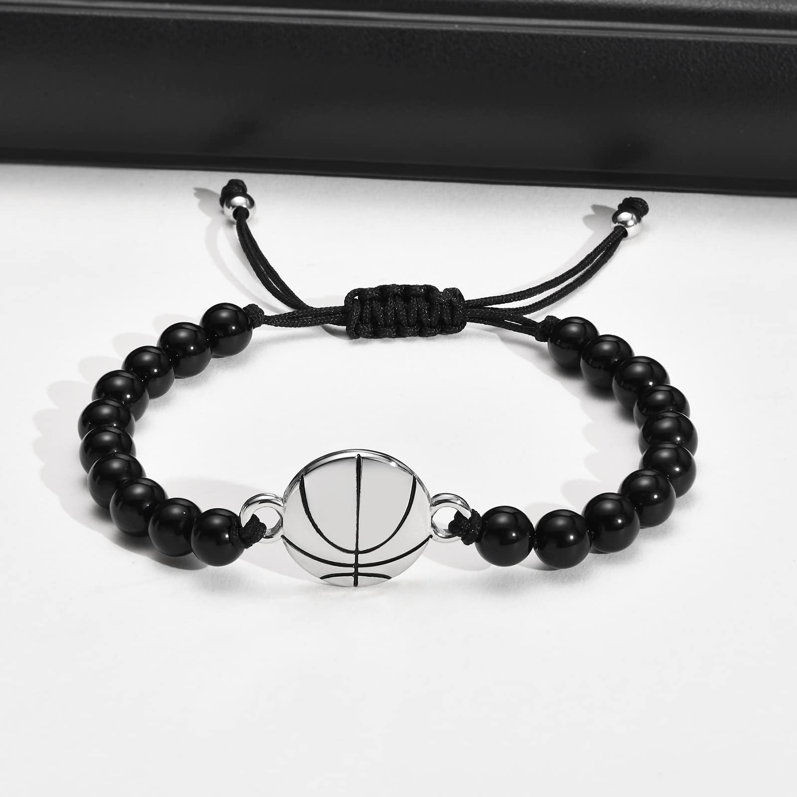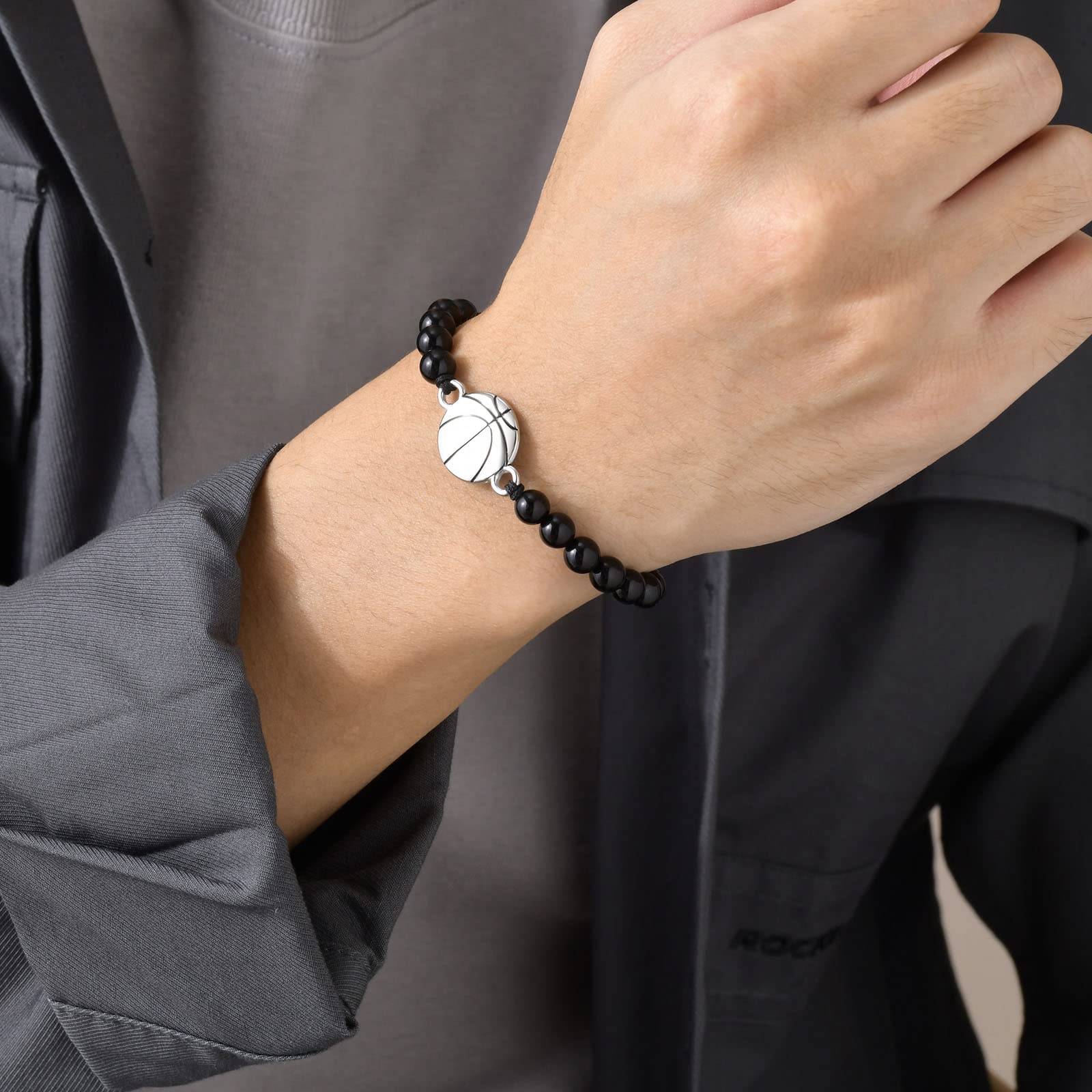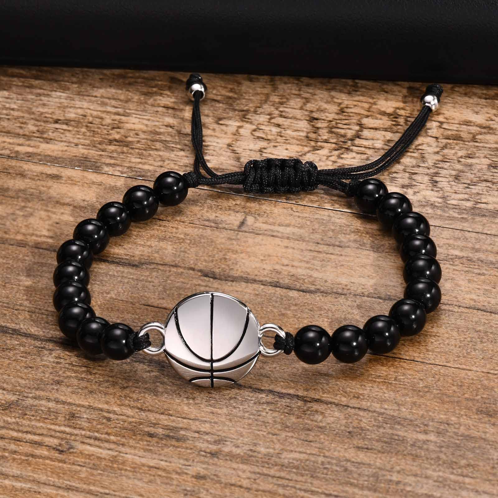 Rockyu メンズブレスレット ブラック瑪瑙 数珠 スポーツモチーフ バスケットボールデザイン 調節可能